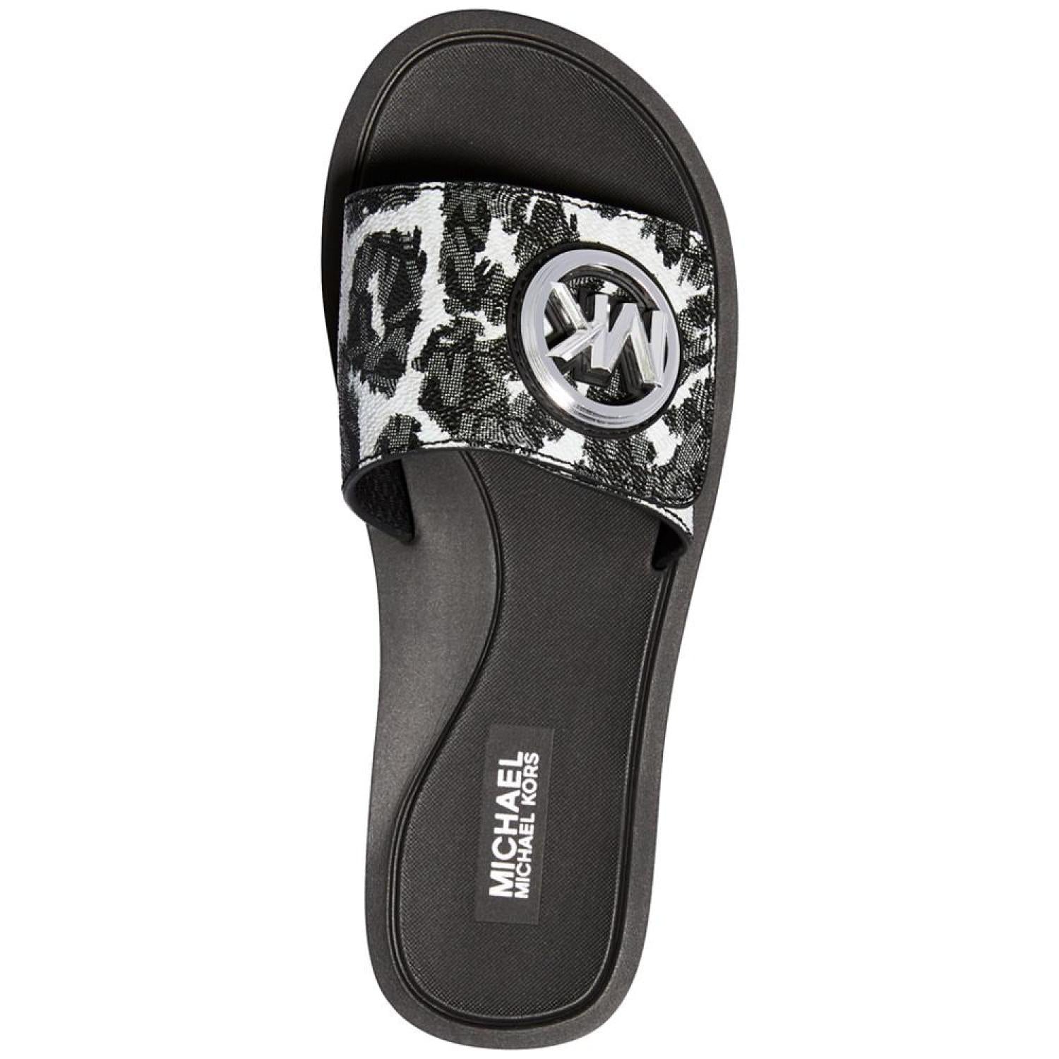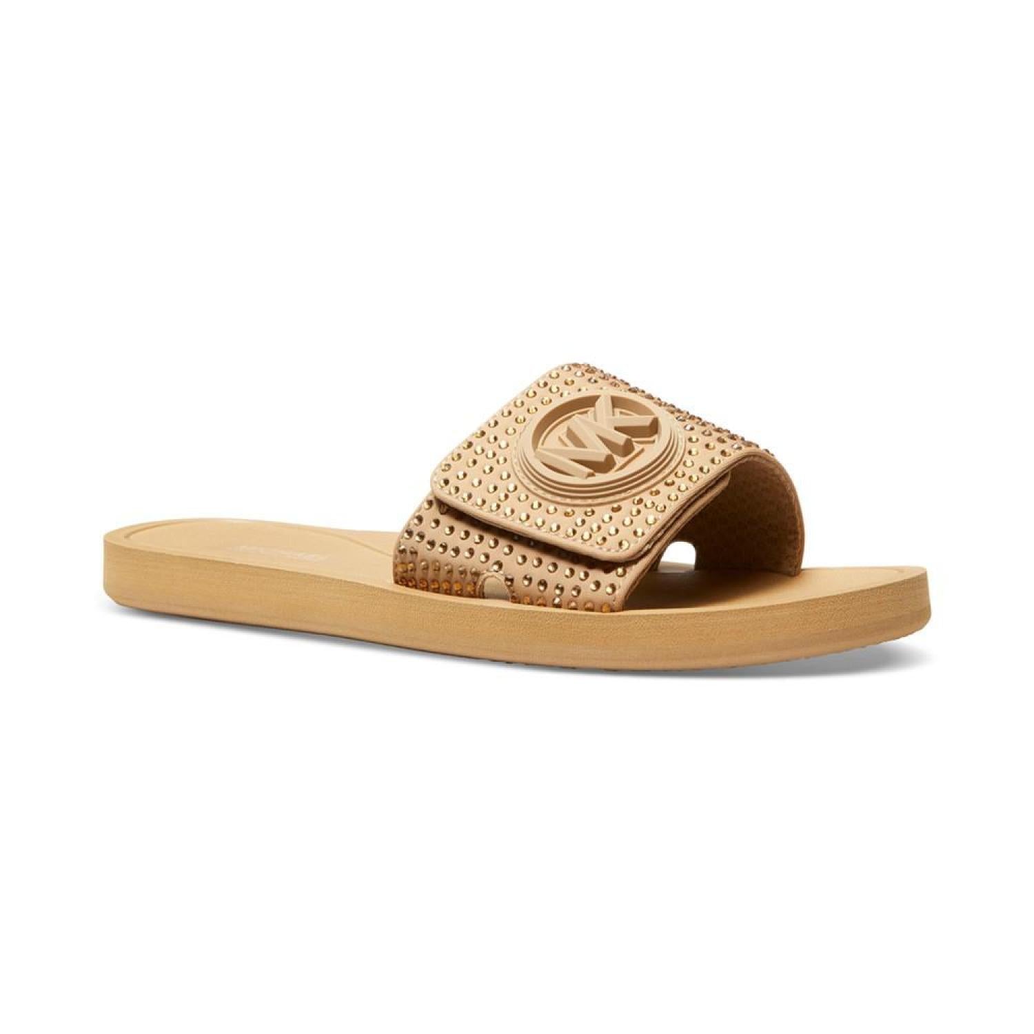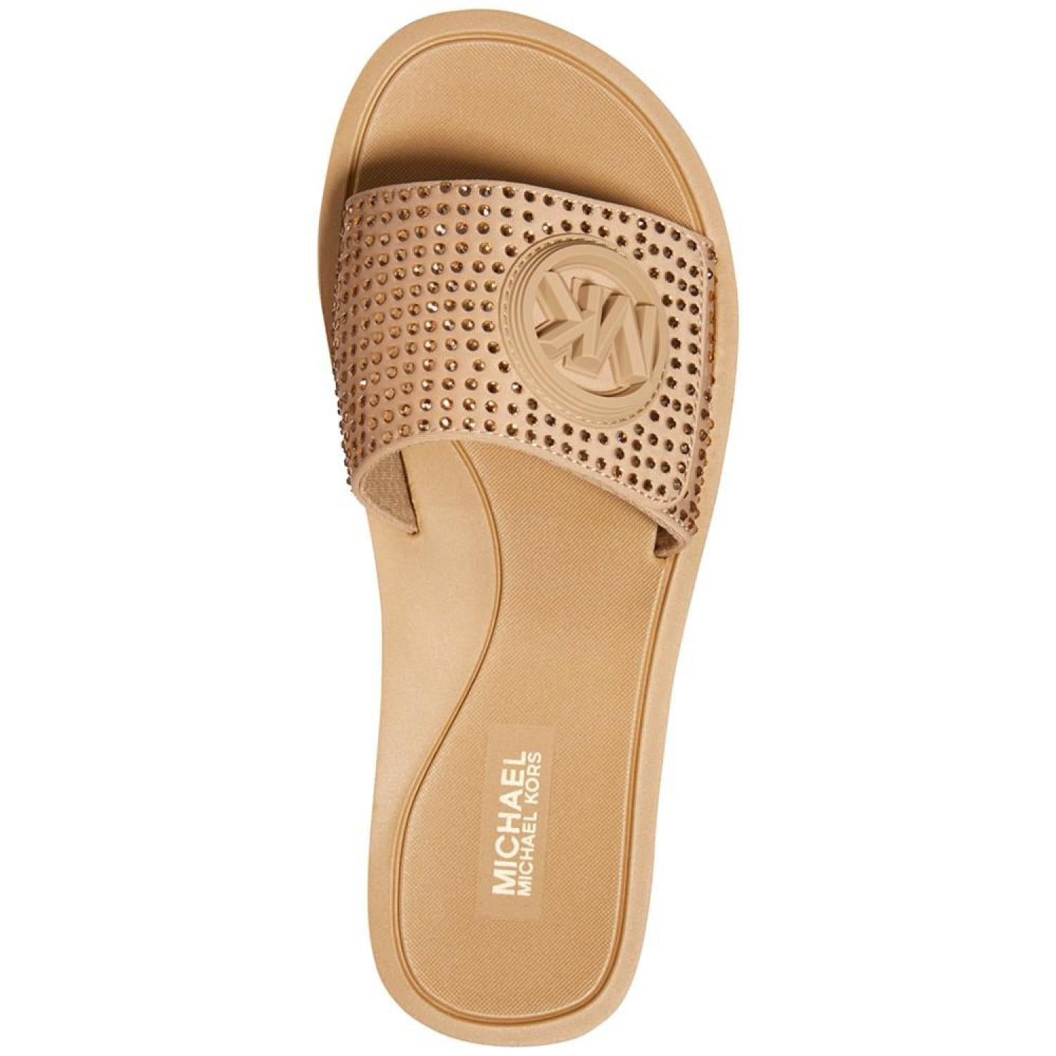 • Signature flash and breezy slide style combine for a go-to warm-weather look from the beach to city shops in the MICHAEL Michael Kors Charm sandals.