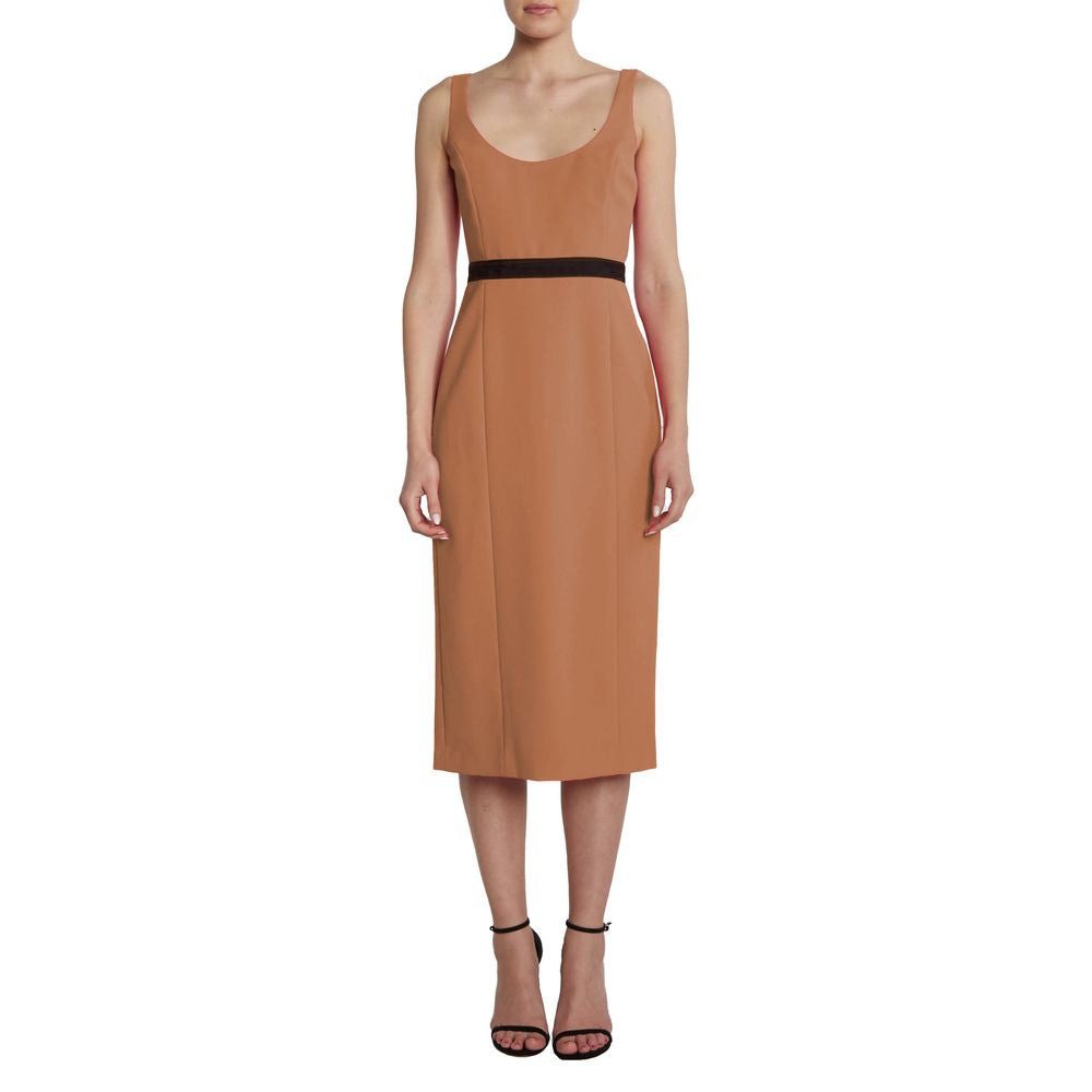Pinko long sleeveless crèpe dress, round neckline at front and back zipper closure, black waistband with ribbon for closure