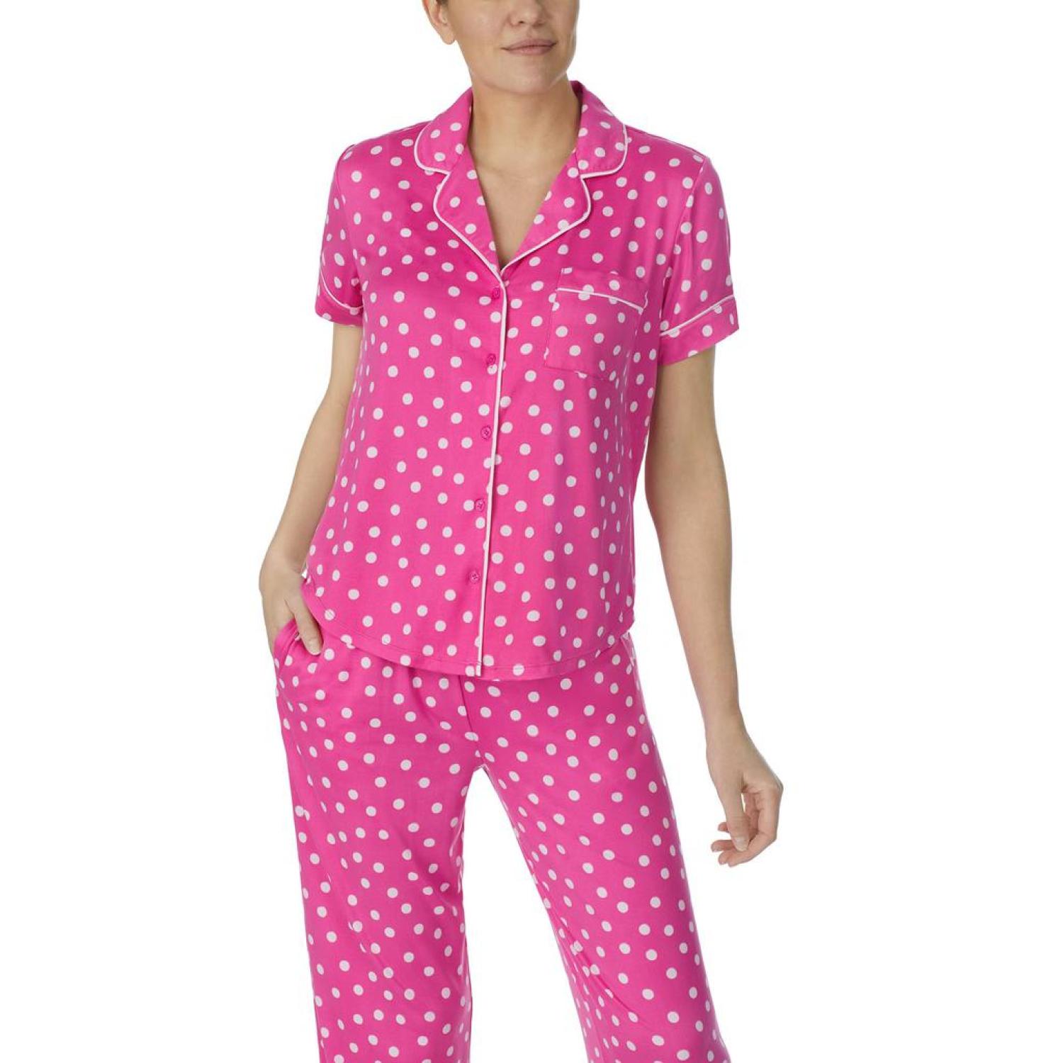 Sleep in comfort all night long or lounge at home on a lazy day by wearing the Kate Spade New York® Short Sleeve Notch Cropped PJ Set. The shirt has a notch collar neckline, short sleeves, a left chest patch pocket, a front button closure, and a straight hem. The top features color-block trim edges. The pull-on style pajama have a straight silhouette with comfortable elasticised waistband for a secure fit.