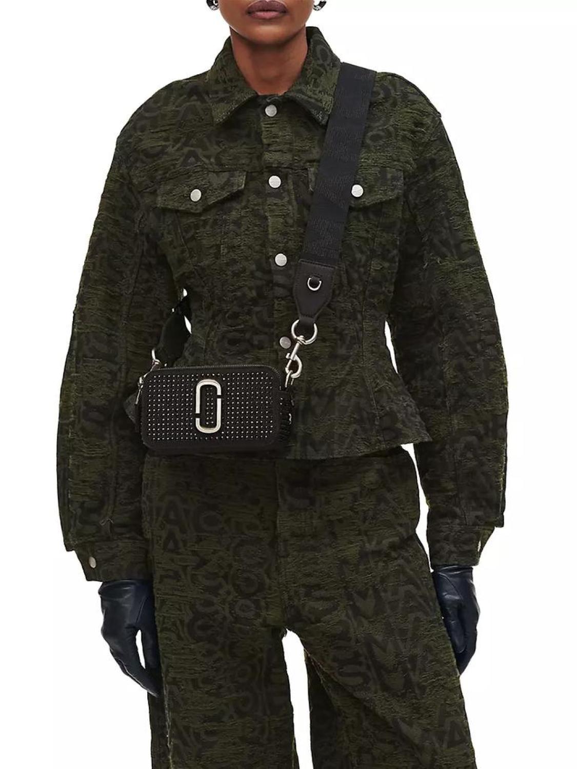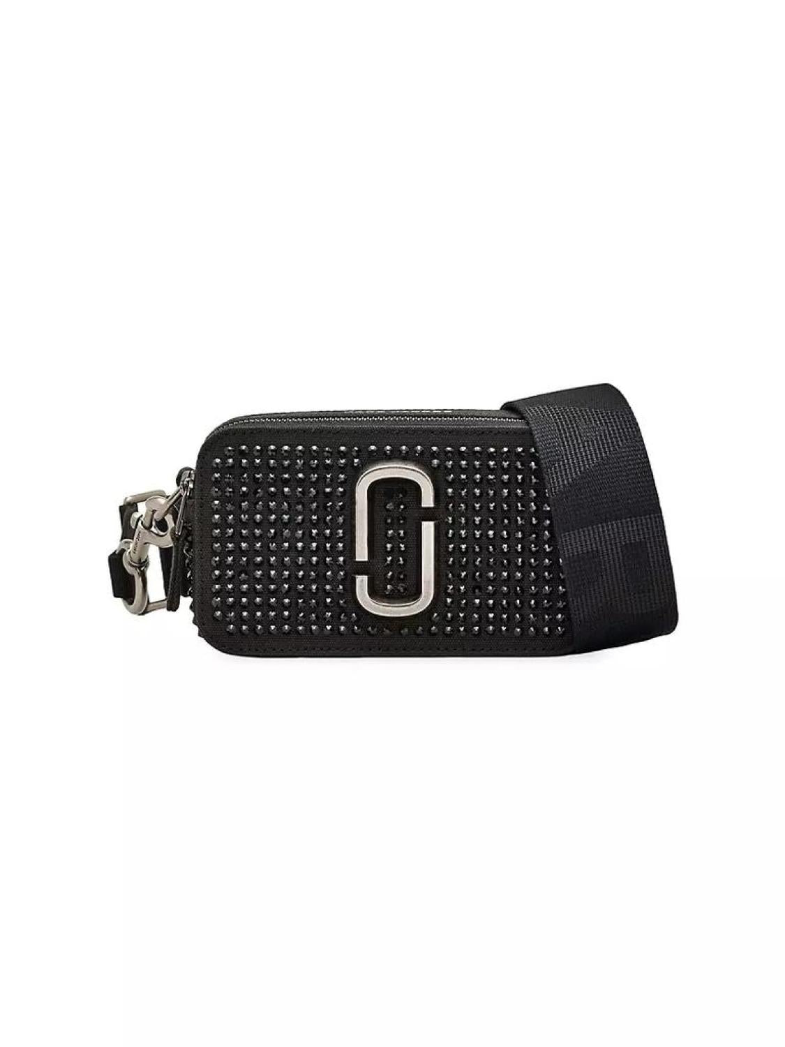 Crafted of crystal-embellished canvas, the Snapshot bag from Marc Jacobs is finished with J Marc hardware and a removable logo webbing strap.
