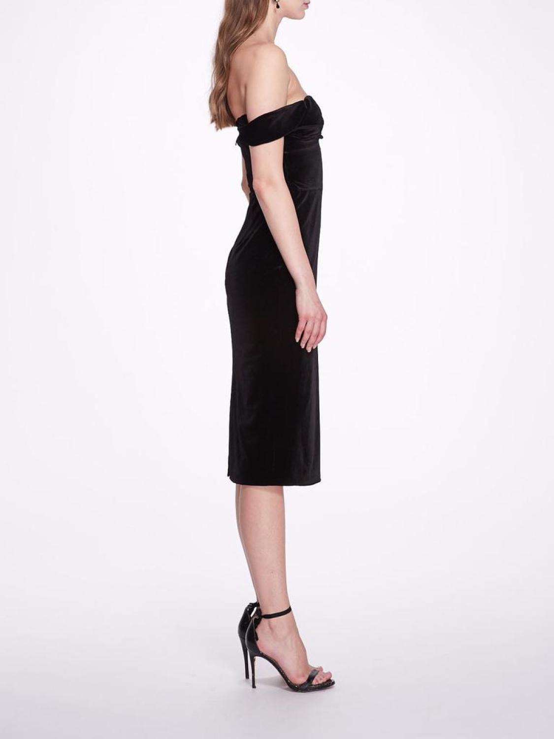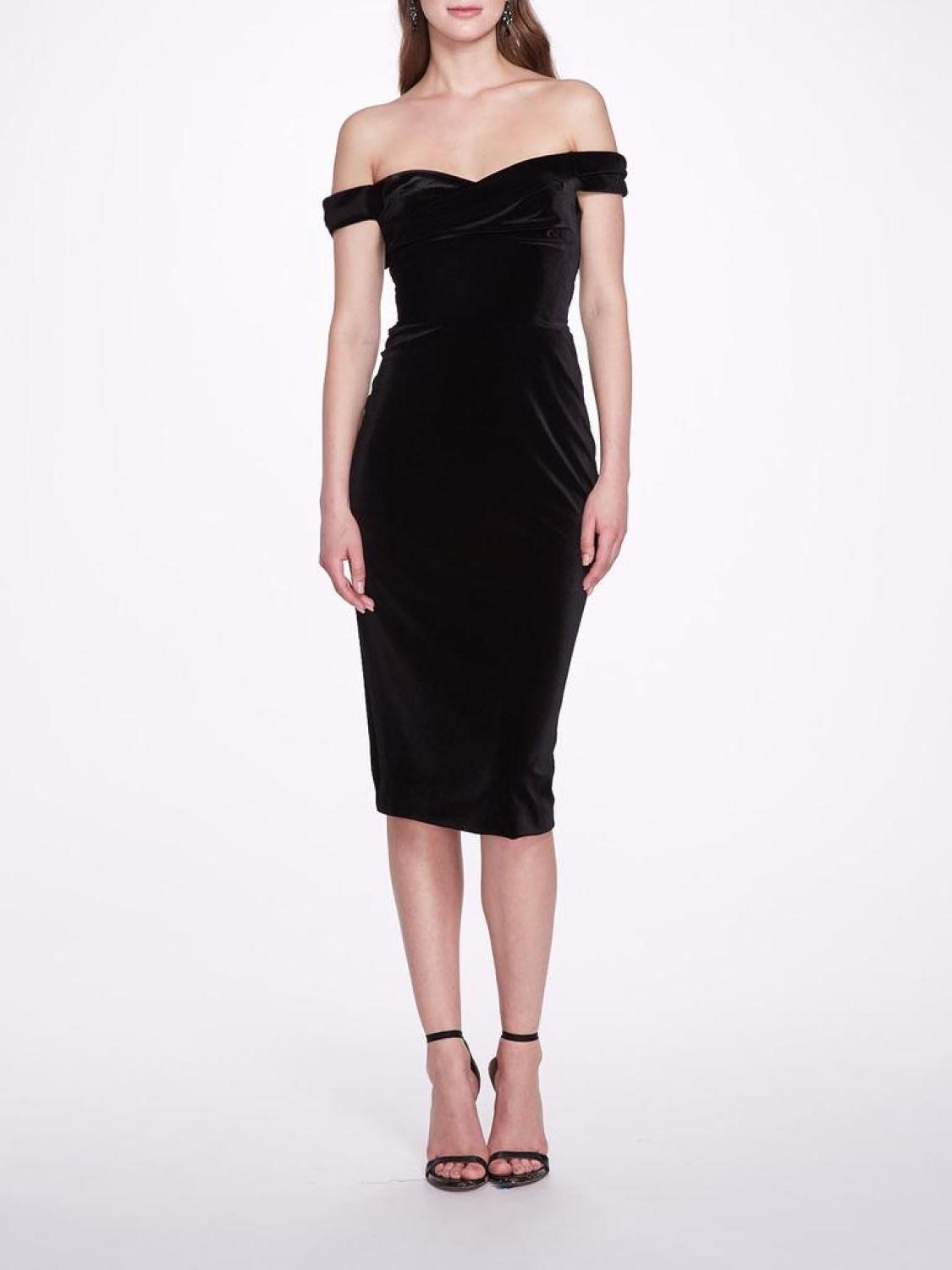 • The definition of charm, this cocktail dress in black features an off-the-shoulder sweetheart neckline, asymmetrically draped bodice, and a velvet pegged skirt. Model is wearing size US 0.
