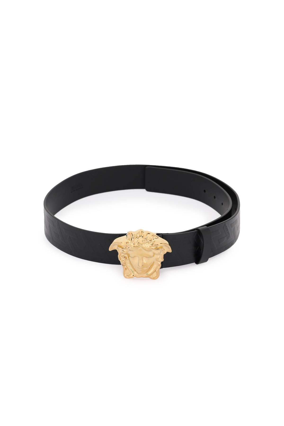 Verace leather belt with Greca motiv all-over and gold metal Medua buckle. The item in photo is size 100. Belt Height = 4 cm,