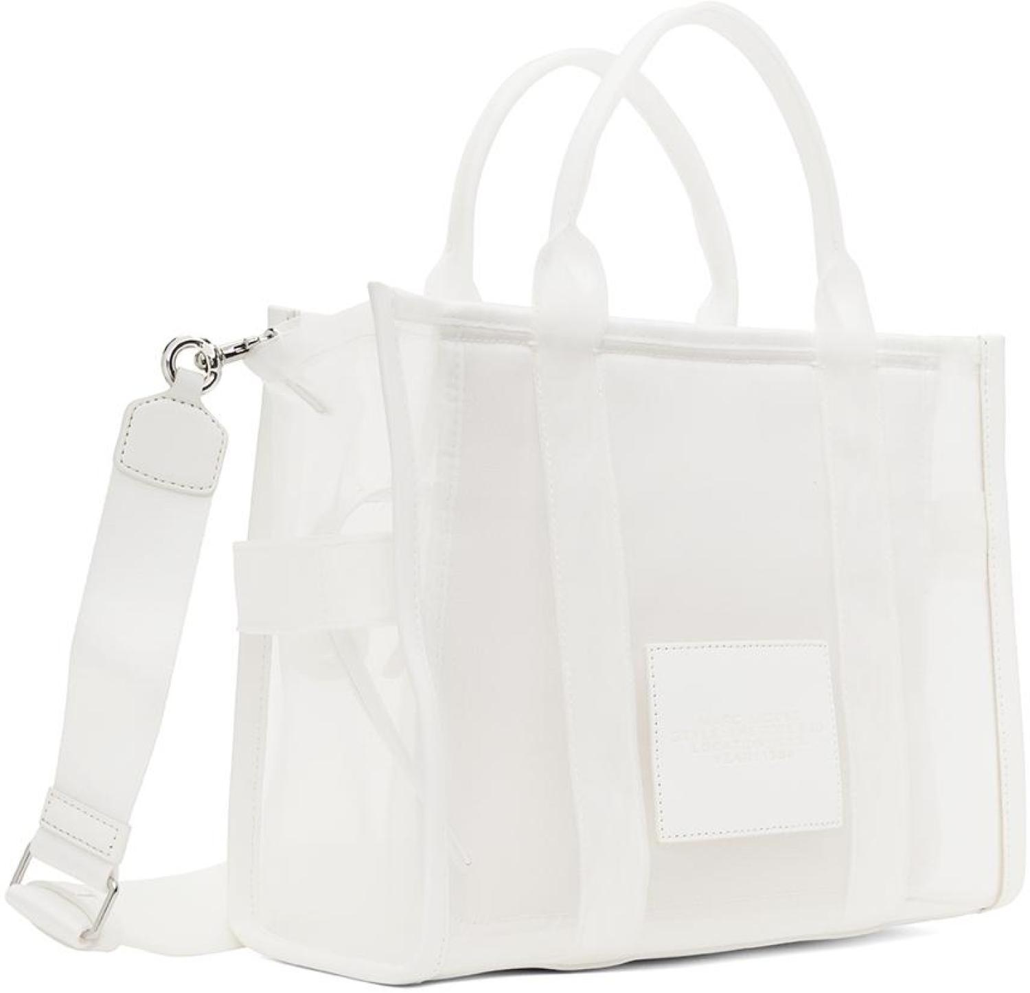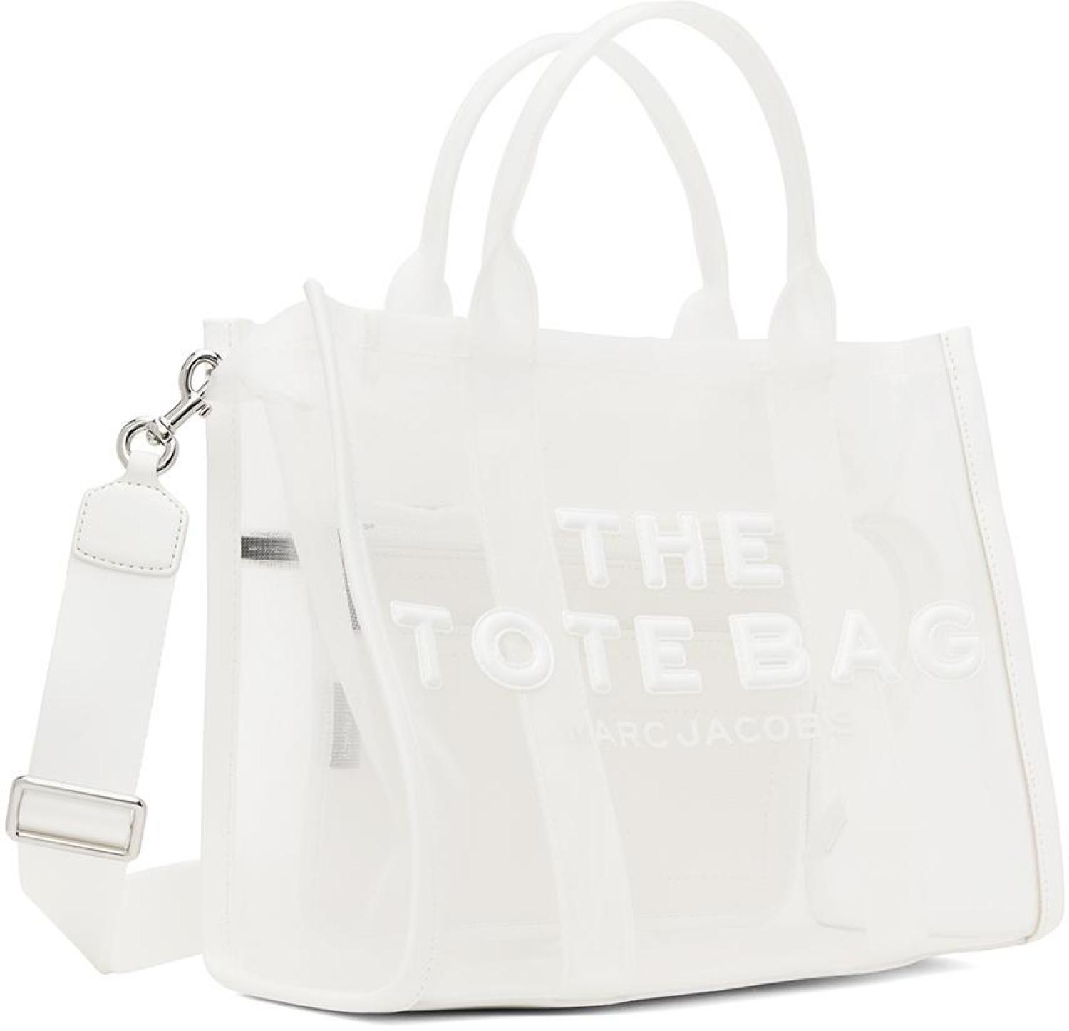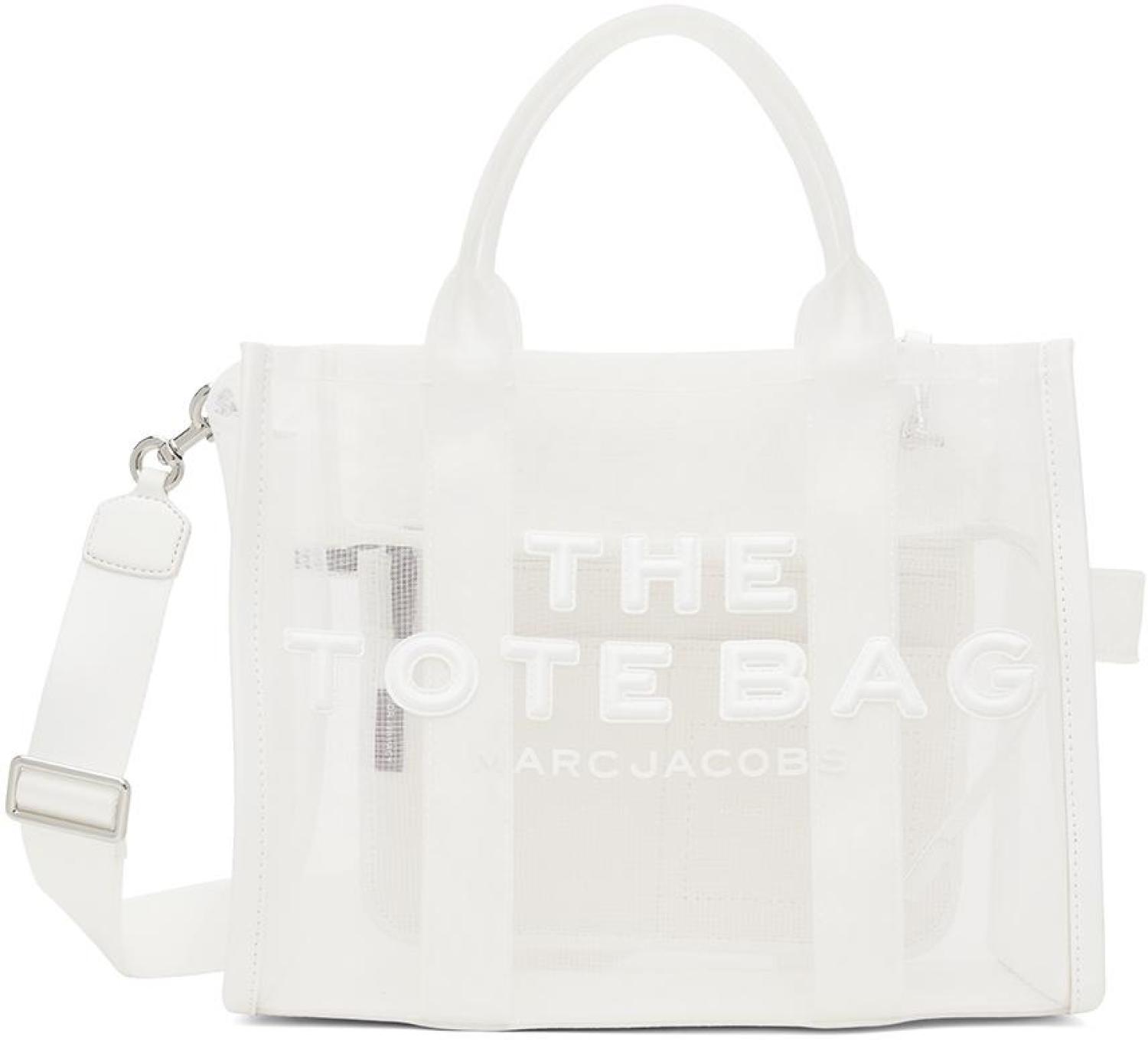 Marc Jacobs White 'The Mesh Medium' Tote Nylon mesh tote in white. · Grained faux-leather trim throughout · Rolled carry handles · Adjustable and detachable crossbody strap · Logo bonded and printed at face · Mesh loop at side · Logo patch at back face · Zip closure · Zip and patch pockets at interior · Unlined · Silver-tone hardware · H10.5" x W12.75" x D6.25" Supplier color: White Body: 100% nylon. Trim: 54% polyurethane, 46% terylene. Made in Viet Nam. 241190F049125