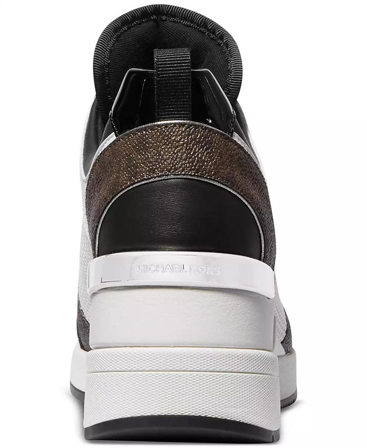 A mix of textures and tones is finished with shiny signature accents on the Georgie trainer sneakers from MICHAEL Michael Kors. Wedge heel: 2-3/4" Almond toe Lace up Mixed-media design; logo at tongue; back heel tab; signature heel rand Upper: mesh fabric/leather/patent leather; lining: cotton; sole: rubber Imported