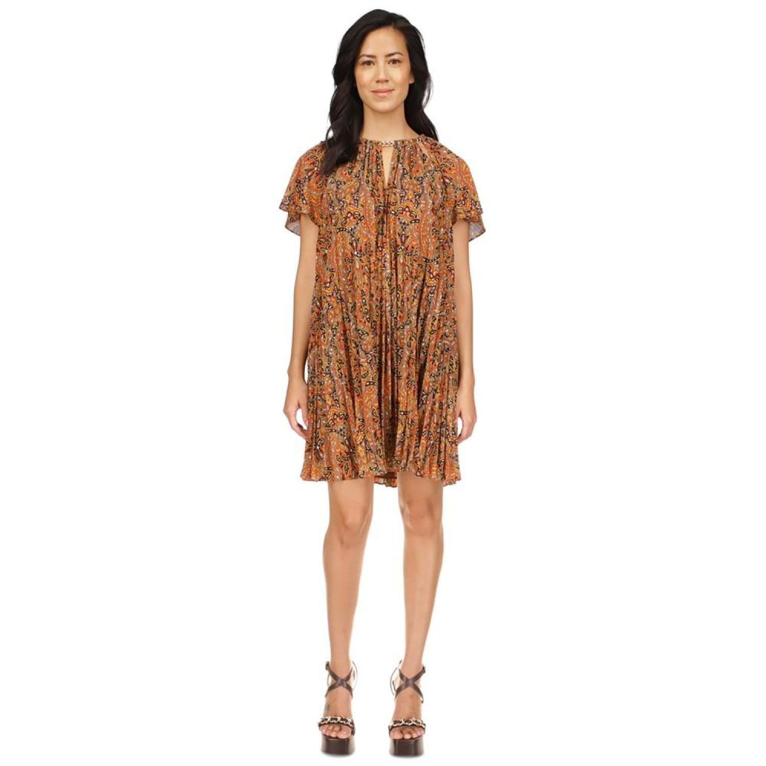 Fun and floaty, this vibrant paisley tent dress from MICHAEL Michael Kors is polished with a chunky chain and allover pleats. Model is wearing a size extra-small Approx. 35-1/2" long from center back neck to hem Crewneck with cutout and chain Hook and clasp closure at back neck Allover pleats XS=0-2, S=2-4, M=6-8, L=10-12, XL=14-16 Lined Shell, lining: polyester Machine wash Imported