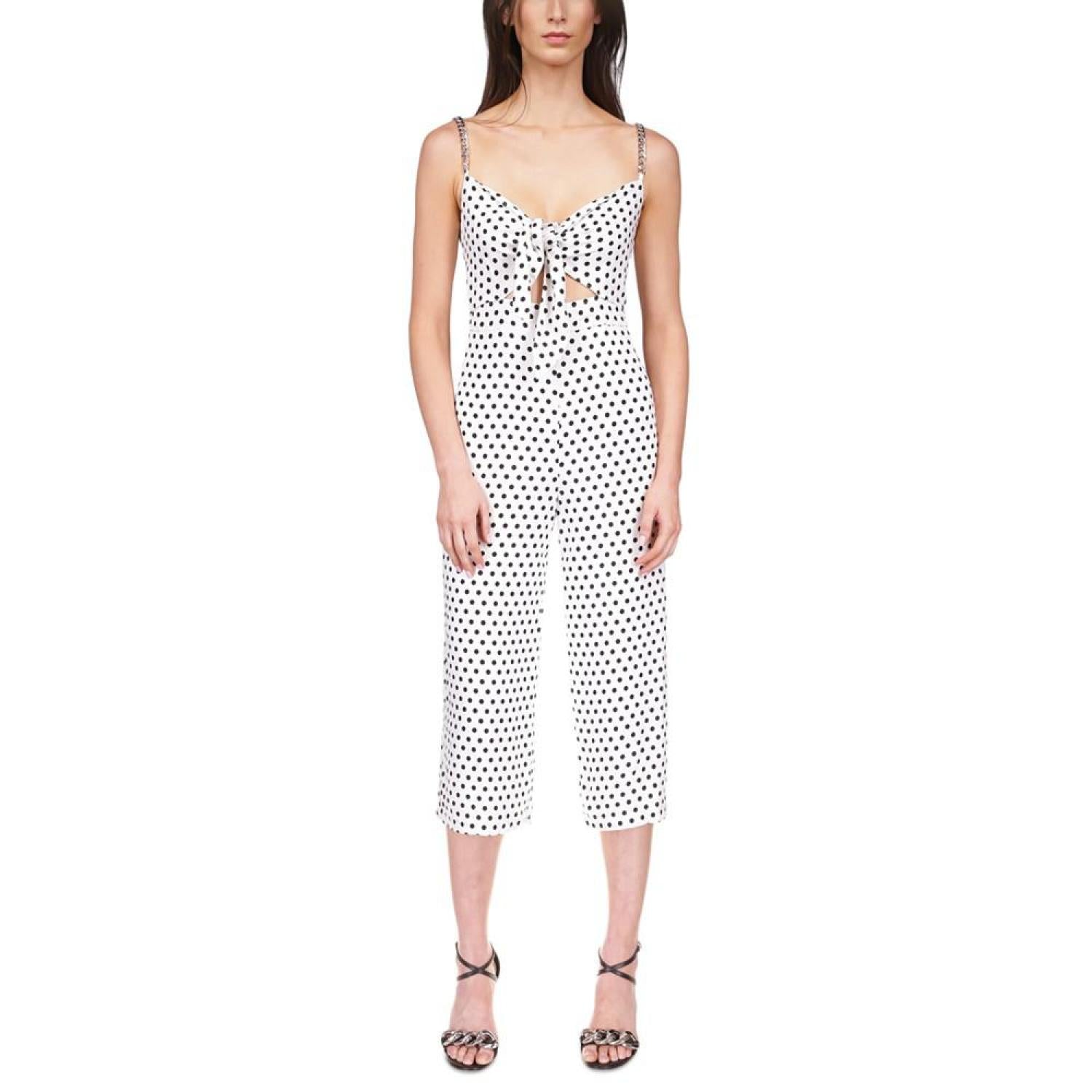 Walk in confidence knowing how chic you look in this sleeveless jumpsuit from MICHAEL Michael Kors. Approx. inseam: 23" Approx. front rise: 15-1/4"; back rise: 19" Sweetheart neck; self-tie closure at bust Allover polka-dot print; cutouts under bust; metallic straps Sleeveless Viscose; lining: polyester Hand wash or dry clean Imported
