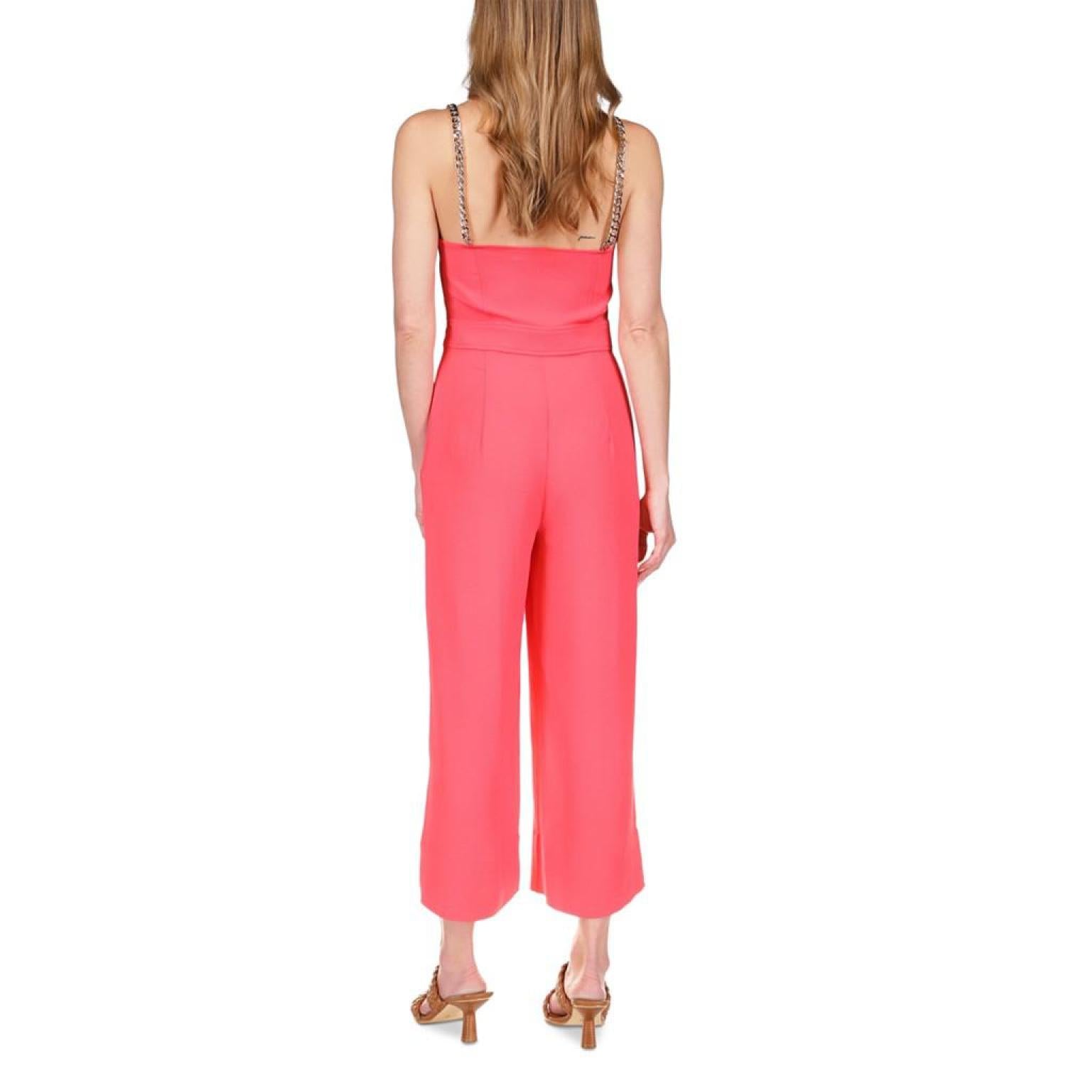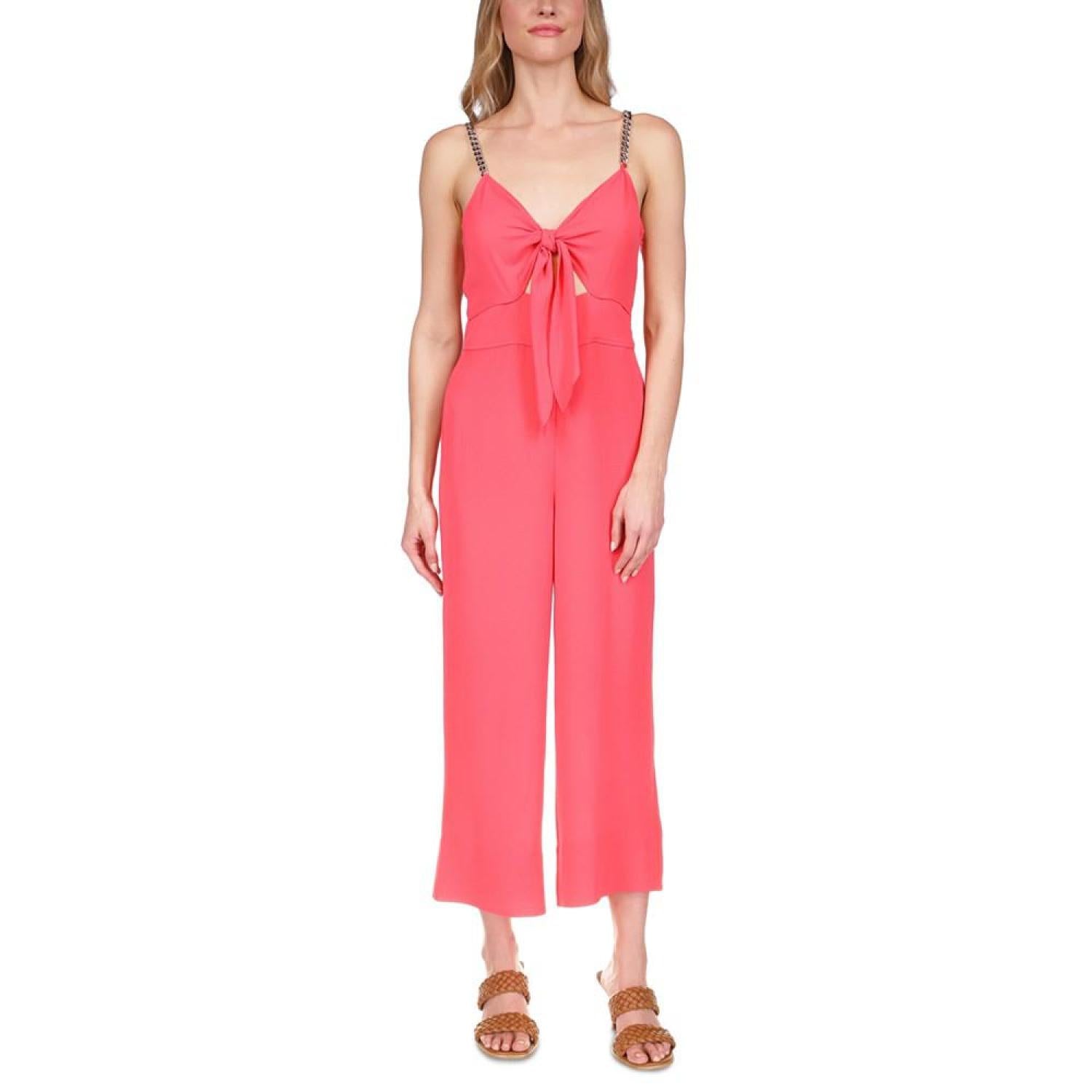 MICHAEL Michael Kors elevates this jumpsuit with stylish cutouts, a flattering sweetheart neckline, and metallic straps. Approx. inseam: 23" Approx. front rise: 15-1/4"; back rise: 19" Sweetheart neck; self-tie closure at bust Cut-out detail under bust Sleeveless Polyester/elastane; lining: polyester (55% recycled) Machine washable Imported