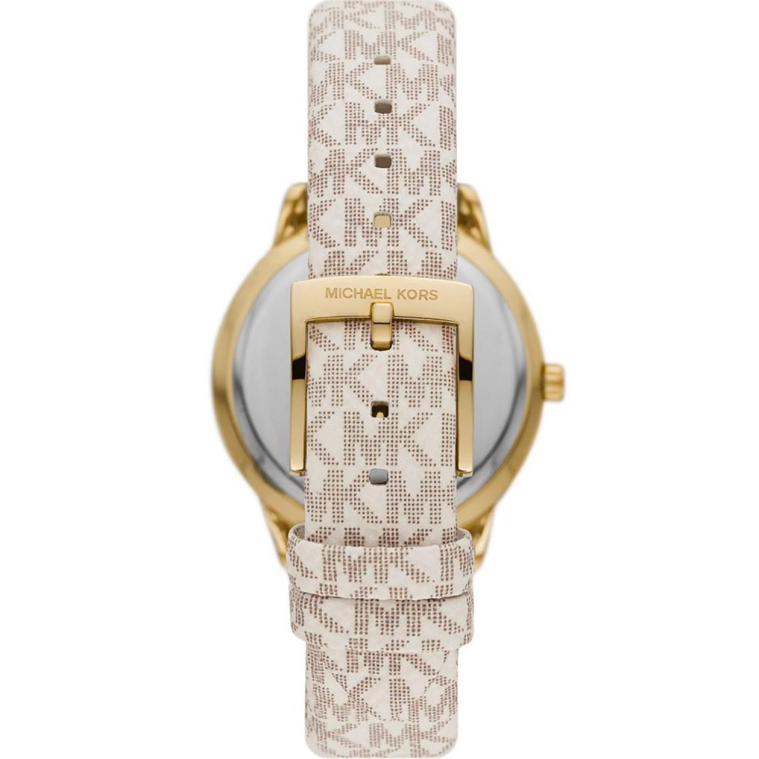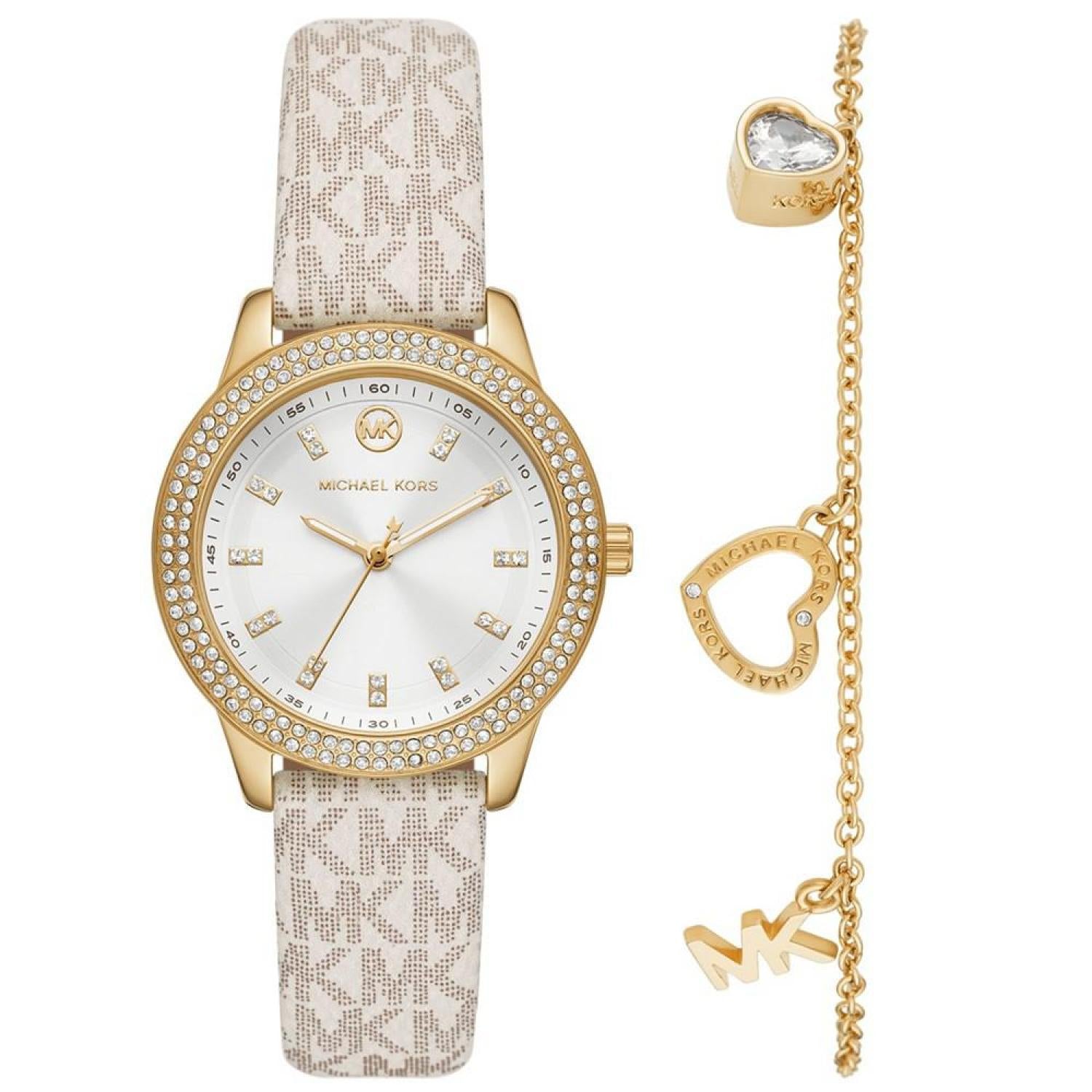 Michael Kors' gift set includes a gold-tone steel slider charm bracelet and Tibby 34mm watch featuring a white dial with glitz indexes, gold-tone IP case with a pavé top ring, three-hand movement and Vanilla PVC leather logo strap. Dial: White, with sunray finish. Movement: Quartz/3 Hand Case: Round, Gold-tone Stainless Steel, 34MM Strap: Vanilla PVC Strap Closure: Single Prong Strap Buckle Approx. Adjustable Length: 175+/- 5MM Water resistant to 50 meters International 2-Year Limited Warranty Gift set includes a watch and gold-tone slider charm bracelet This item comes in gift box Imported Sign up for Macy's WorryNoMore® Jewelry & Watch Protection program within 30 days of purchase. Before delivery, call Customer Service 1-800-289-6229 to sign up. After delivery, visit a Macy's store with your dated receipt and jewelry purchase to sign up.