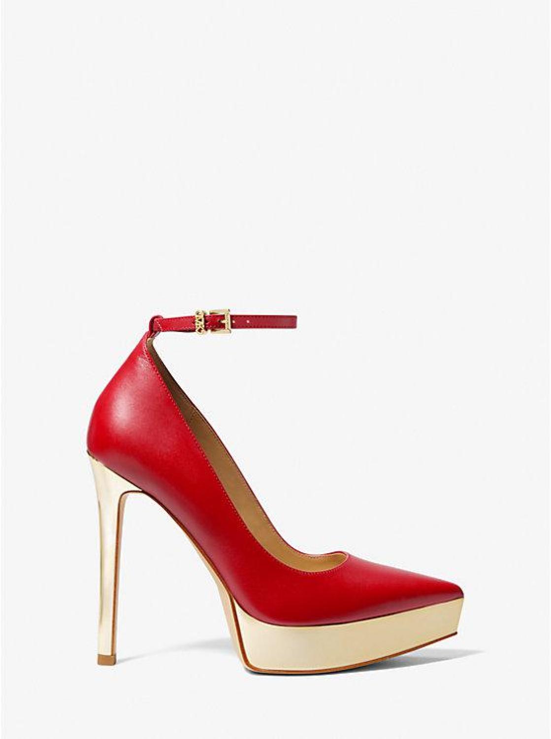 • Give evening looks a boost with these retro-inspired pumps. Made from smooth leather, they have pointed platform soles and leg-lengthening stiletto heels with ankle straps for extra support. Dial up the shine by matching your accessories to the gilded accents.