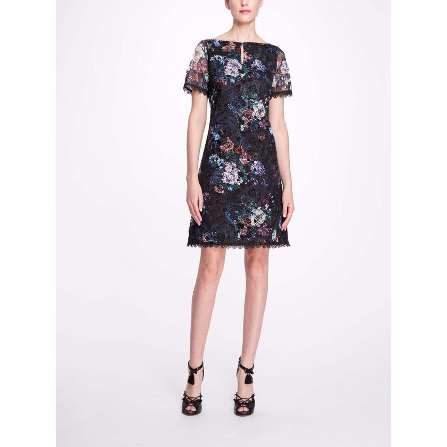 • A keyhole cut-out neck, a V-back add, and a multicolour dyed lace dress.