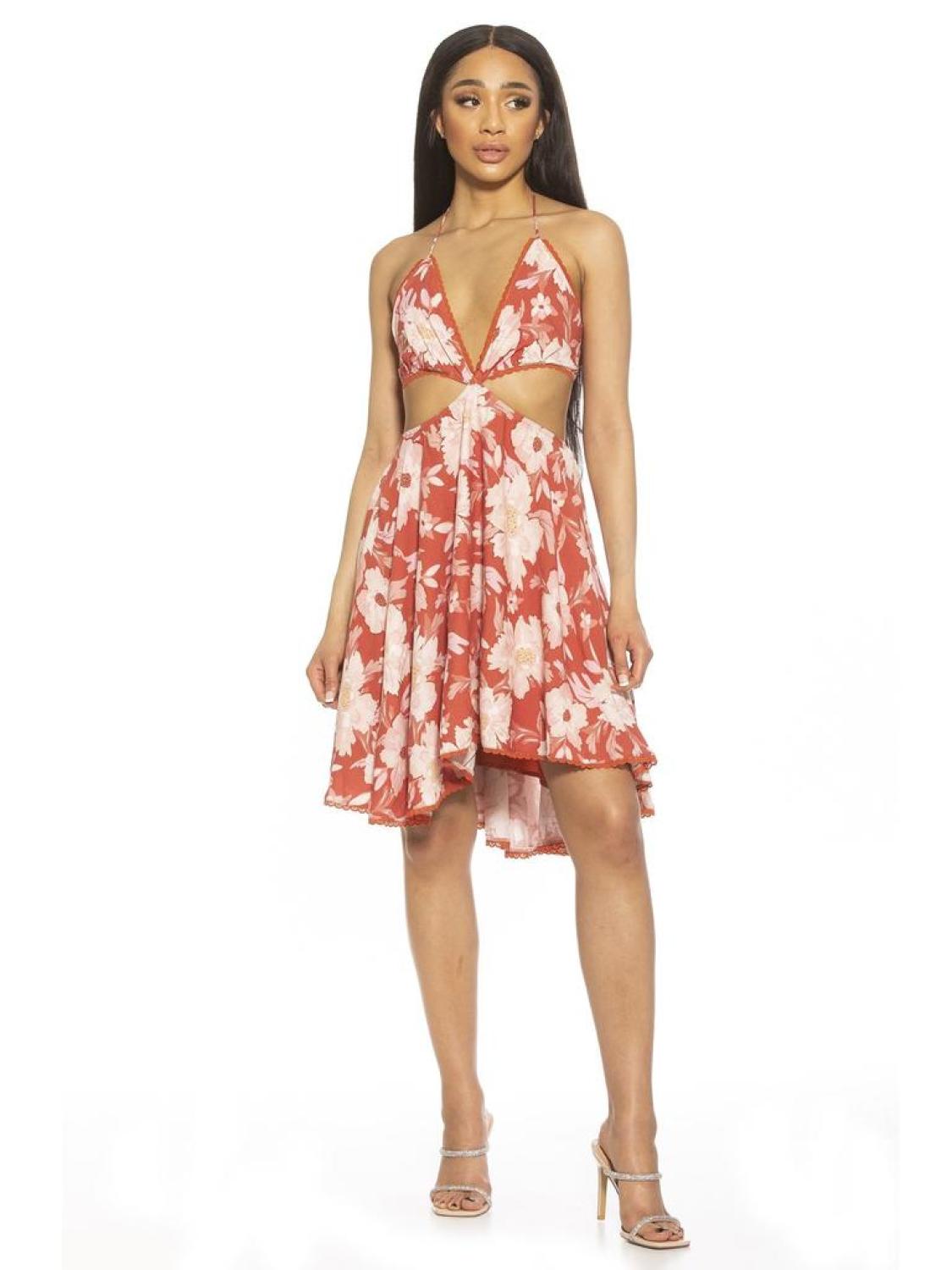 PRODUCT FEATURES Deep V-neck Sleeveless Back tassel ties Lace trim Cutout Lined - 100% Polyester 97% Rayon, 3% Spandex Machine wash Imported Style D3918