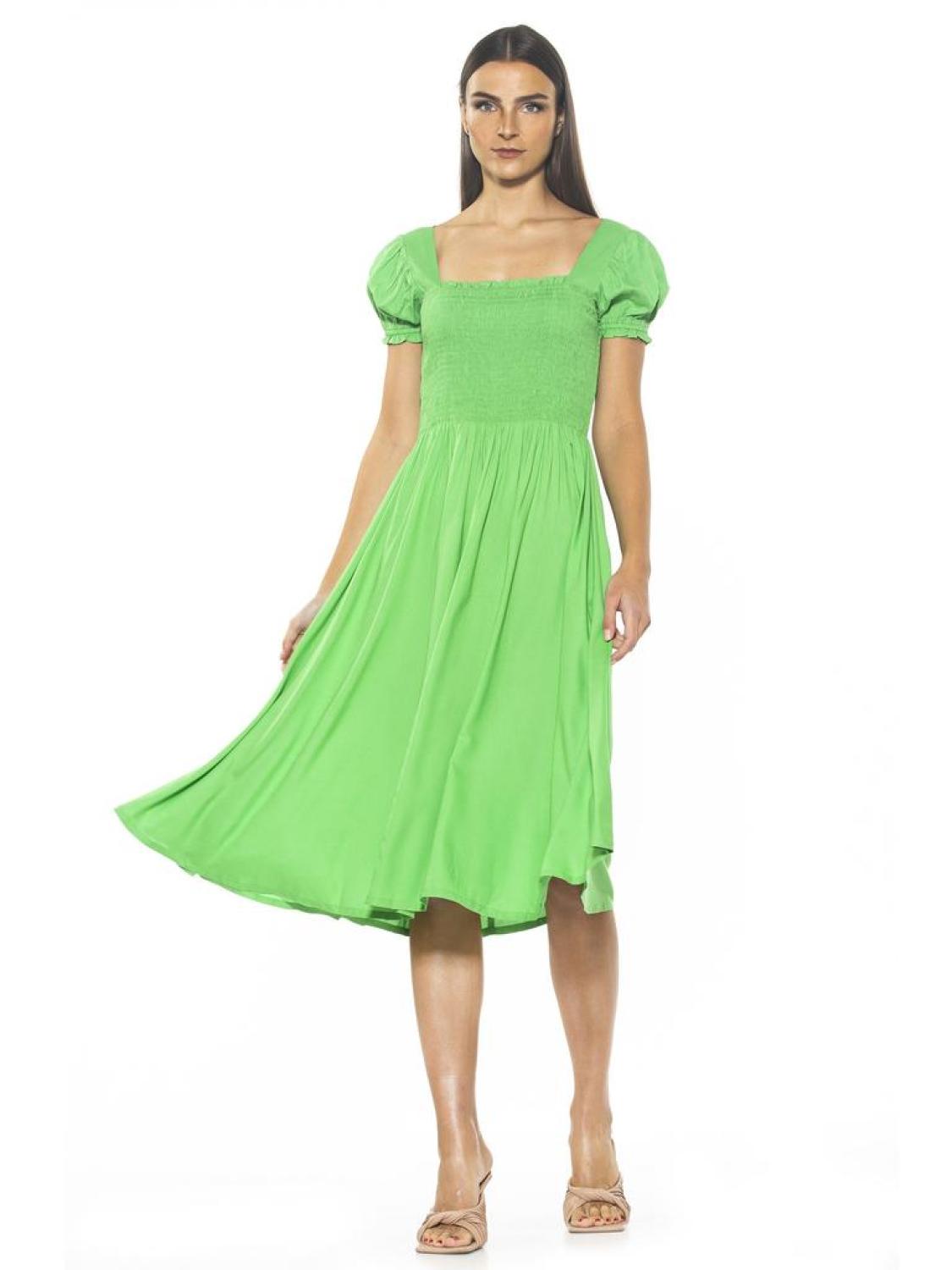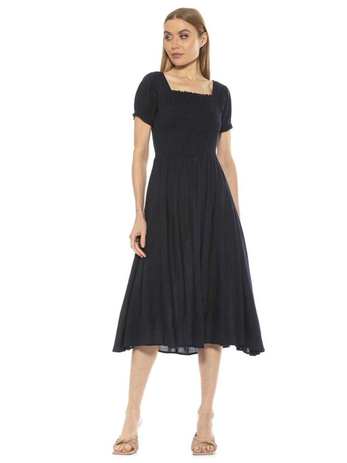A smocked bodice meets puff sleeves when you slip on this trend-setting midi dress that is soon to be a must-have option.PRODUCT FEATURES 45.5" length Square neck Smocked Bodice Short puff sleeves Slips on over head 100% Viscose Hand wash Imported Style D3903