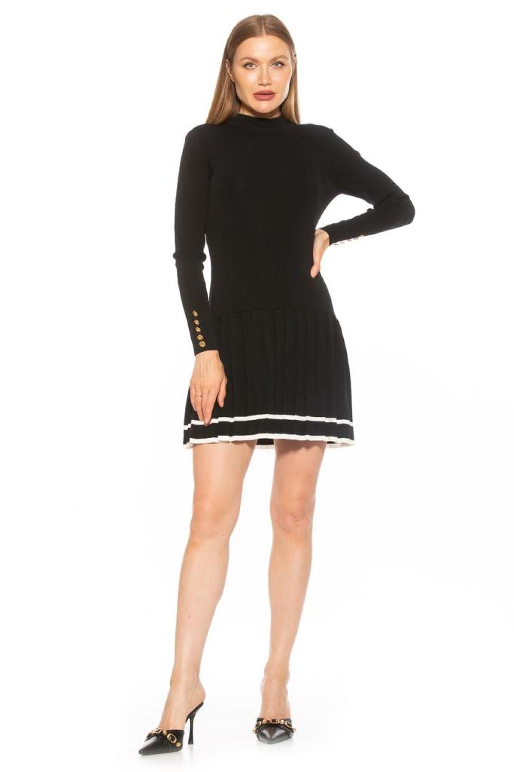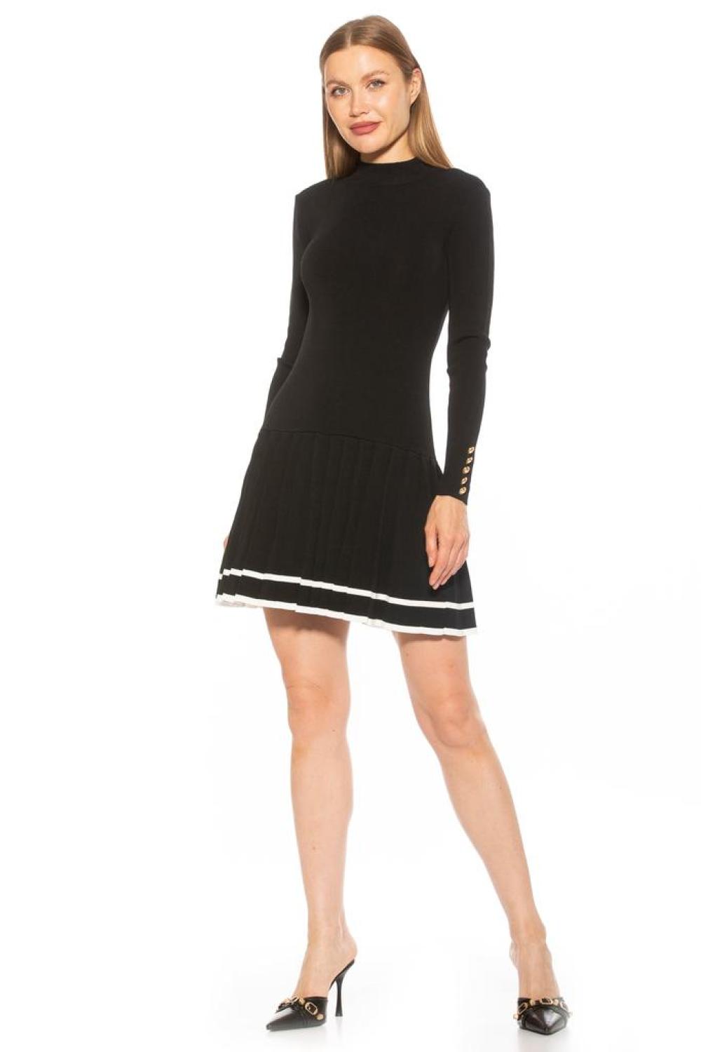 The Amara Dress is quiet luxury piece. Crafted with a mockneck, long sleeves, pleated skirt, and drop waist, this knit mini dress will have you looking as chic as you feel. Look and feel your best in effortless sophistication.PRODUCT FEATURES Mockneck Long Sleeve Pleated Skirt Drop Waist Knit Mini Dress 60% Viscose, 30% Polyamide, 10% Elastine Dry Clean Imported Style D5028