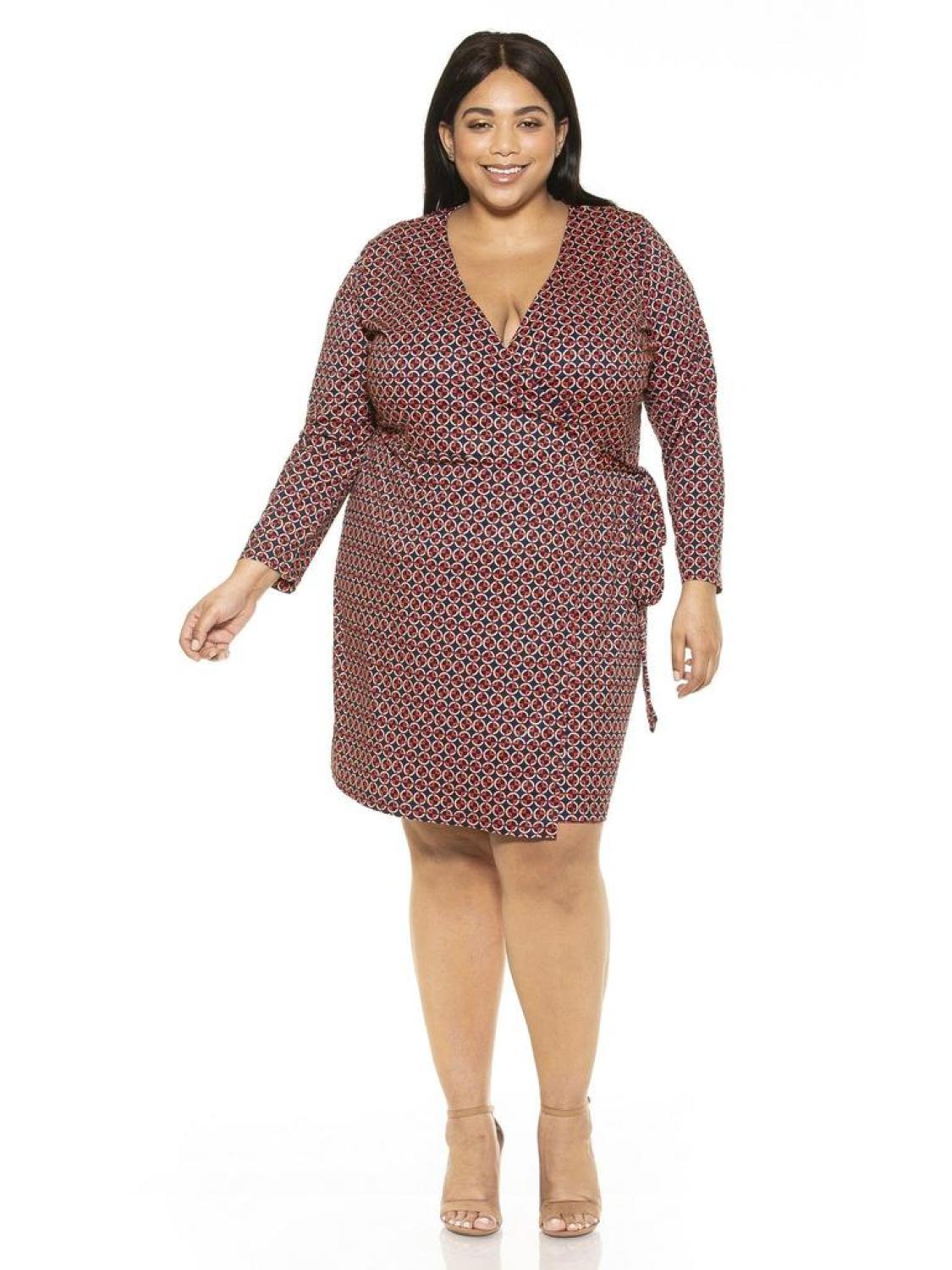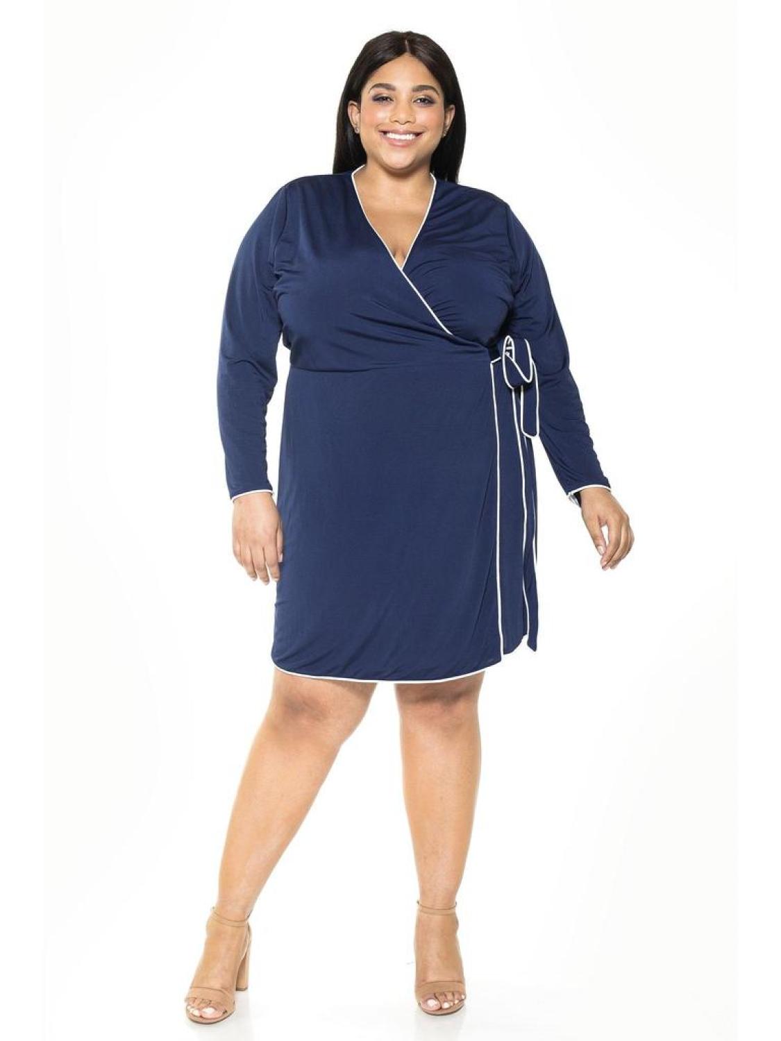 • PRODUCT FEATURES V-neckline Long sleeves Wrap front detail Above the knee length Self - 93% Polyester, 7% Spandex Lining - 100% Polyester Imported Style D3347PLS