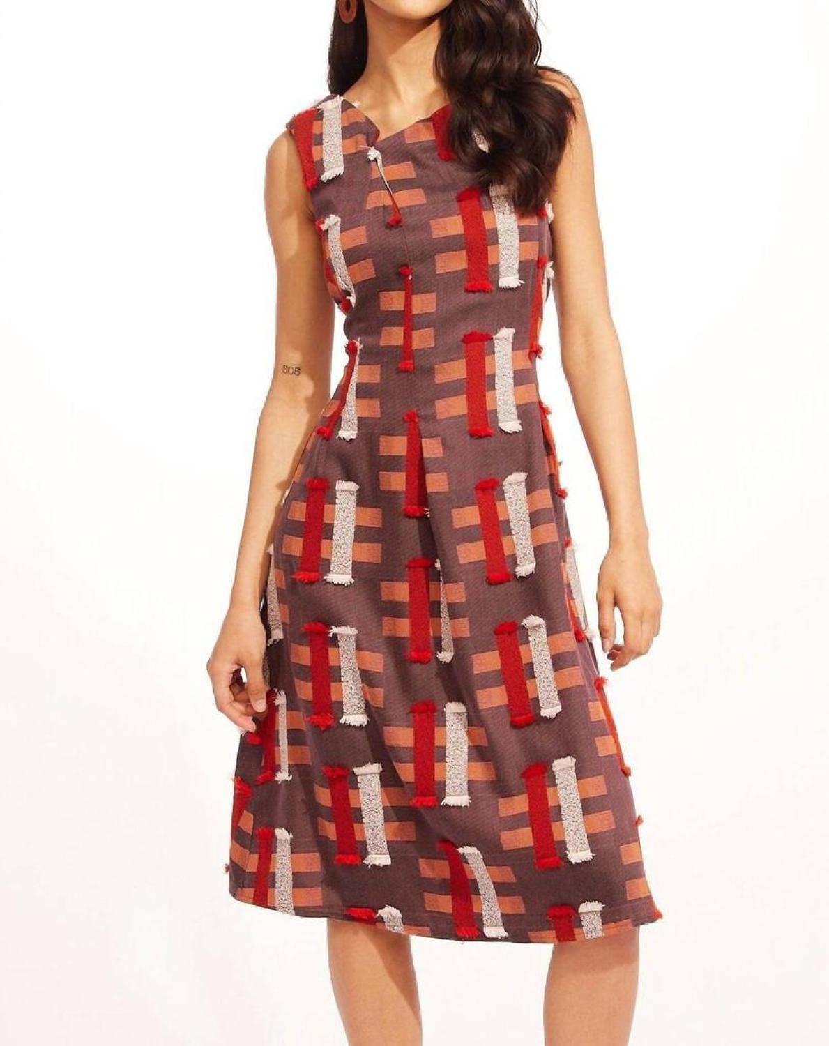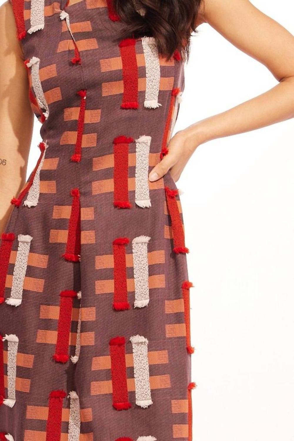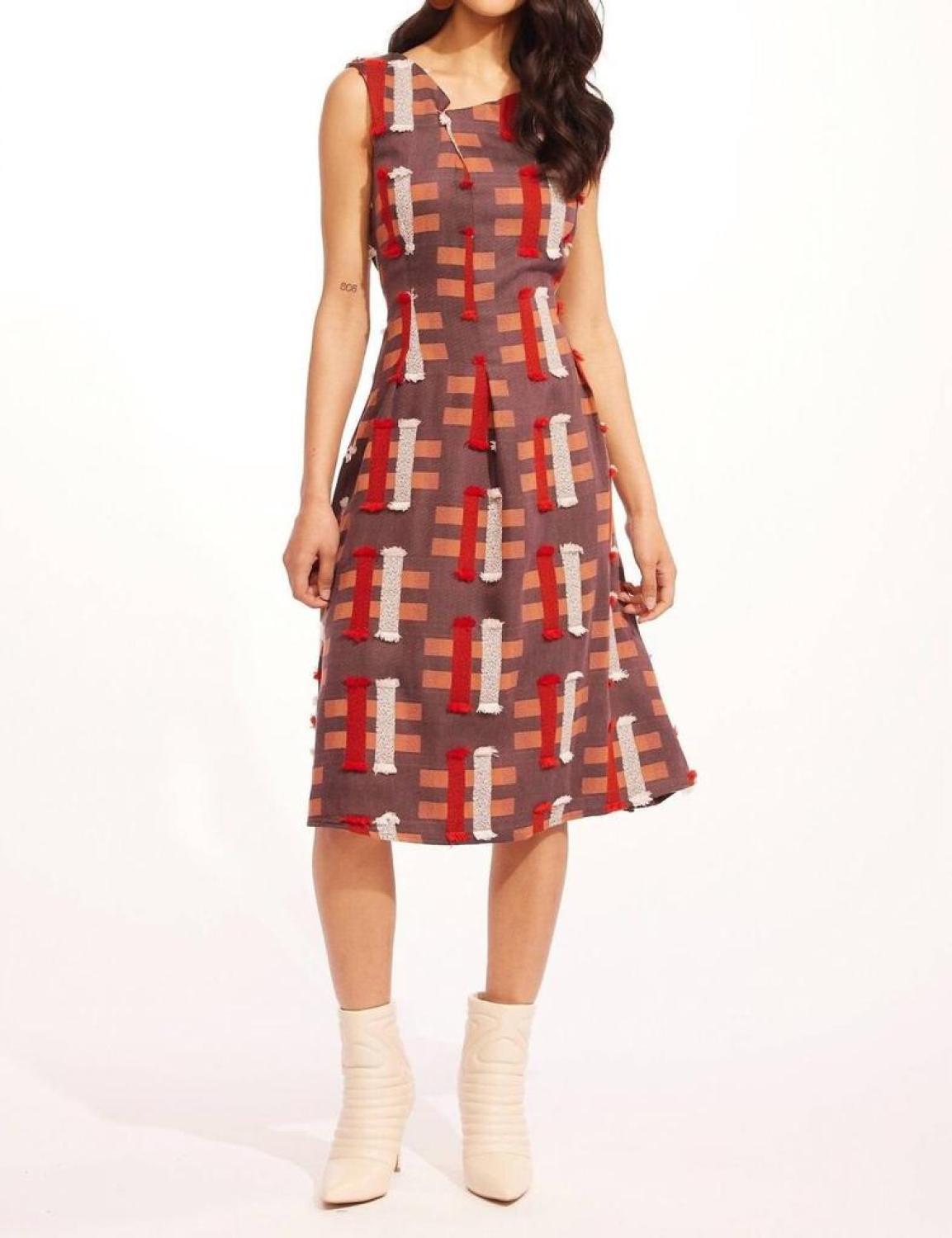 • Just add slides or mules and you are good to go.With a flattering fit and flare silhouette, sleeveless midi length, and an uneven neckline. Plus, an easy back zip. 35% Acrylic 30% Lyocell 20% Polyester 15% Wool; 100% Polyester lining. Dry Clean only. Made in USA.