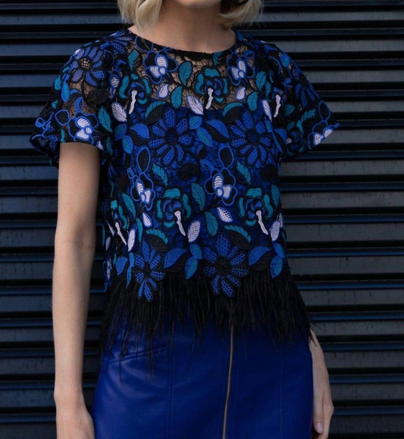 • A timeless blouse that will never go out of style.This gorgeous lace short sleeve top with black feather trim makes comfortable-yet-chic style truly effortless. Feather trim. Short sleeve. Round neck. Pullover style