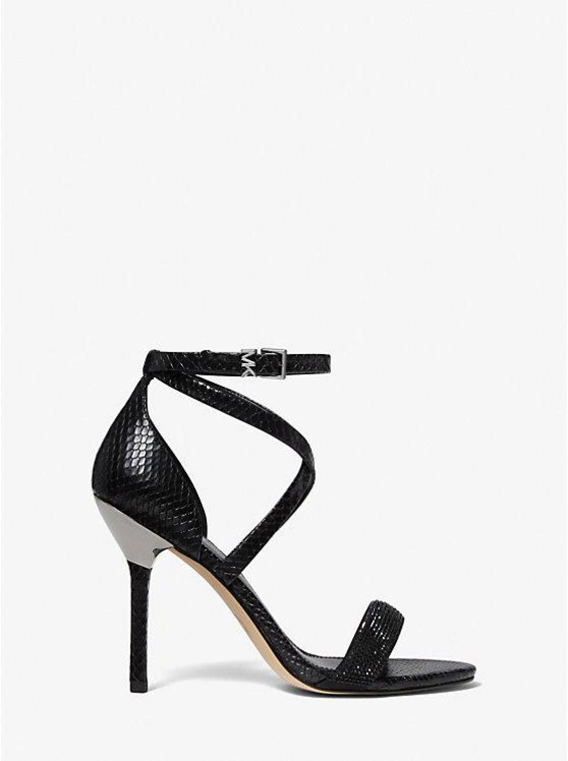 • Embellished to perfection, our Astrid sandal will have you treading brightly at your next soirée. This snake-embossed leather pair is defined by crystal embellishments and crossover straps that beautifully frame the foot. While the styling options are endless, we think they’re best reserved for a special night out.