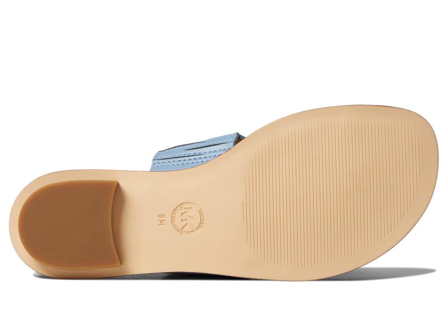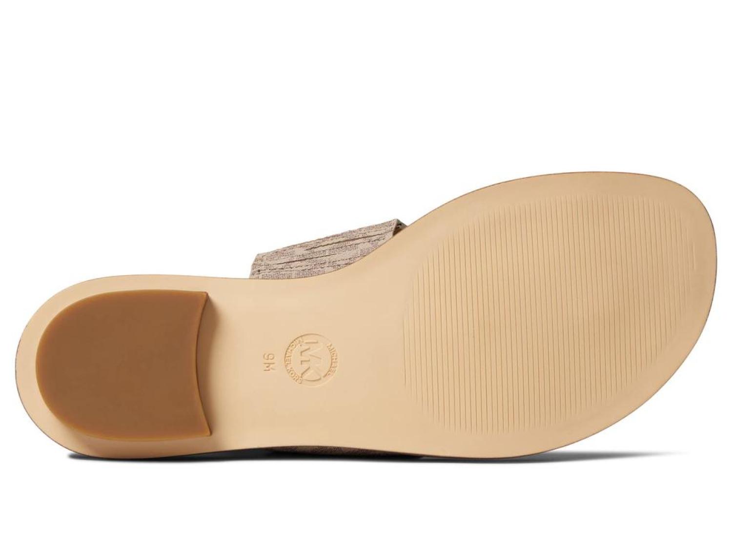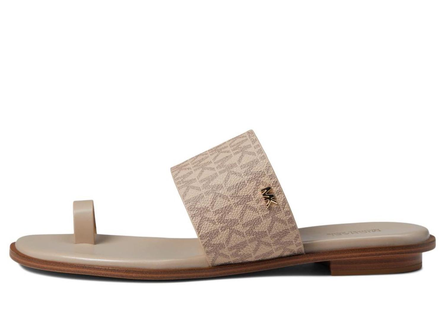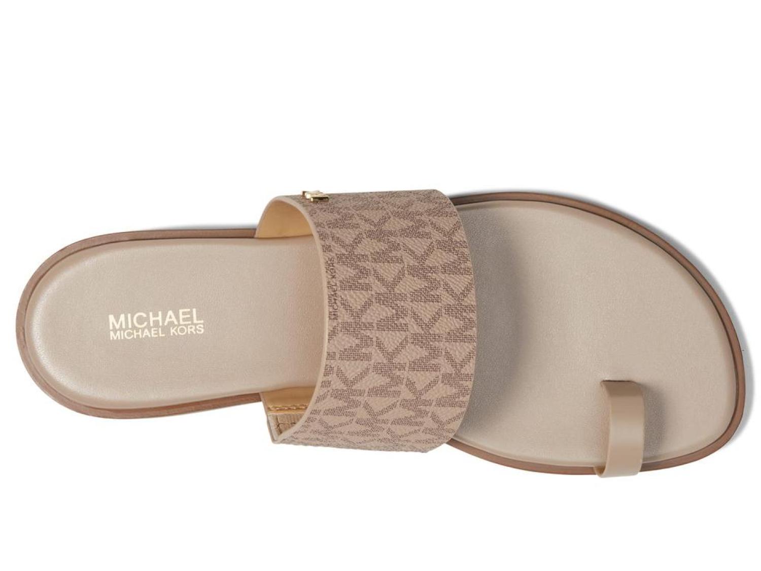 Bring a sophisticated touch to any ensemble with the MICHAEL Michael Kors® August Flat Sandal. This slide sandal is crafted with a leather upper, and is designed with a toe loop and an elasticized side gusset for a secure fit. Easy slip-on styling. Synthetic lining. Lightly padded footbed. Low stacked heel. Rubber sole. Imported. Product measurements were taken using size 8.5, width M. Please note that measurements may vary by size. Measurements: Heel Height: 3/4 in Weight: 8 oz-