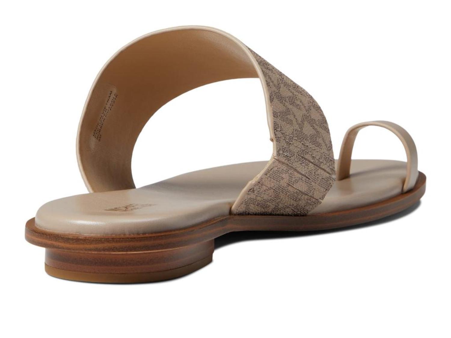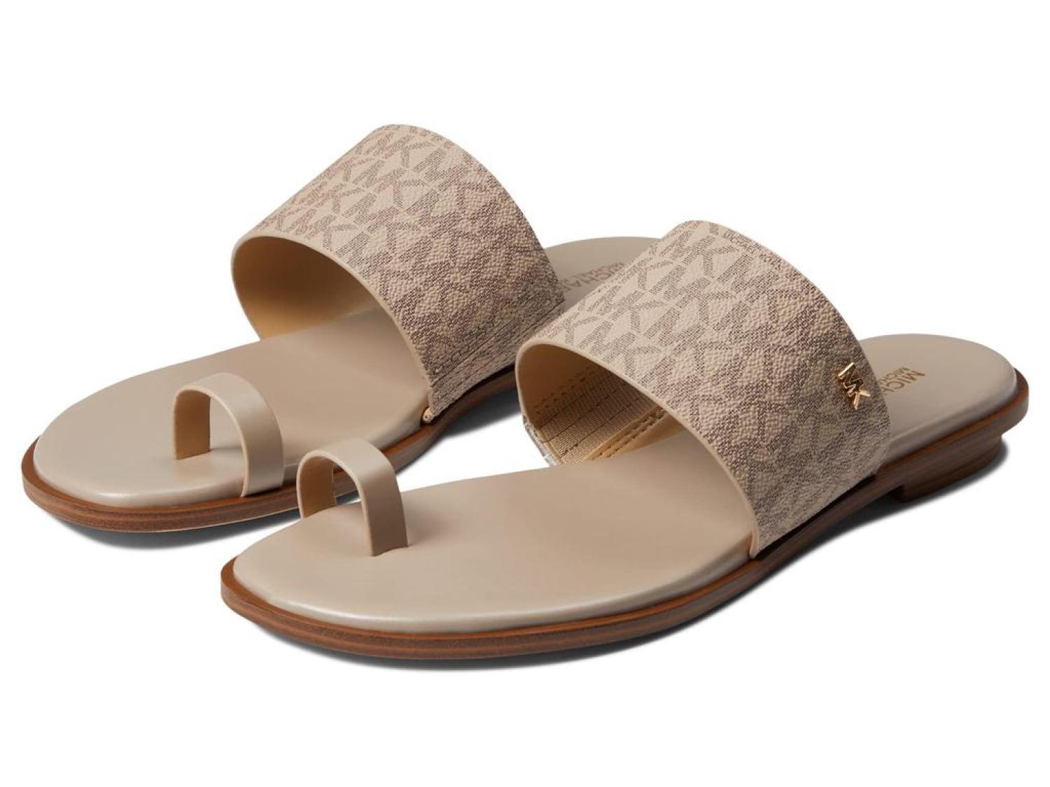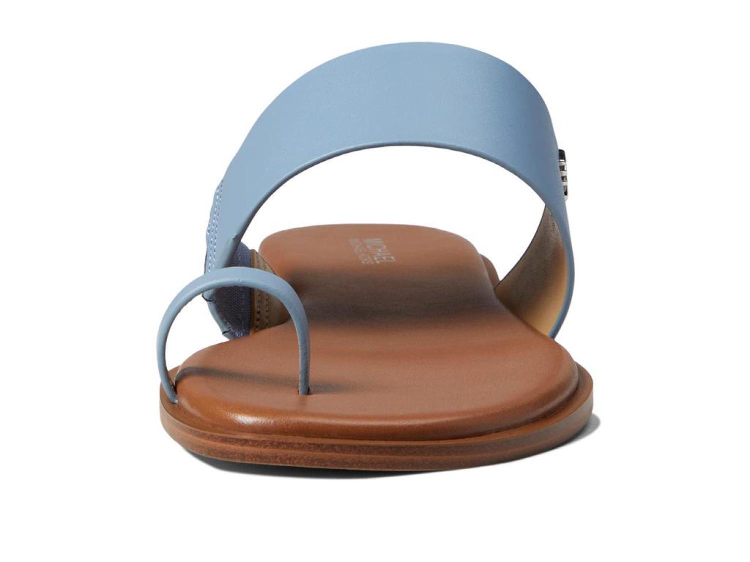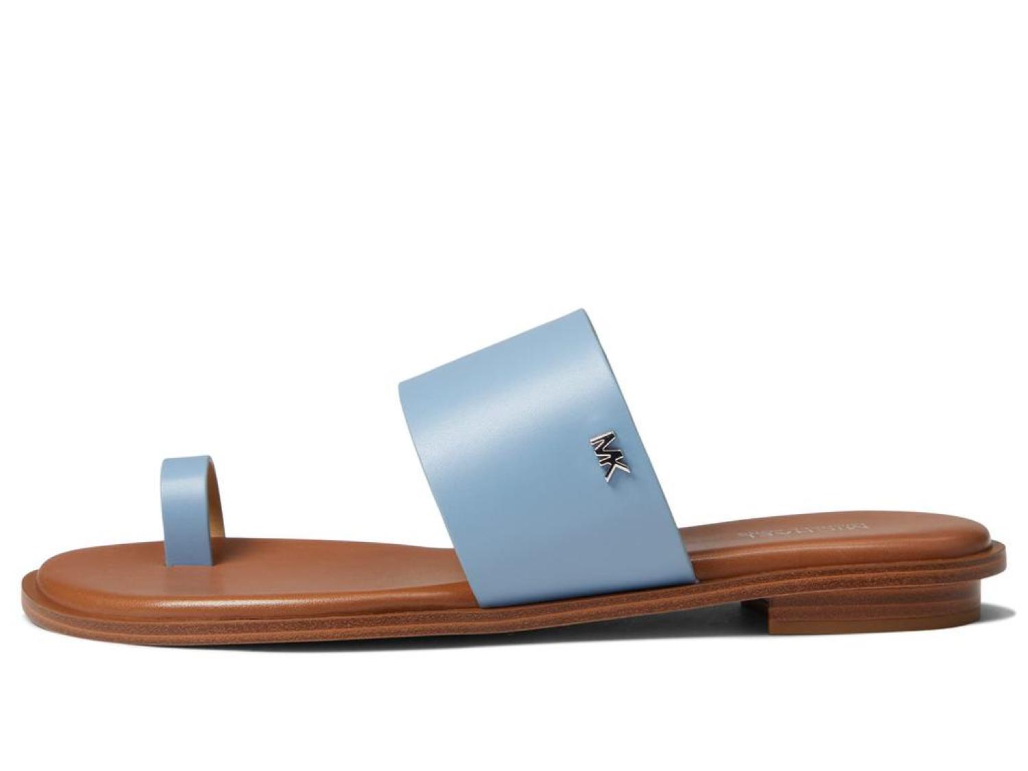 Bring a sophisticated touch to any ensemble with the MICHAEL Michael Kors® August Flat Sandal. This slide sandal is crafted with a leather upper, and is designed with a toe loop and an elasticized side gusset for a secure fit. Easy slip-on styling. Synthetic lining. Lightly padded footbed. Low stacked heel. Rubber sole. Imported. Product measurements were taken using size 8.5, width M. Please note that measurements may vary by size. Measurements: Heel Height: 3/4 in Weight: 8 oz-