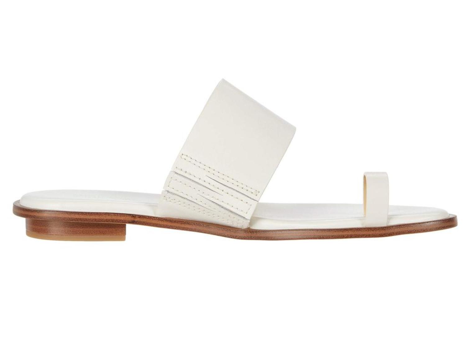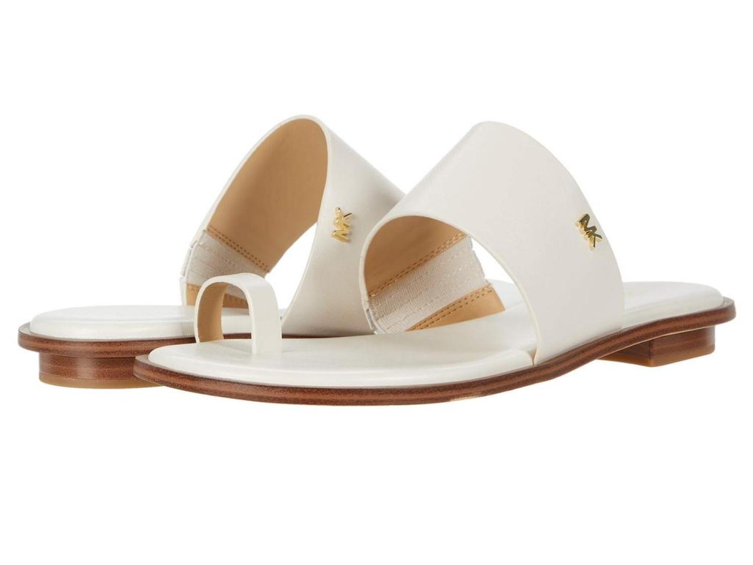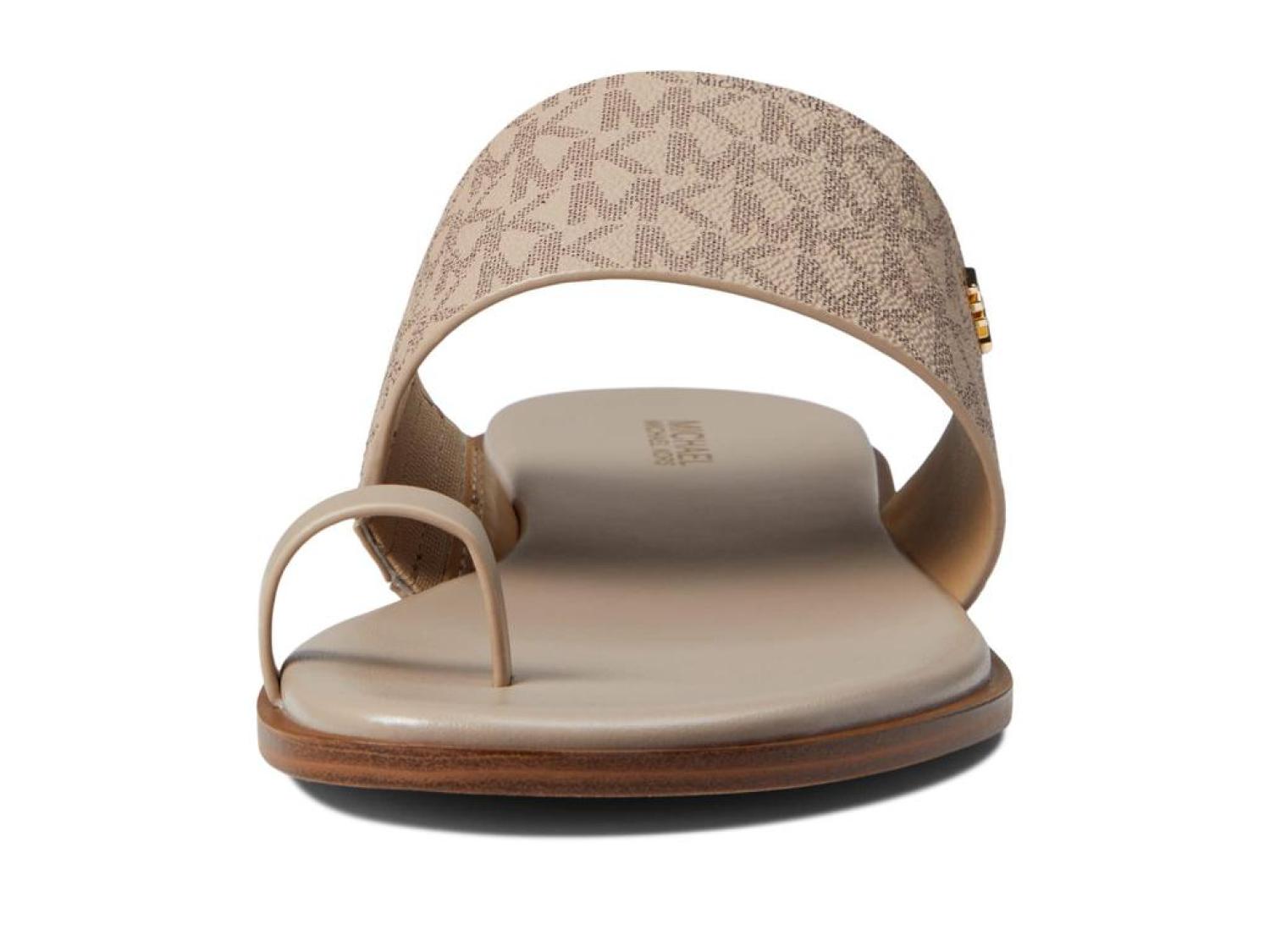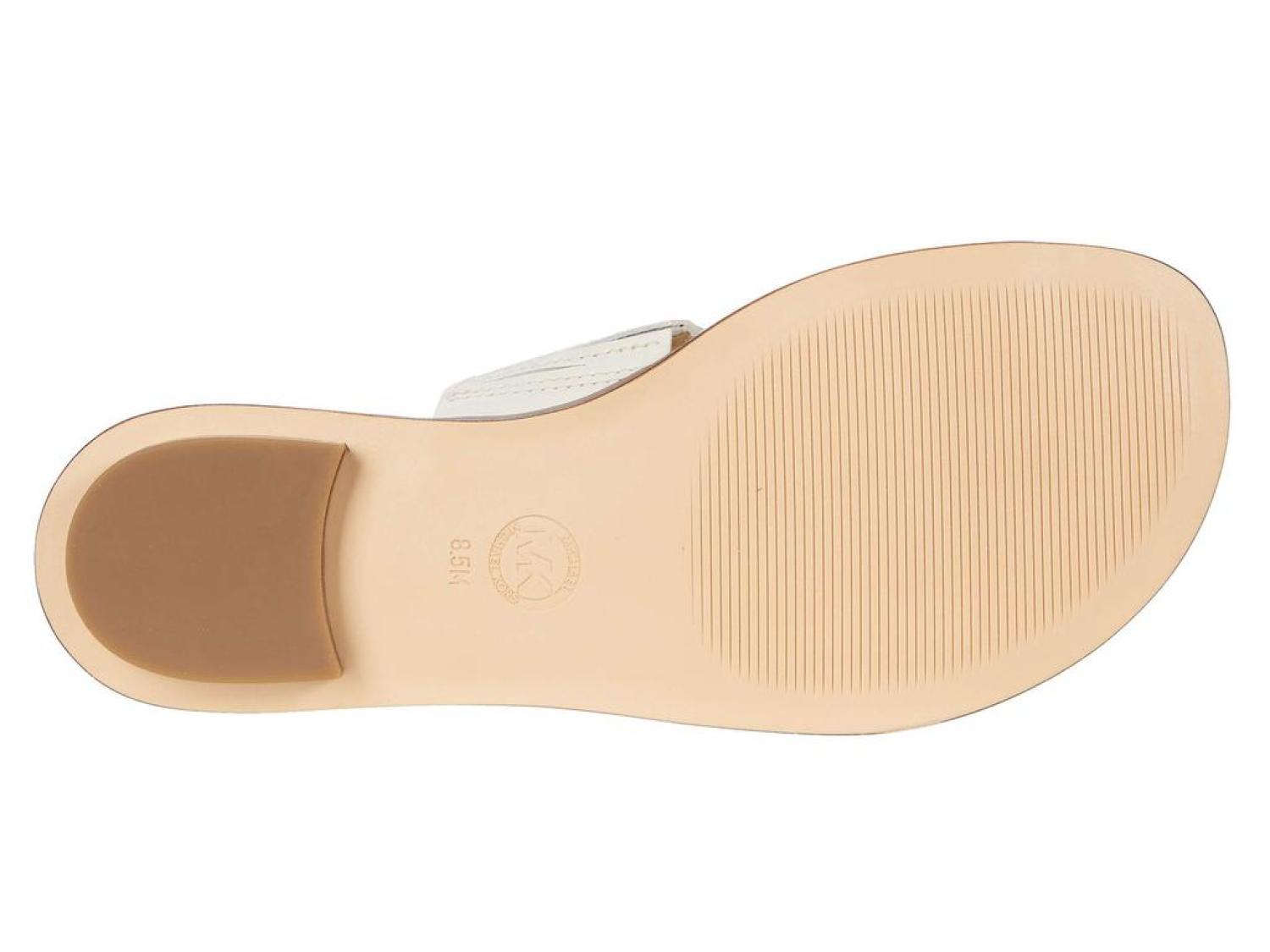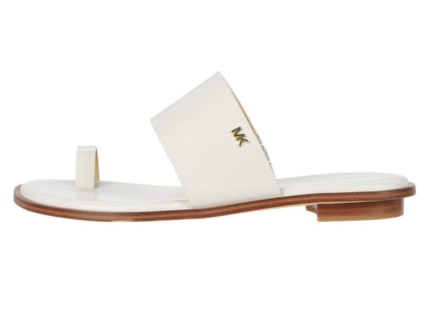 Bring a sophisticated touch to any ensemble with the MICHAEL Michael Kors® August Flat Sandal. This slide sandal is crafted with a leather upper, and is designed with a toe loop and an elasticized side gusset for a secure fit.