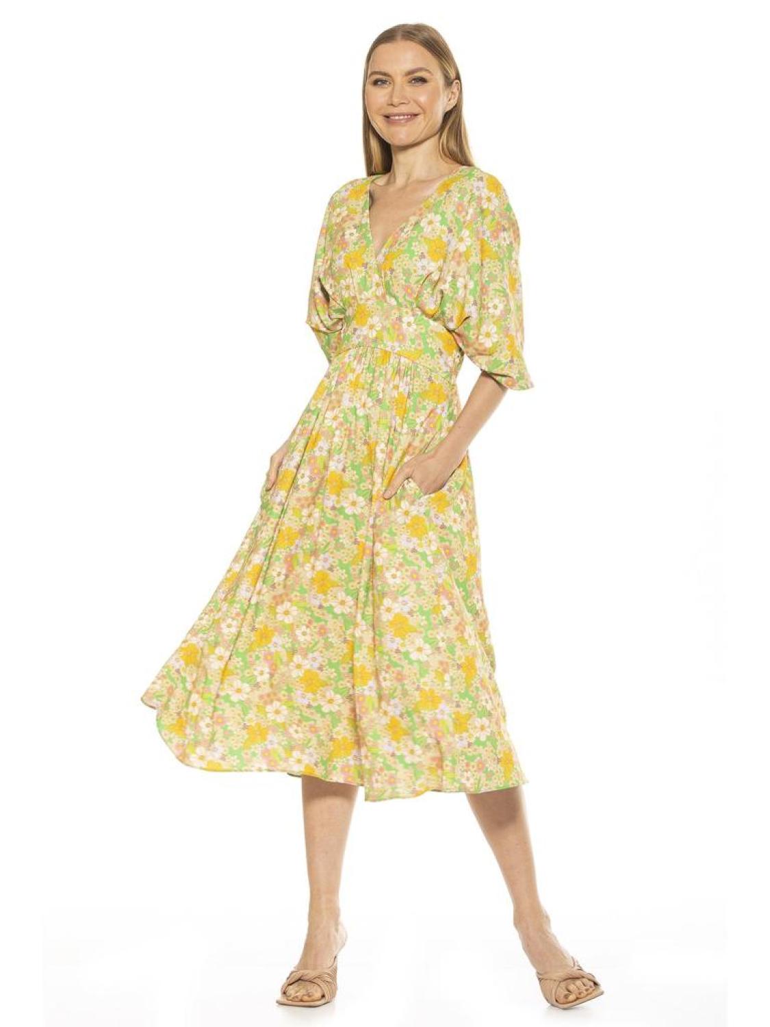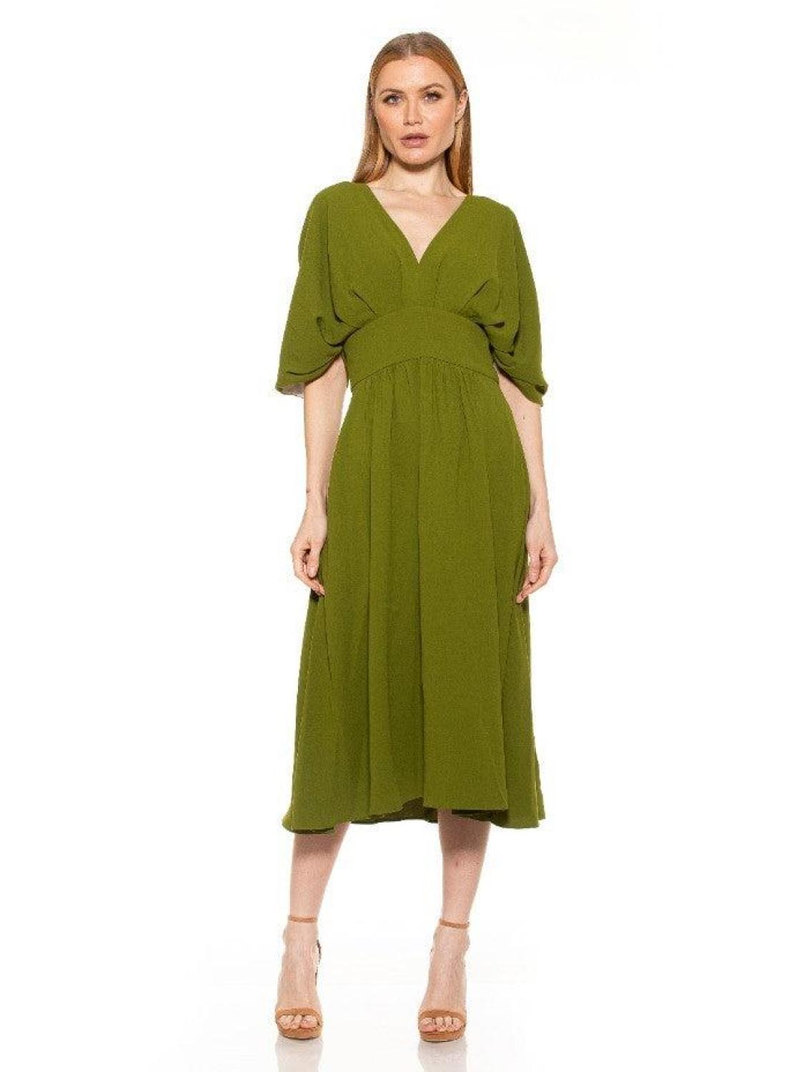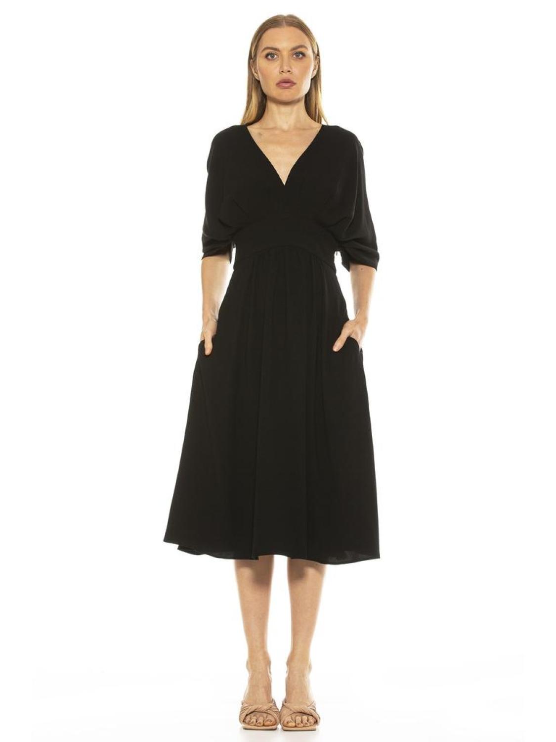 • PRODUCT FEATURES ?�V-neck 3/4 draped sleeves Back zip closure 2 front slash pockets Slip on overhead Structured waist - Midi length 100% Polyester Lined - 97% Polyester, 3% Spandex Machine Wash Imported Style D3816