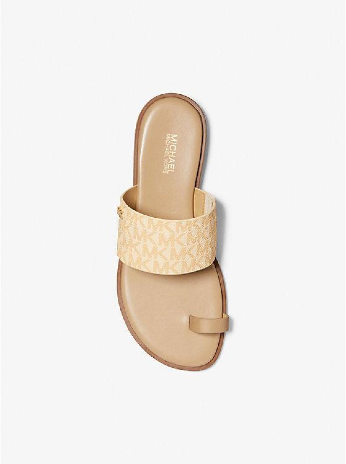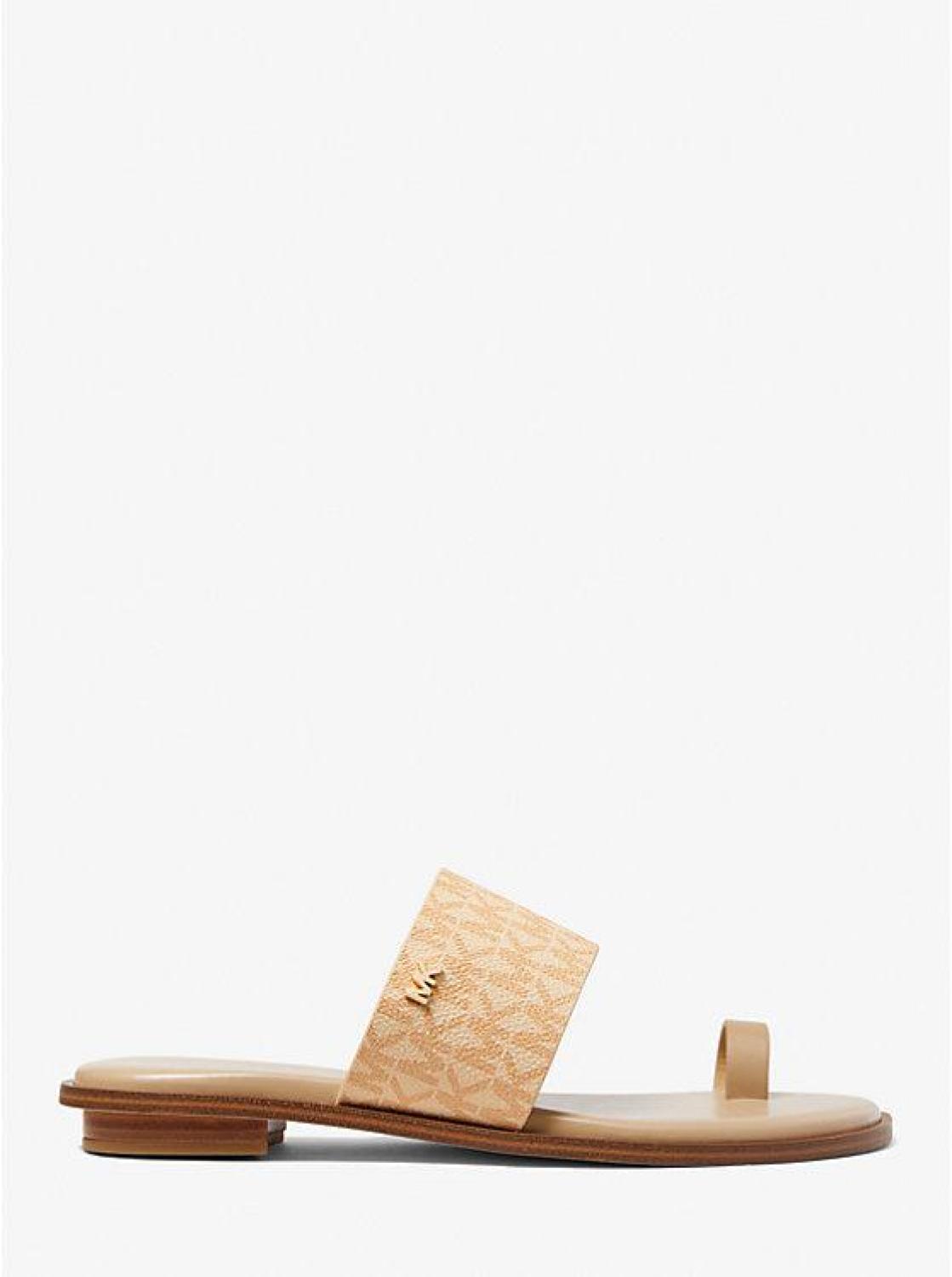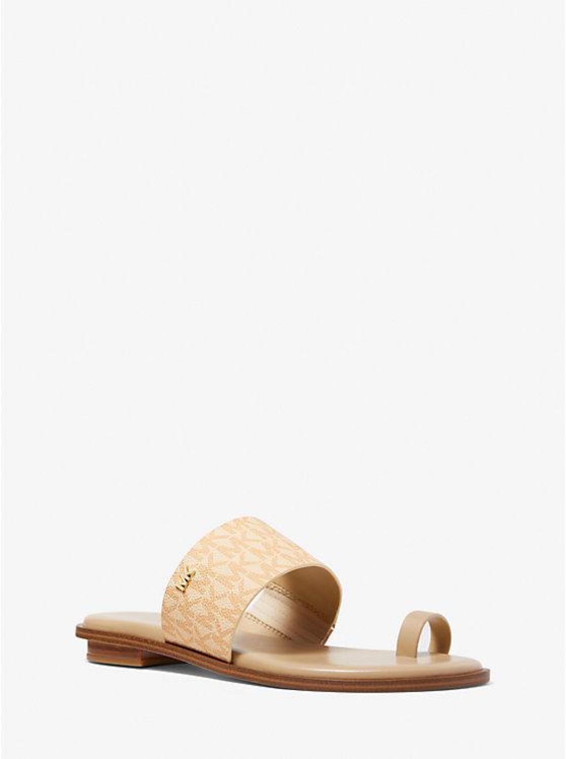 The heel may be flat, but the attitude is elevated. Our Signature Logo print August sandal is crafted with a toe ring and finished with a subtle MK plaque. The lightly cushioned footbed offers comfort, whether you’re brunching, sightseeing, or simply running errands. • Sandal • Logo-print canvas/polyurethane • 100% polyurethane • Lining: polyurethane blend • Sole: rubber • Open toe • Slip on • Heel height: 0.25” • Heel type: stacked • Imported • Sandal • Logo-print canvas/polyurethane • 100% polyurethane • Lining: polyurethane blend • Sole: rubber • Open toe • Slip on • Heel height: 0.25” • Heel type: stacked • Imported