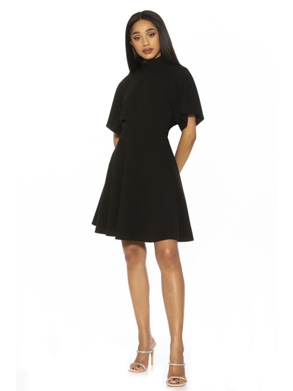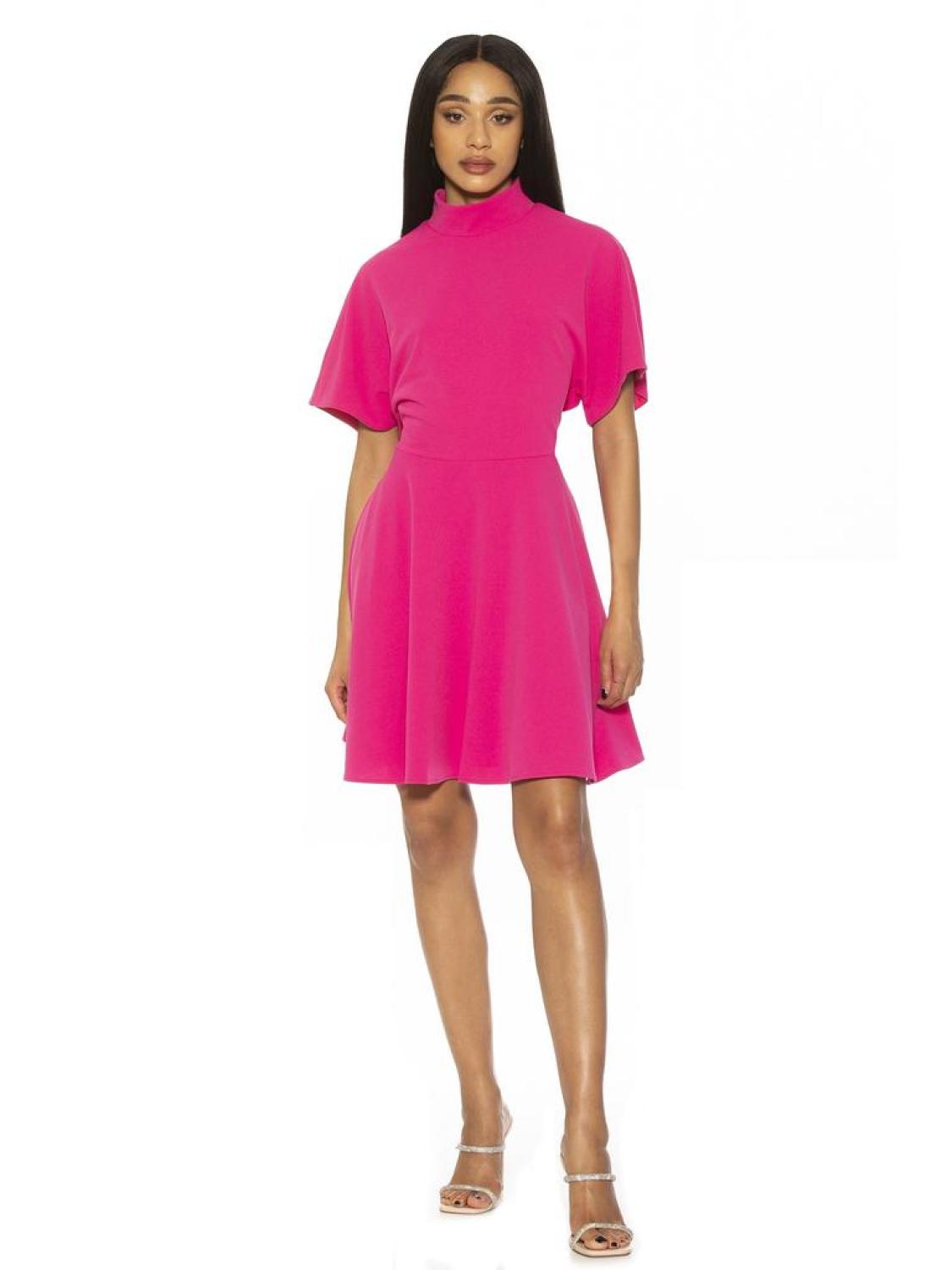 • Let those legs out for the day. The Autumn is a slim fitting, mini dress with flutter sleeves. It features a mock neckline and fitted waist.PRODUCT FEATURES Mock Neck?� Flare Short Sleeve?� Mini Dress 95% Polyester, 5% Spandex Lining - 100% Polyester Machine Wash Imported Style D3989
