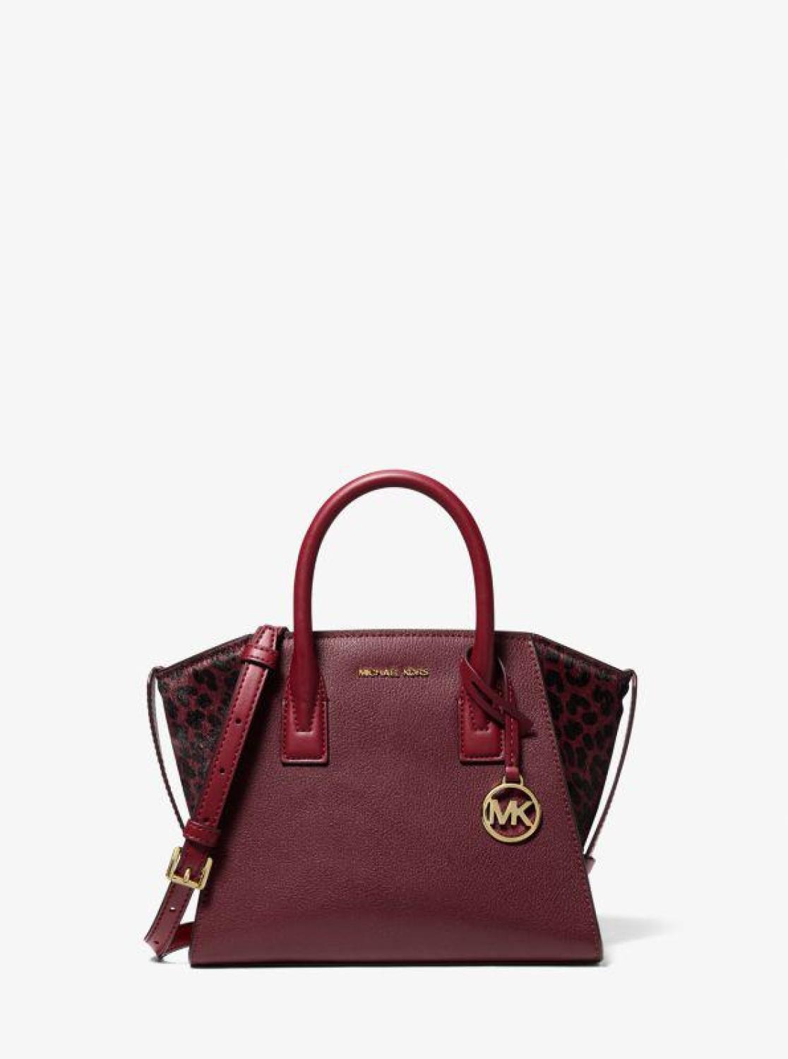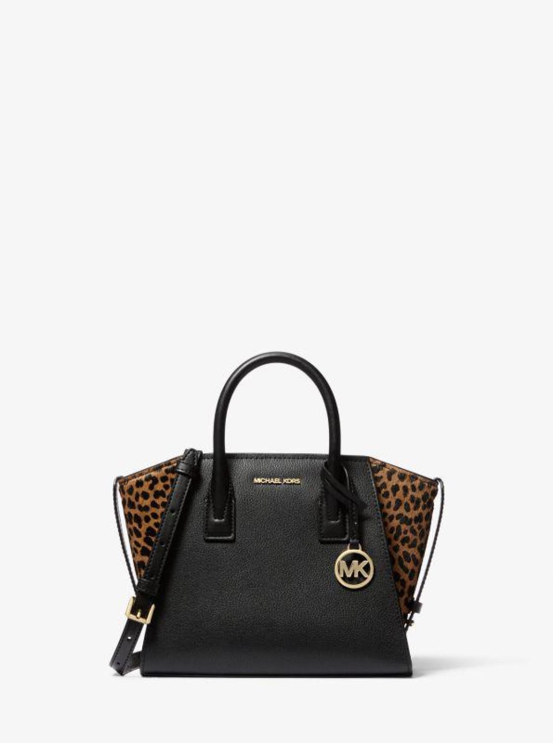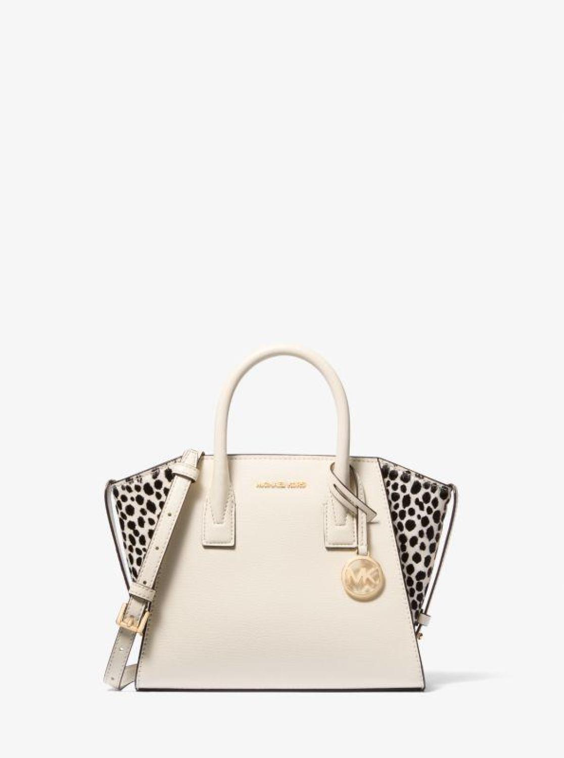 • Equally versatile and sophisticated, our Avril satchel is a must-have addition to your handbag lineup. Crafted from printed calf hair and leather, this gusseted design opens to a pocketed interior and features a detachable crossbody strap for versatility of wear. It’s the perfect complement to office-ready looks and casual weekend wear alike.