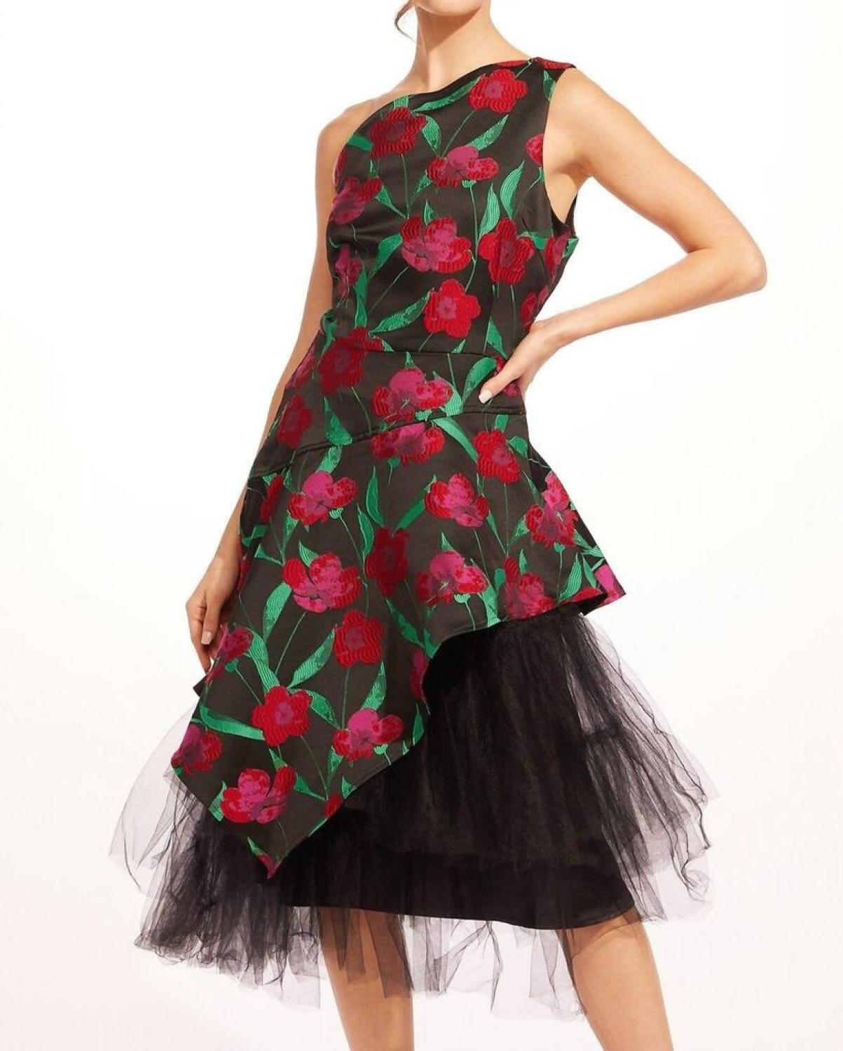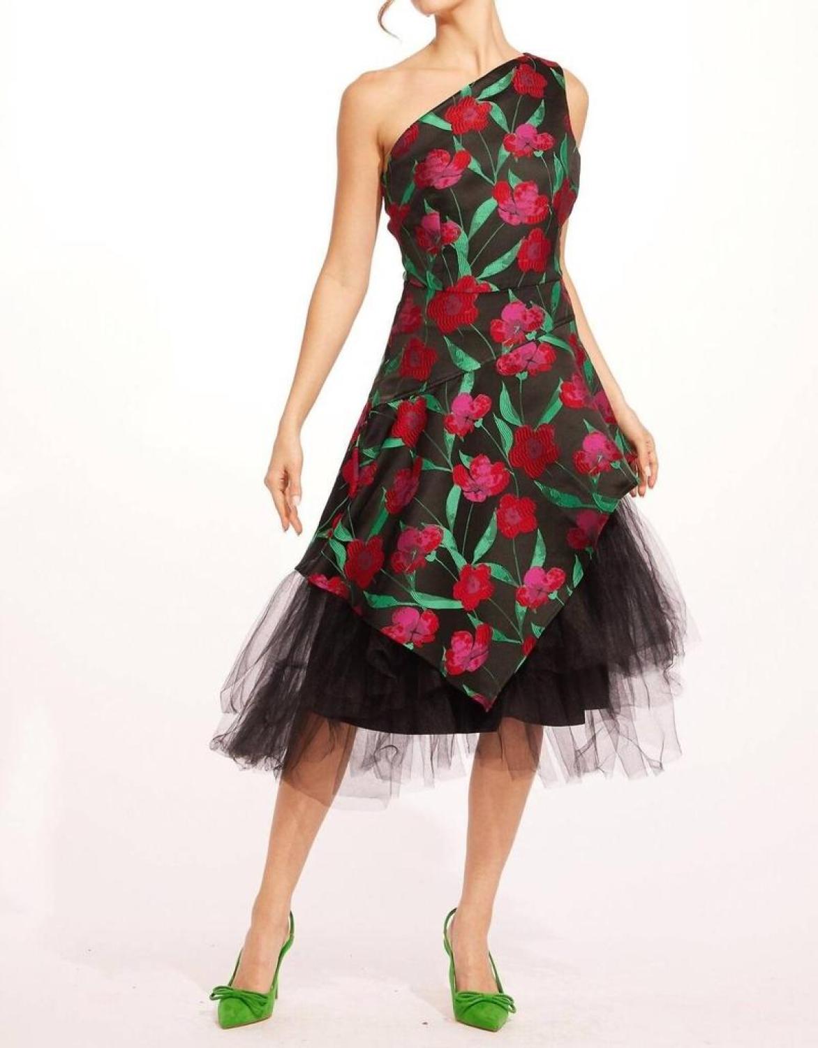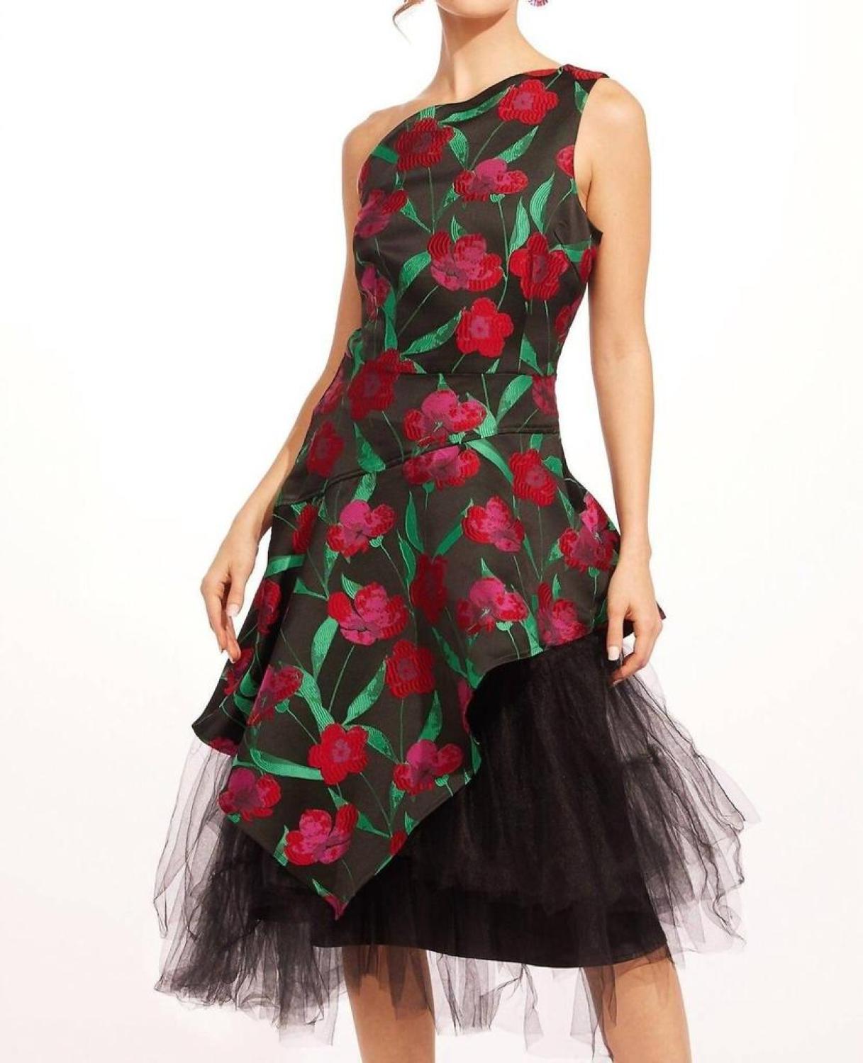 Nothing wrong with a little shoulder action.One-shoulder midi dress made with vibrant pink and green jacquard fabric and decorated with romantic rose details. Hidden tulle layer and zip closure. 100% Polyester; 100% Polyester lining