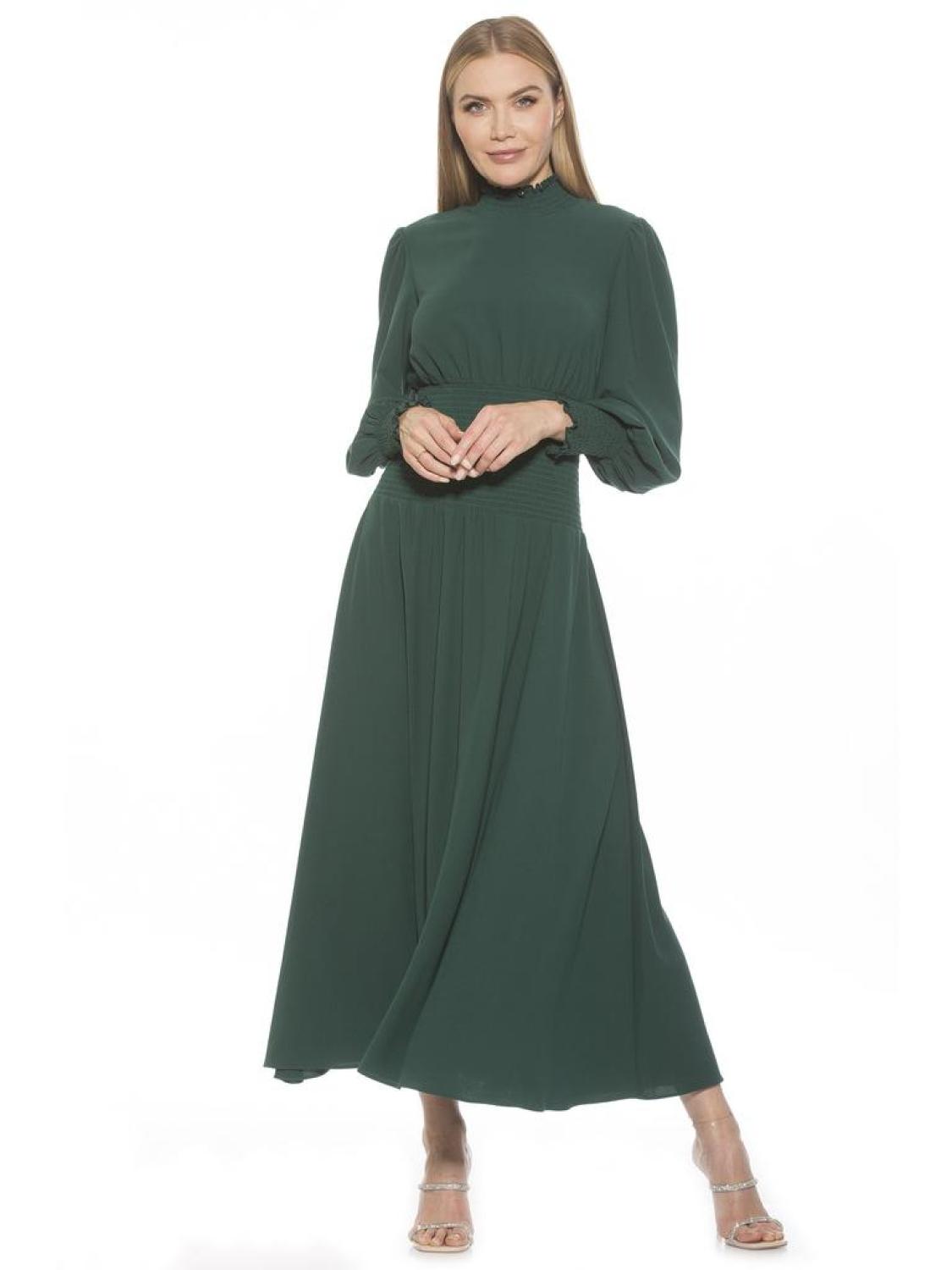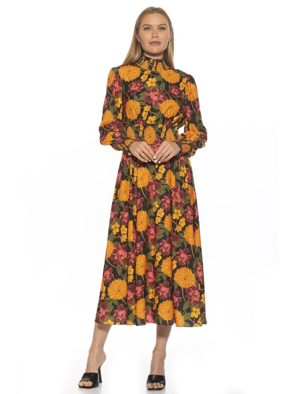 PRODUCT FEATURES Button back closure Back keyhole Smocked mock neck Long sleeves with smocked wrists Smocked waist Mid length 100% Polyester Machine wash Imported Style D3957