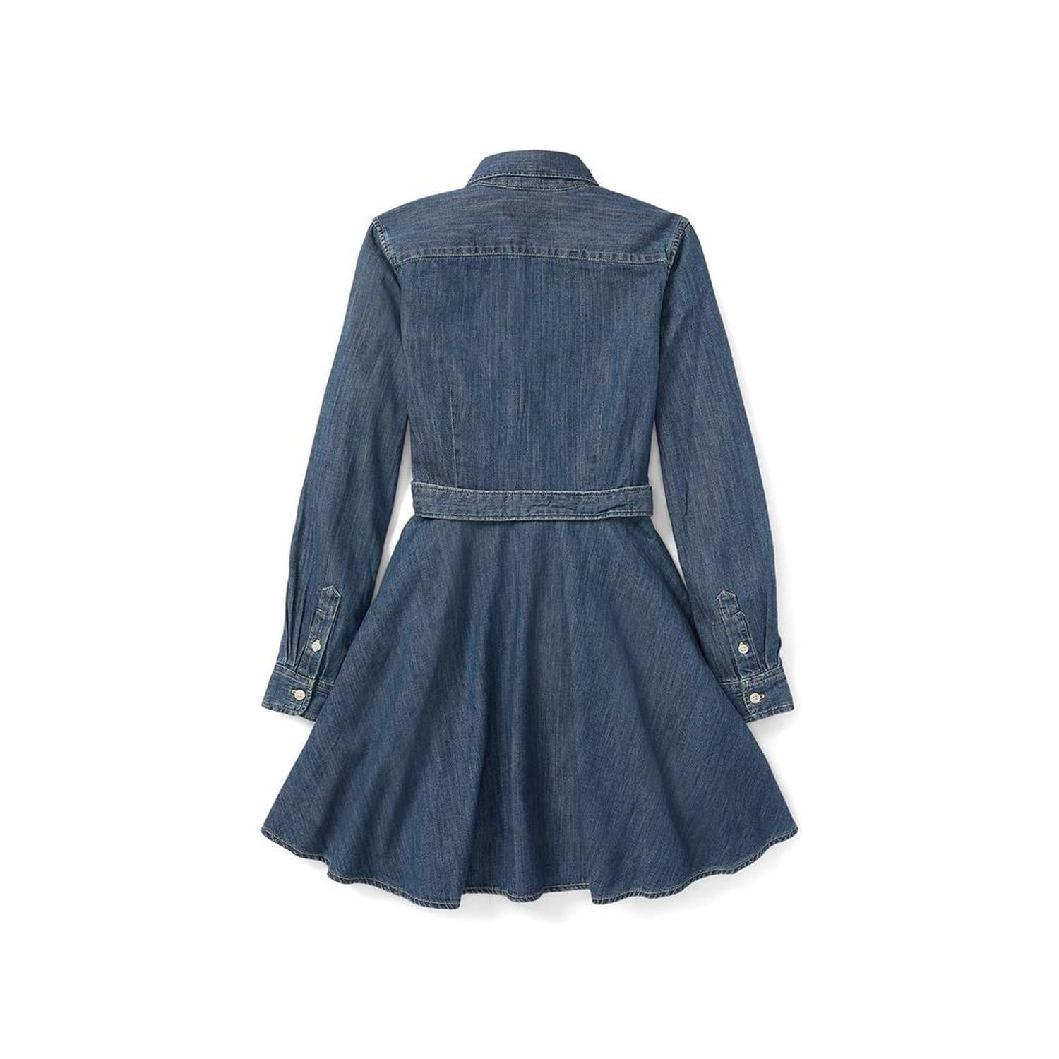 Have her dressed up in a classic casual look with the Polo Ralph Lauren® Kids Belted Cotton Denim Shirtdress. This cotton polo shirt dress is crafted with a button-down collar neckline, full button placket, long sleeves with adjustable buttoned barrel cuffs, back yoke, multicolored signature embroidered pony at the front left chest, removable waist belt, ruffled bottom and finished in a dark indigo wash for a timeless design. Full button front closure. Fit-and-flare silhouette. Ruffled skirt lower. Dyed with true indigo, which may rub off onto fabrics, leather, and upholstery. 100% cotton. 100% cotton. Machine washable. Imported. Measurements:• Body length: 23"• Sleeve length: 20" Measurements:• Body length: 23"• Sleeve length 20"
