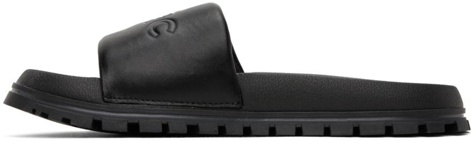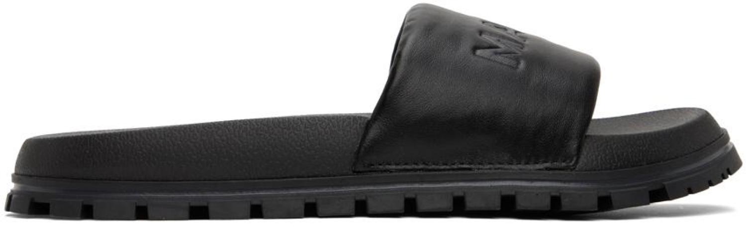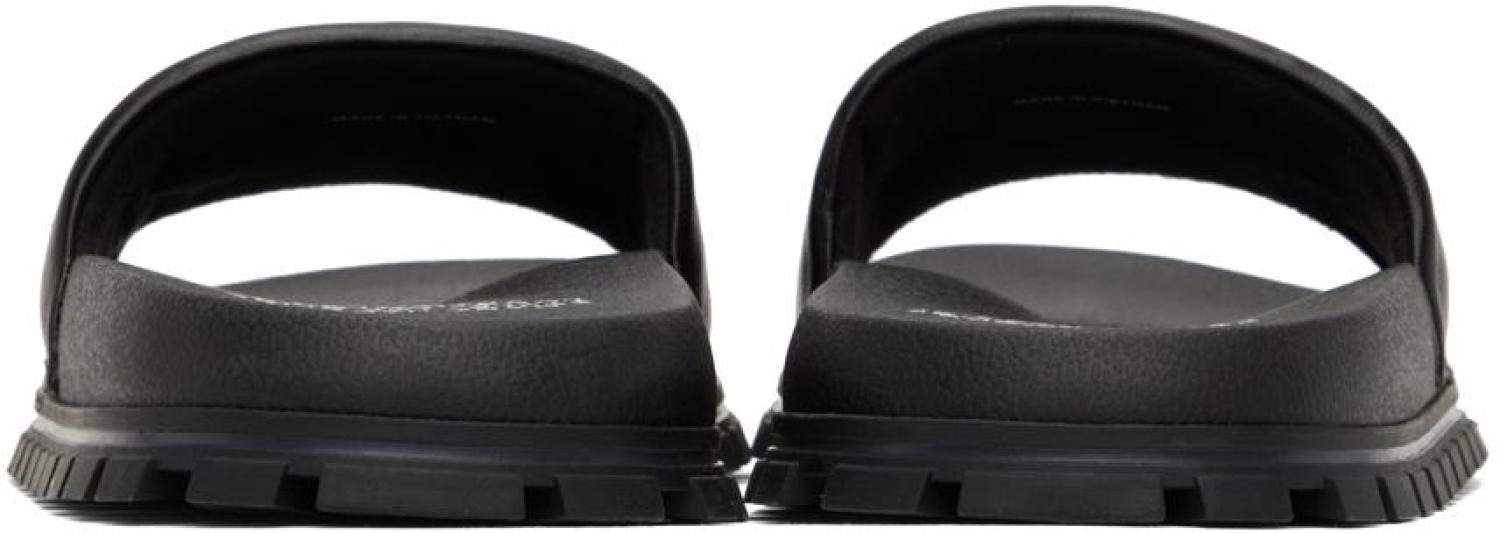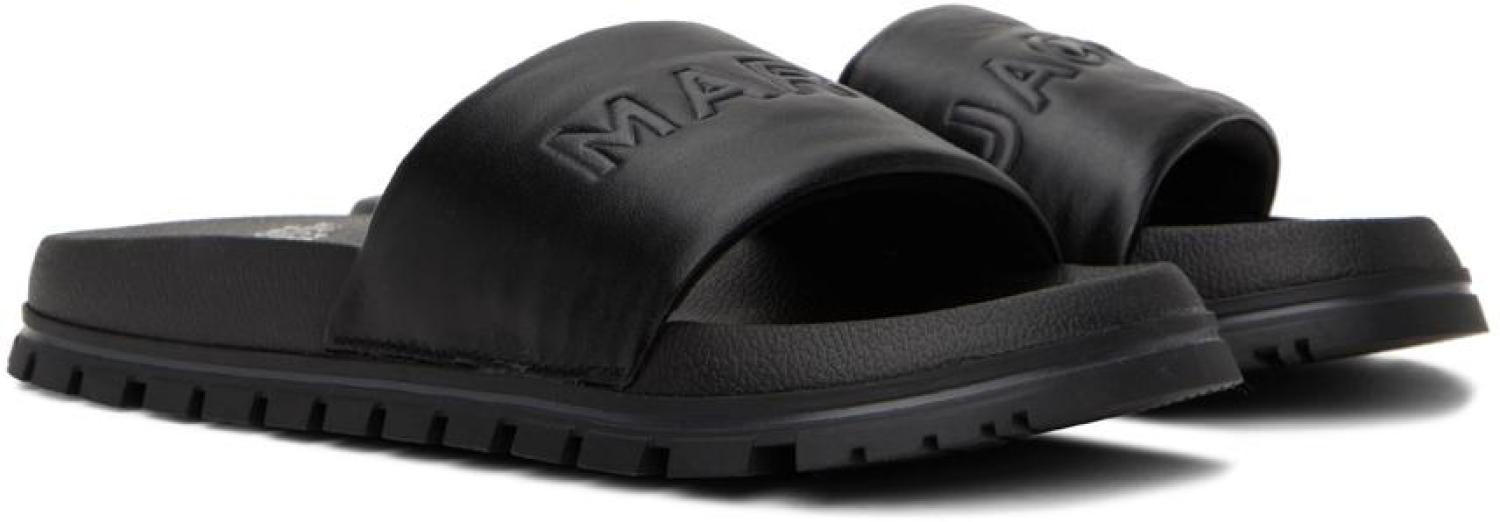 Marc Jacobs Black 'The Leather Slide' Sandals Grained leather slip-on flat sandals in black. · Open round toe · Logo embossed at vamp · Molded EVA rubber footbed · Treaded rubber sole Supplier color: Black Upper: leather. Sole: rubber. Made in Viet Nam. 232190F124008