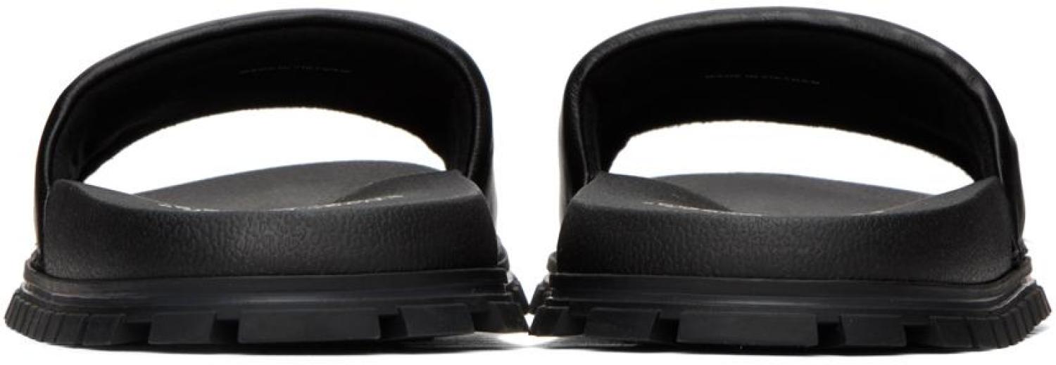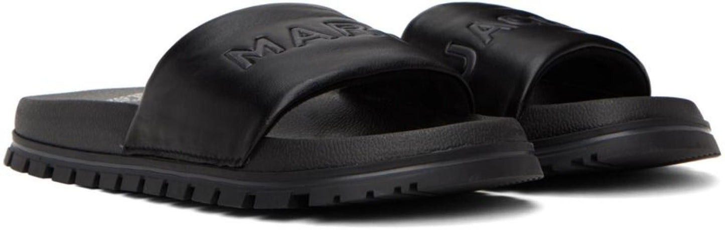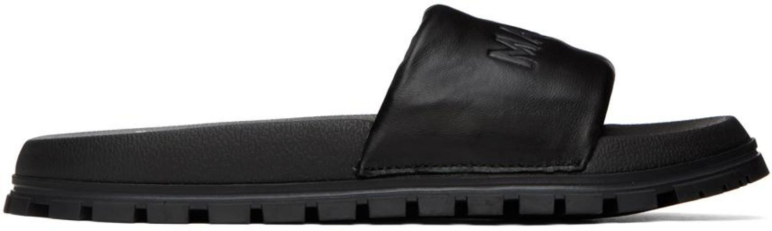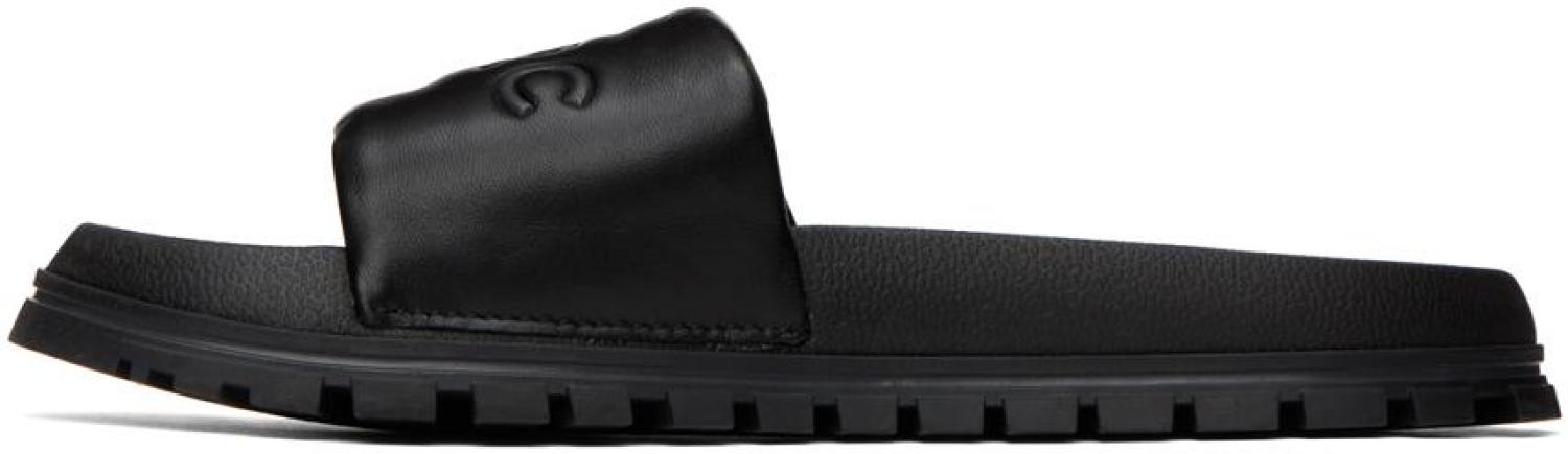 Padded grained leather slip-on sandals in black. Logo embossed at vamp.