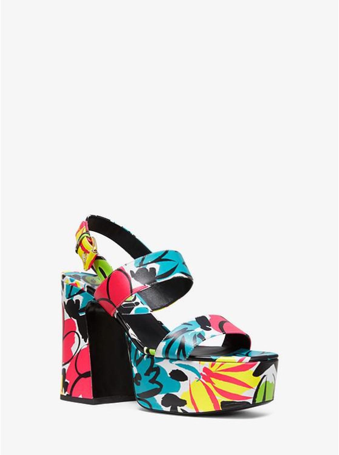 • Set on a soaring platform and block heel, the Blaire sandal is crafted in Italy from calf leather and printed with the season’s colorful florals. Wear them as a playful punctuation to daytime looks.
