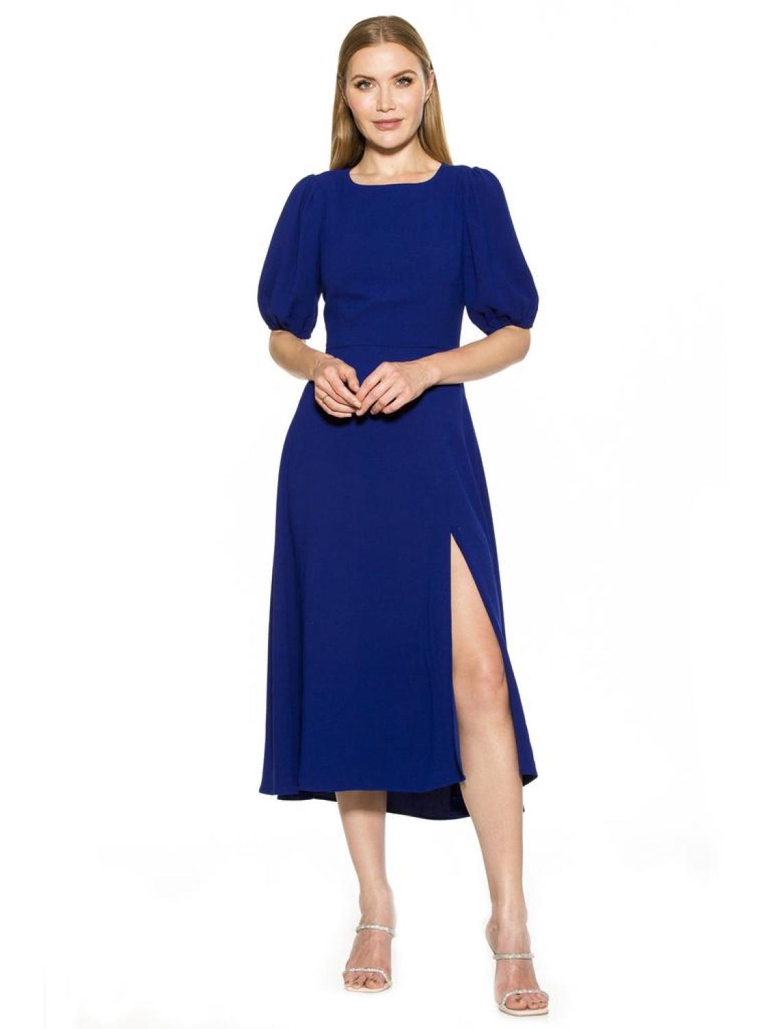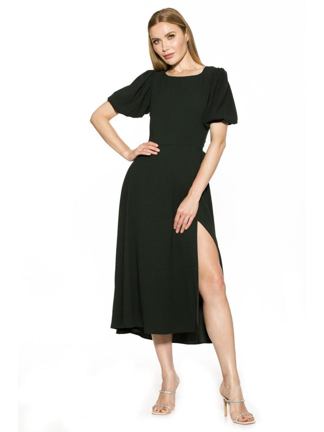 PRODUCT FEATURES Crew Neck?� Bubble Sleeve Leg Slit?� Midi Dress 100% Polyester Lining - 97% Polyester, 3% Spandex Machine Wash Imported Style D3939