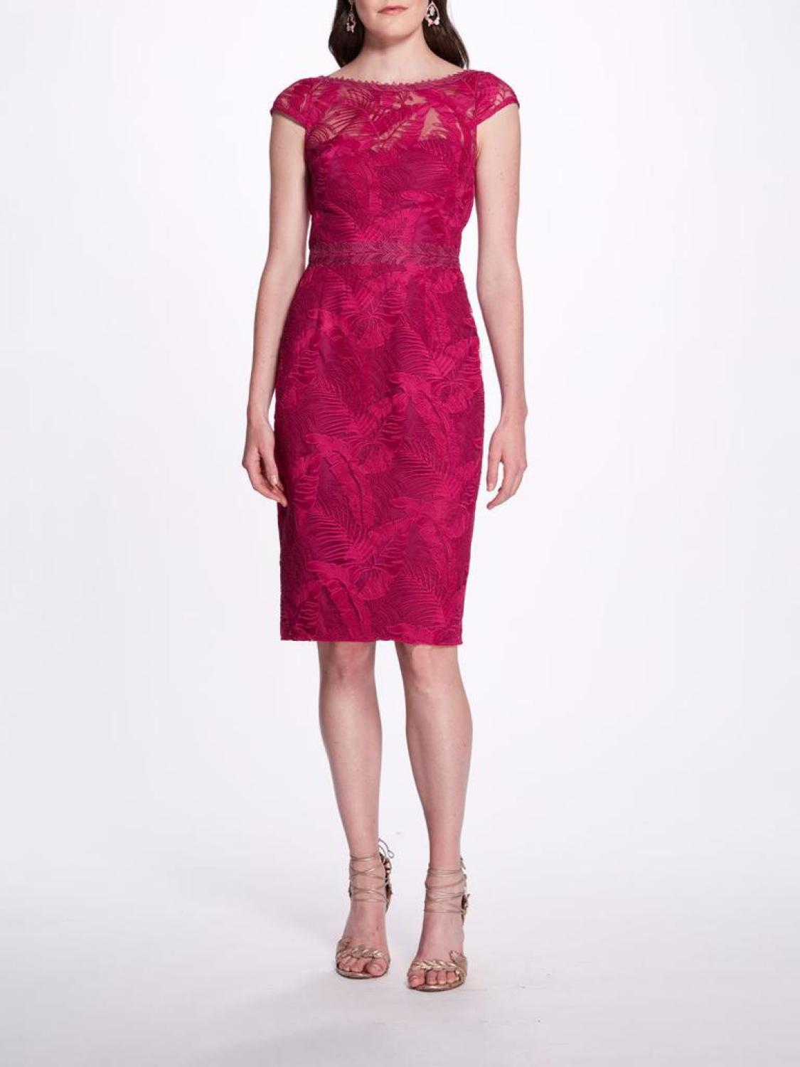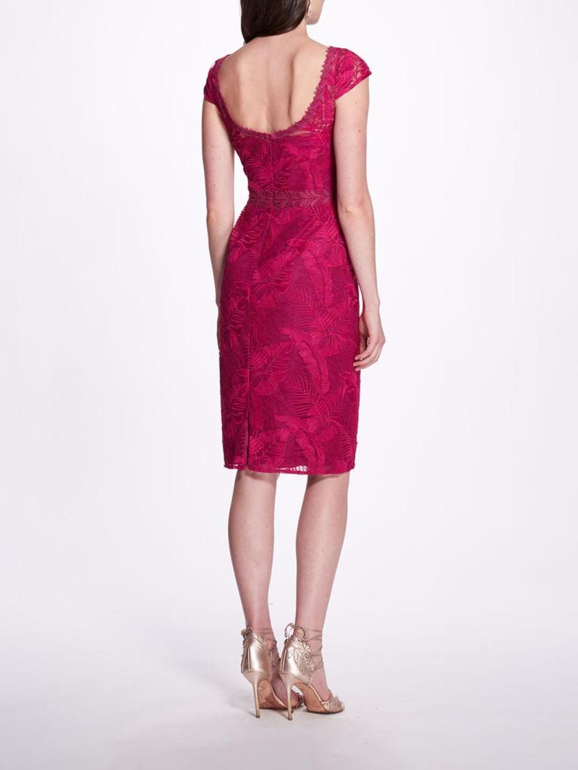 The charm of refinement, this cocktail dress in fuchsia features a cup-sleeve boat neckline, an A-line silhouette, and a tropical patterned lace.Model is wearing size US 0.