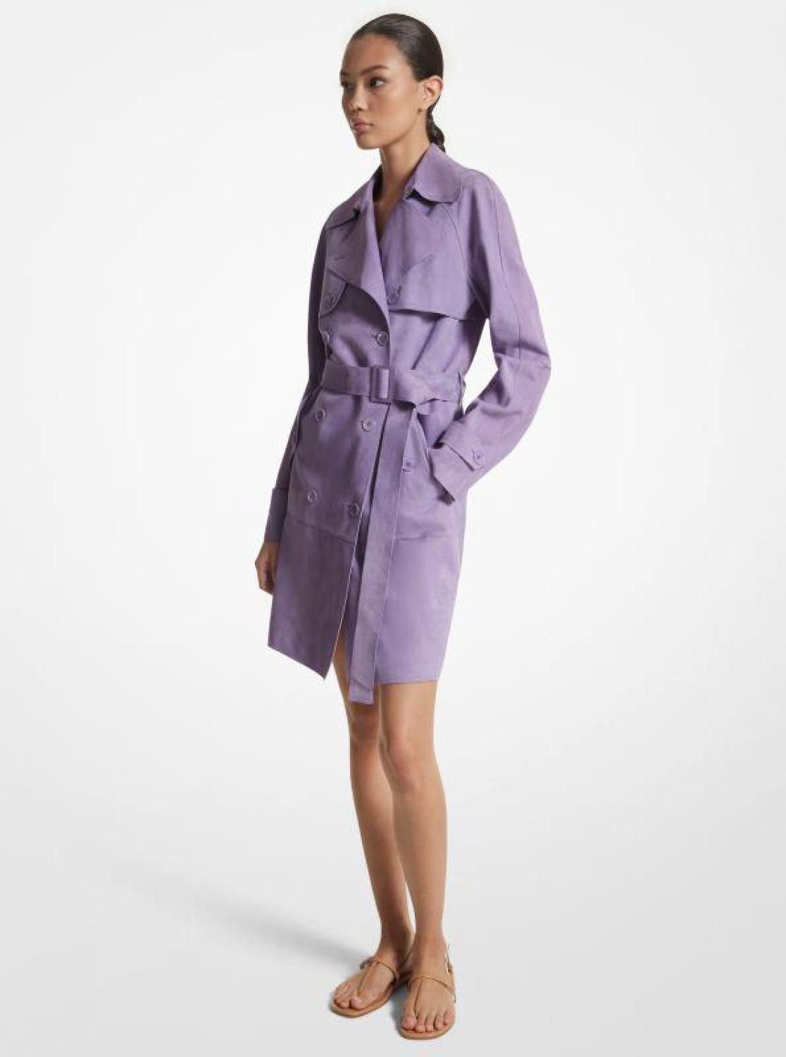 • The double-breasted trench coat is one of Michael’s favorite silhouettes, combining timeless, everyday sophistication with effortless style. This version is finely tailored in Italy from mid-weight bonded suede and dyed in the season’s Capri-inspired freesia hue. Emulate the runway styling with pulled-back hair and understated sandals.