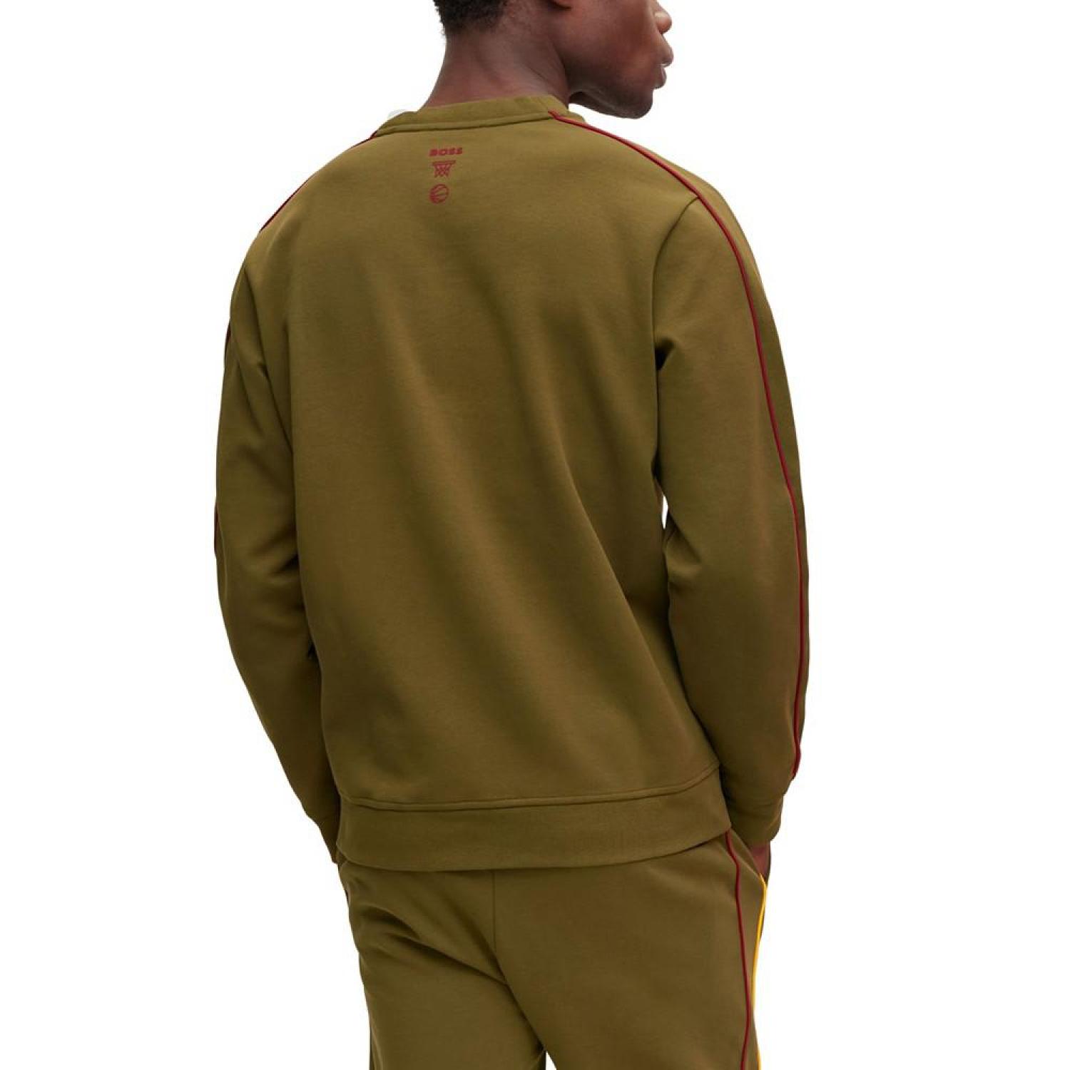 Sweatshirt by BOSS menswear. Featuring special labeling and contrast piping, this sporty sweatshirt is flock printed with BOSS x NBA artwork at the chest for colorful impact. Co-branded dynamic casualwear part of a limited-edition Capsule collection in collaboration with the NBA. Regular fit Neckline- crew neck Long sleeves Ribbed cuffs Standard length Washing type- machine wash cold gentle, do not bleach, iron low heat, do not dry-clean, do not tumble dry, additional- wash, iron inside out, hang to dry, do not iron print The model is a size medium and is 6'2" tall with a, 38" chest, 29" waist and 36" hips Cotton, Polyester, Elastane Machine Washable Imported