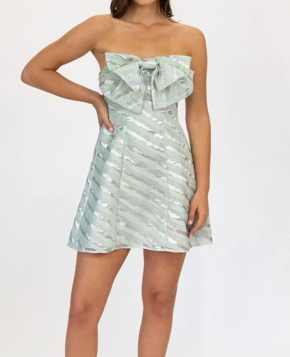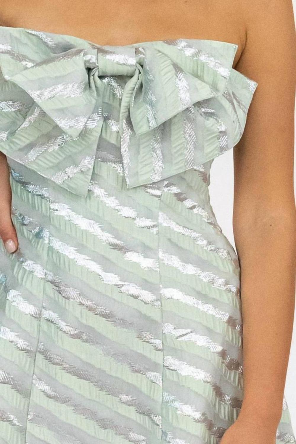 • A strapless dress so versatile you can dress it up with heels or wedges, or give off a more casual vibe with flats. Short and sweet, this strapless fit and flare dress has an oversized bow in the front and ruching in the back. Ruching in the back Side zip Hand wash 60% Nylon, 40% Polyester Lining - 100% Polyester Imported