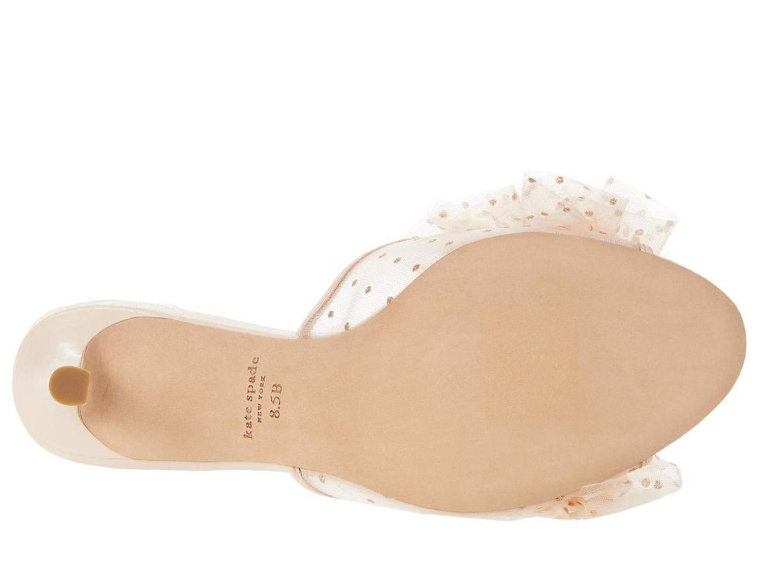 All eyes will be on your fancy feet with the Kate Spade New York® Bridal Sparkle. These heels are crafted with a suede upper, and feature polka dot tulle and a bow detail for an elevated finish. Open toe. Adjustable strap with buckle closure. Leather lining. Lightly padded footbed. Wrapped heel. Leather sole. Imported. Product measurements were taken using size 8.5, width B - Medium. Please note that measurements may vary by size. Measurements: Heel Height: 3 in Weight: 7 oz-