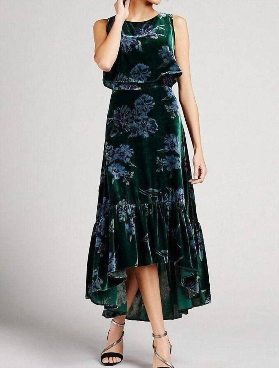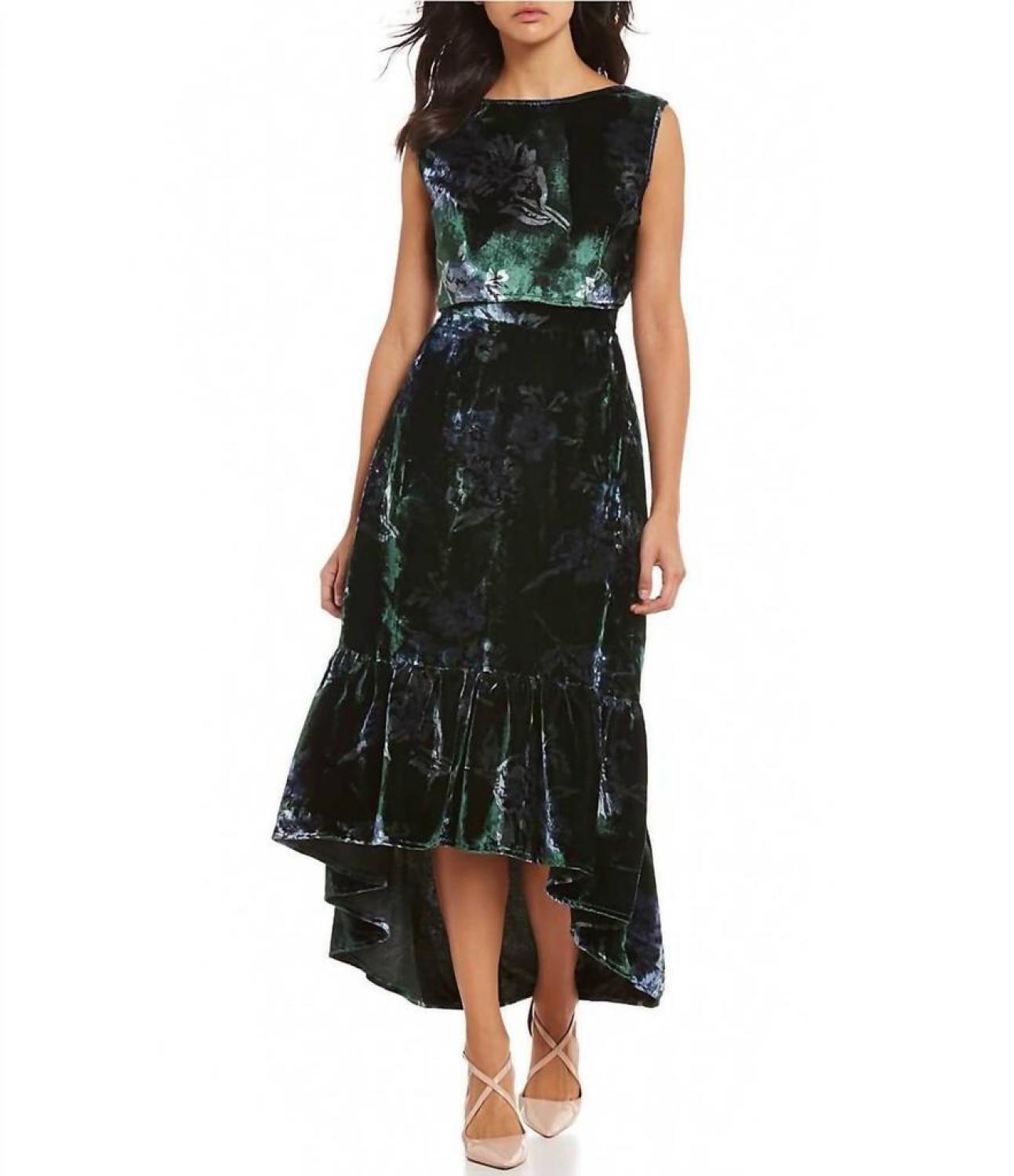 A cool twist on a classic style dress.Maxi, high low dress with flutter layer over bodice and ruffle at hem. In a rich green velvet with blue floral print. High low front hem styling. Ruffled/flounced, Blouson styling. Center back zipper with closure. Sleeveless. Rounded neckline. 60% Viscose 40% Polyester;. Lining - 100% Polyester. Dry clean. Imported