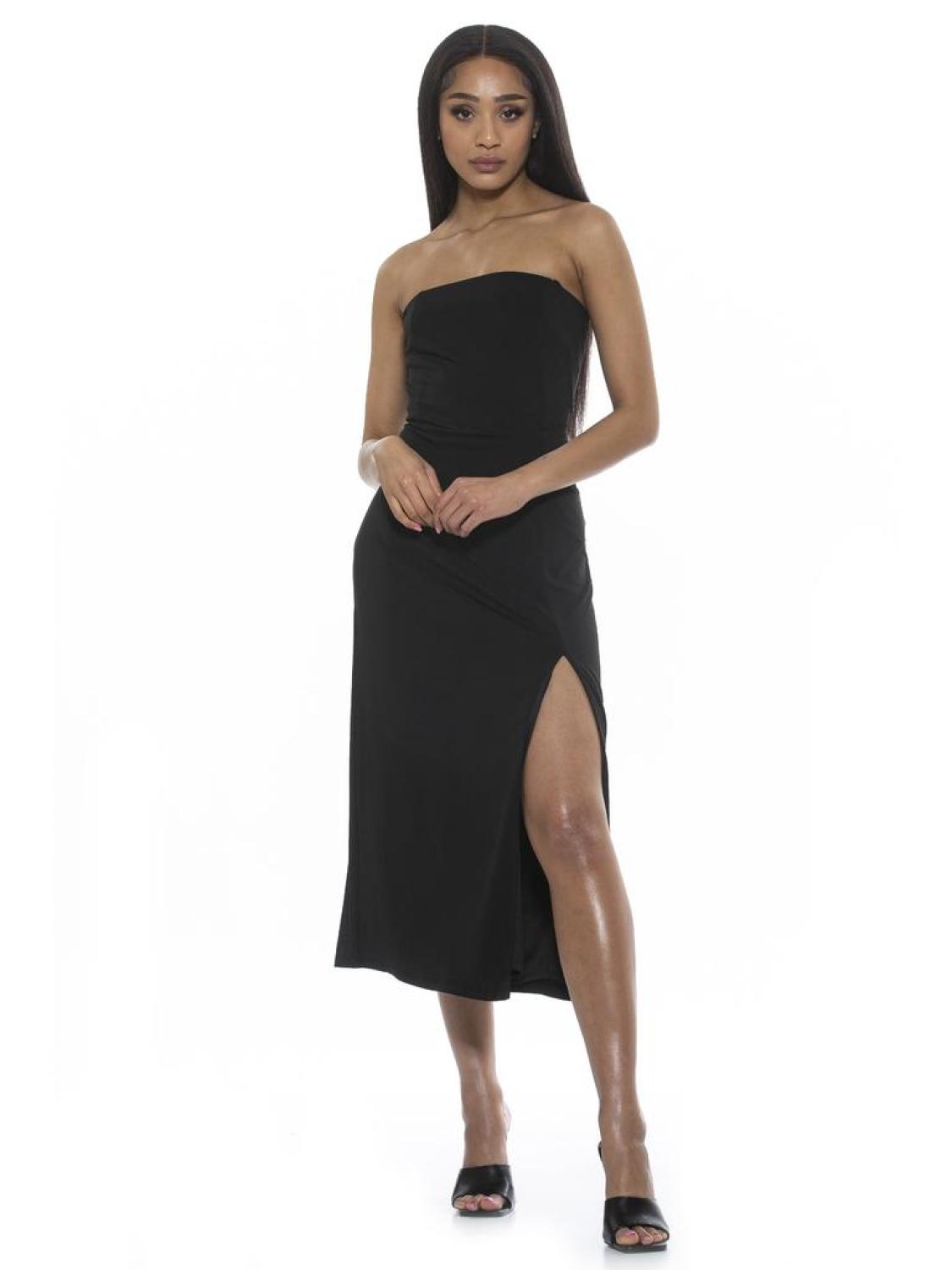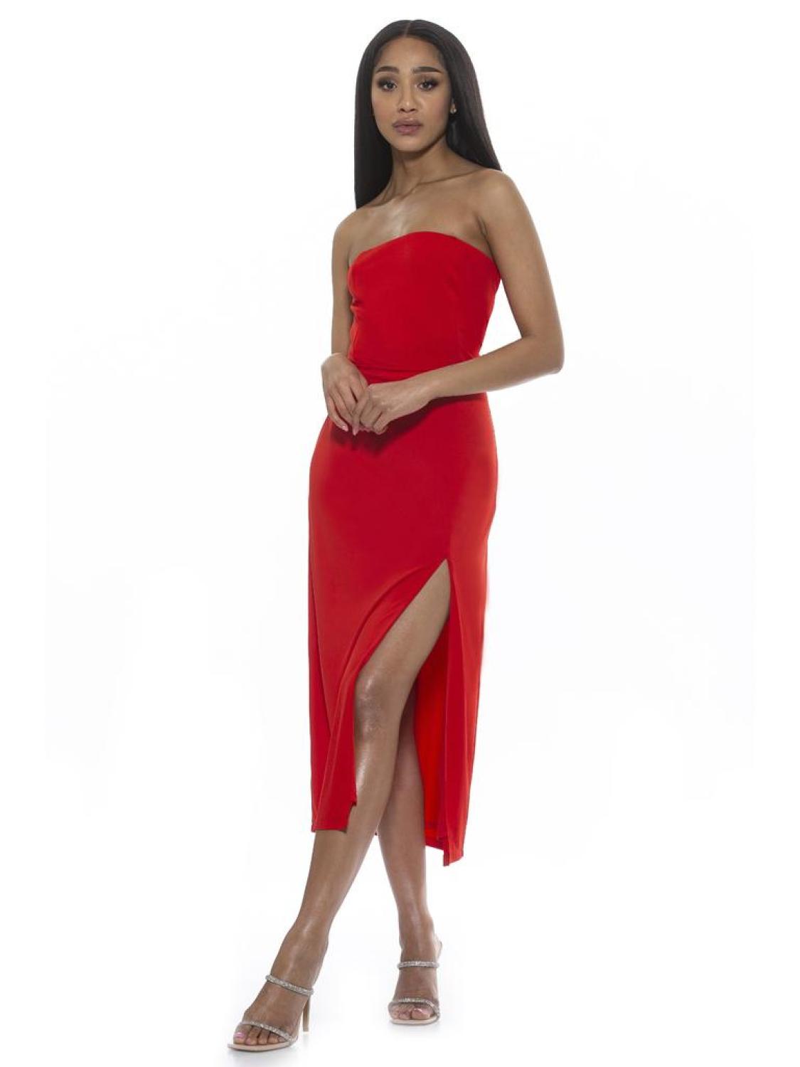 Let your legs out for a bit. The Camden is a sleeveless, midi dress with a side slit, straight neckline, and a fitted waist.PRODUCT FEATURES Strapless top?� High Slit?� Midi dress 95% Polyester, 5% Spandex Lining - 100% Polyester Machine Wash Imported Styles D3997