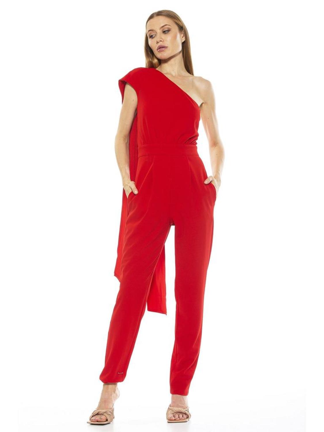 • PRODUCT FEATURES Asymmetric shoulder One shoulder cape Pleated slim pants Invisible back zipper 95% Polyester, 5% Spandex Lined - 100% polyester Machine wash cold Line dry Imported Style D2771