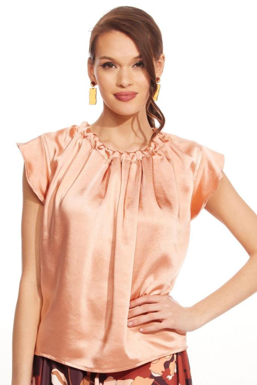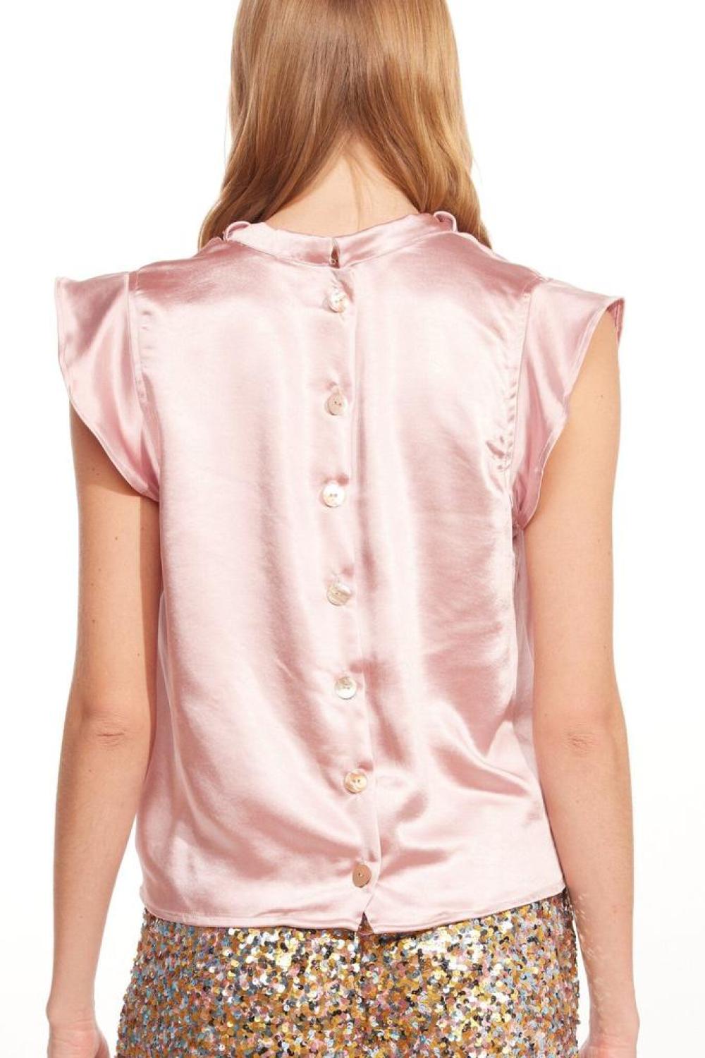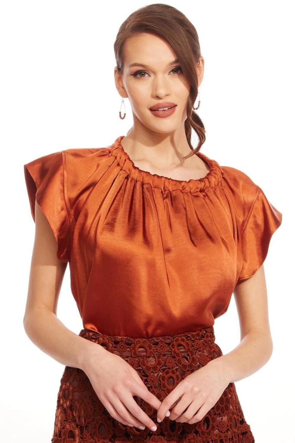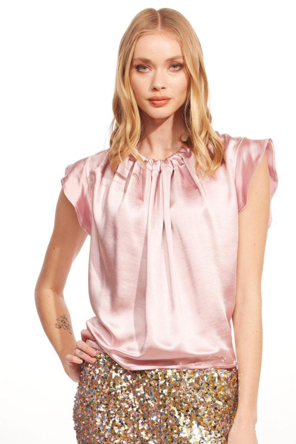 The Cara top is satin gathered neck style that buttons in the back. Cap sleeves Gathered neckline Back button closure