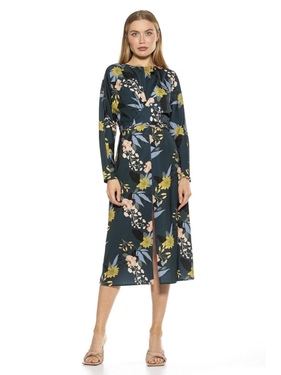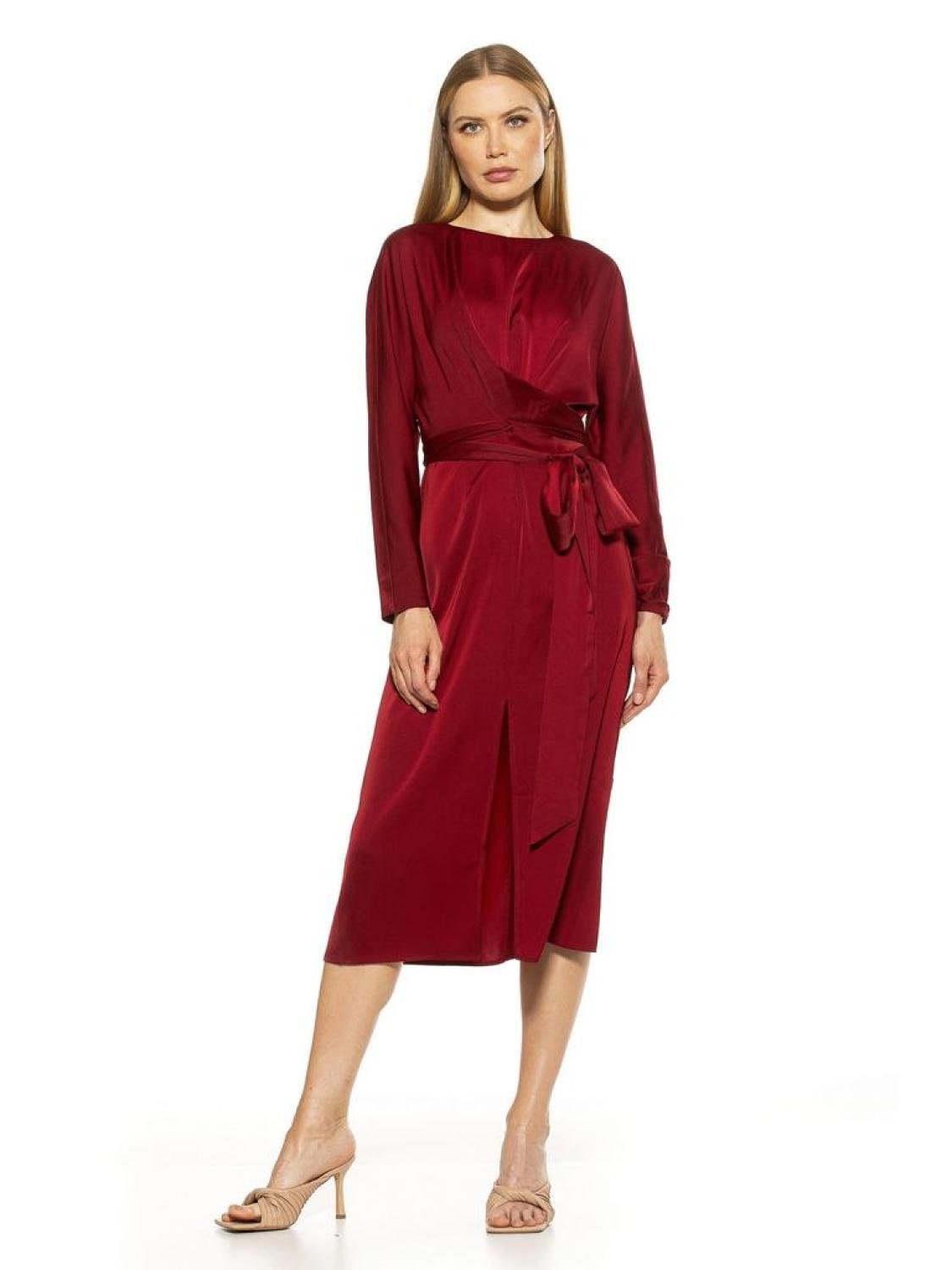 PRODUCT FEATURES Crew neck Long sleeves Hidden back-zip closure Draped bodice design Tie Waist Leg Slit?� Midi length 97% Polyester, 3% Spandex Lined - ?�97% Polyester, 3% Spandex Machine wash, line dry Imported Style D3841