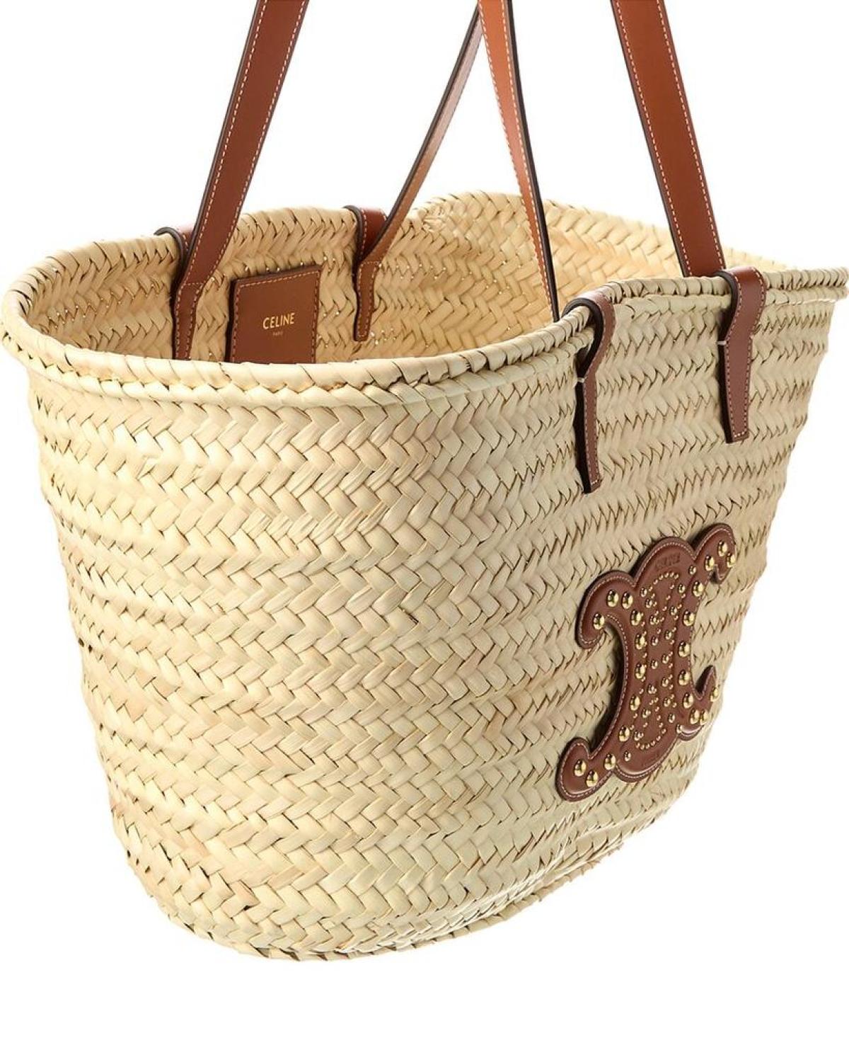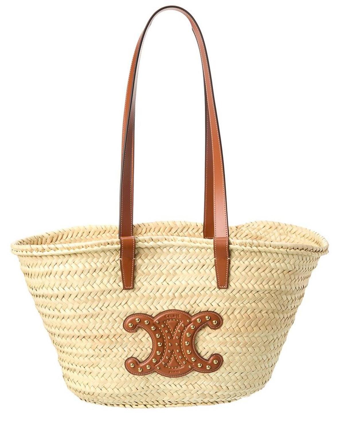• Introducing the CELINE Triomphe Palm Leaves & Leather Tote, the epitome of classic, coveted Parisian chic. Expertly crafted in Italy, this stunning tote showcases a combination of tan palm leaves and calfskin, adorned with gold-tone hardware and a studded logo patch for a sophisticated touch.Designed with your convenience in mind, the interior of this tote is unlined, providing a spacious compartment for all your essentials. Measuring 10 inches wide, 10 inches high, and 6 inches deep, it offers ample room without compromising on style.The top handles of this tote have a generous 13-inch drop, allowing for comfortable shoulder or hand carry. Whether you're heading to the office, running errands, or going out for a casual outing, this tote is the perfect companion to elevate your look.Please note that all measurements were taken by hand and are approximate; slight variations may occur, adding to the uniqueness and charm of each piece.Rest assured that our products are 100% genuine. While in some cases we may source merchandise from trusted independent suppliers, not directly from the brand owner, we guarantee the authenticity of every product sold on our site. Shop with confidence and experience the luxury of CELINE with this Triomphe Palm Leaves & Leather Tote.