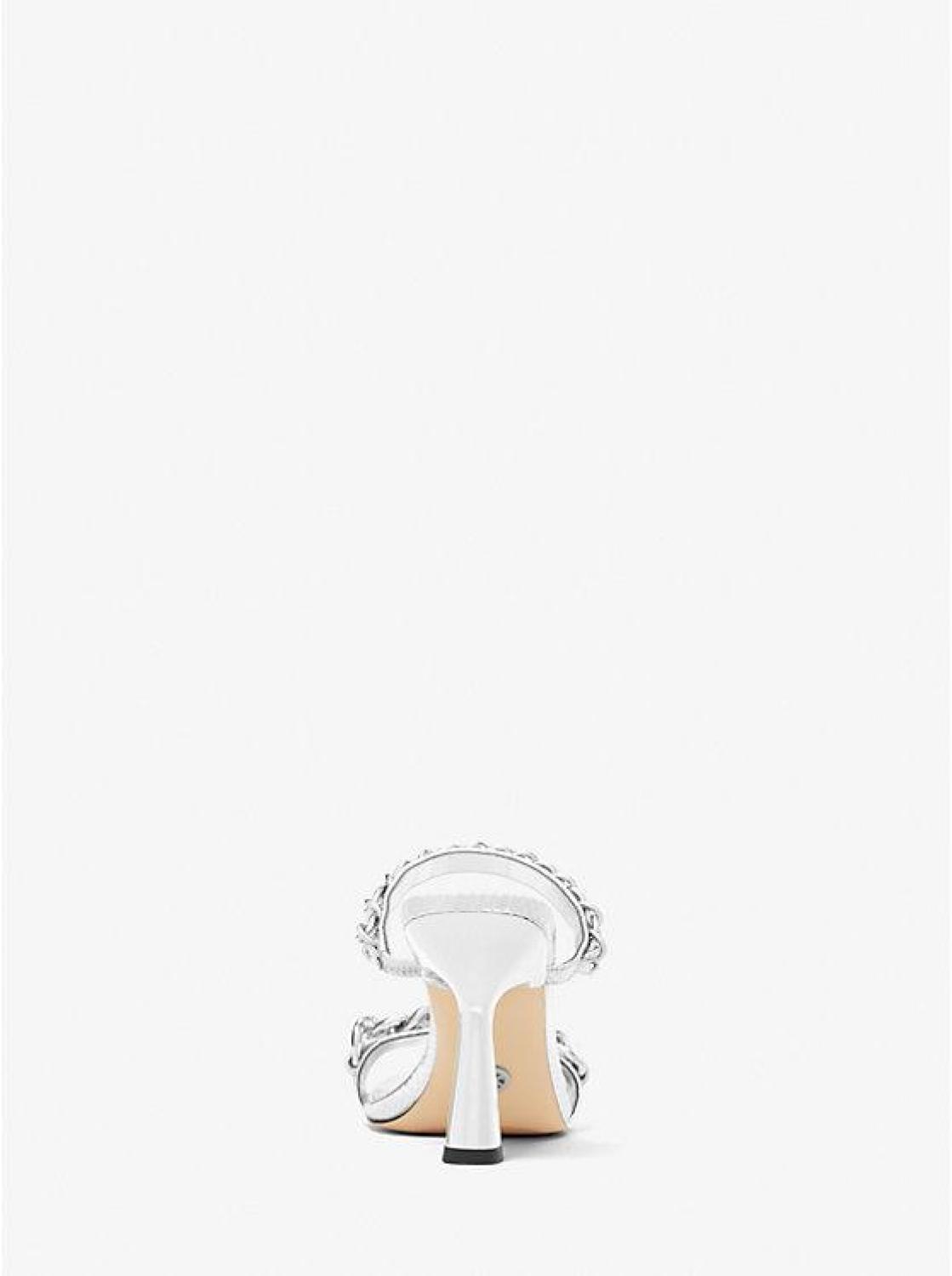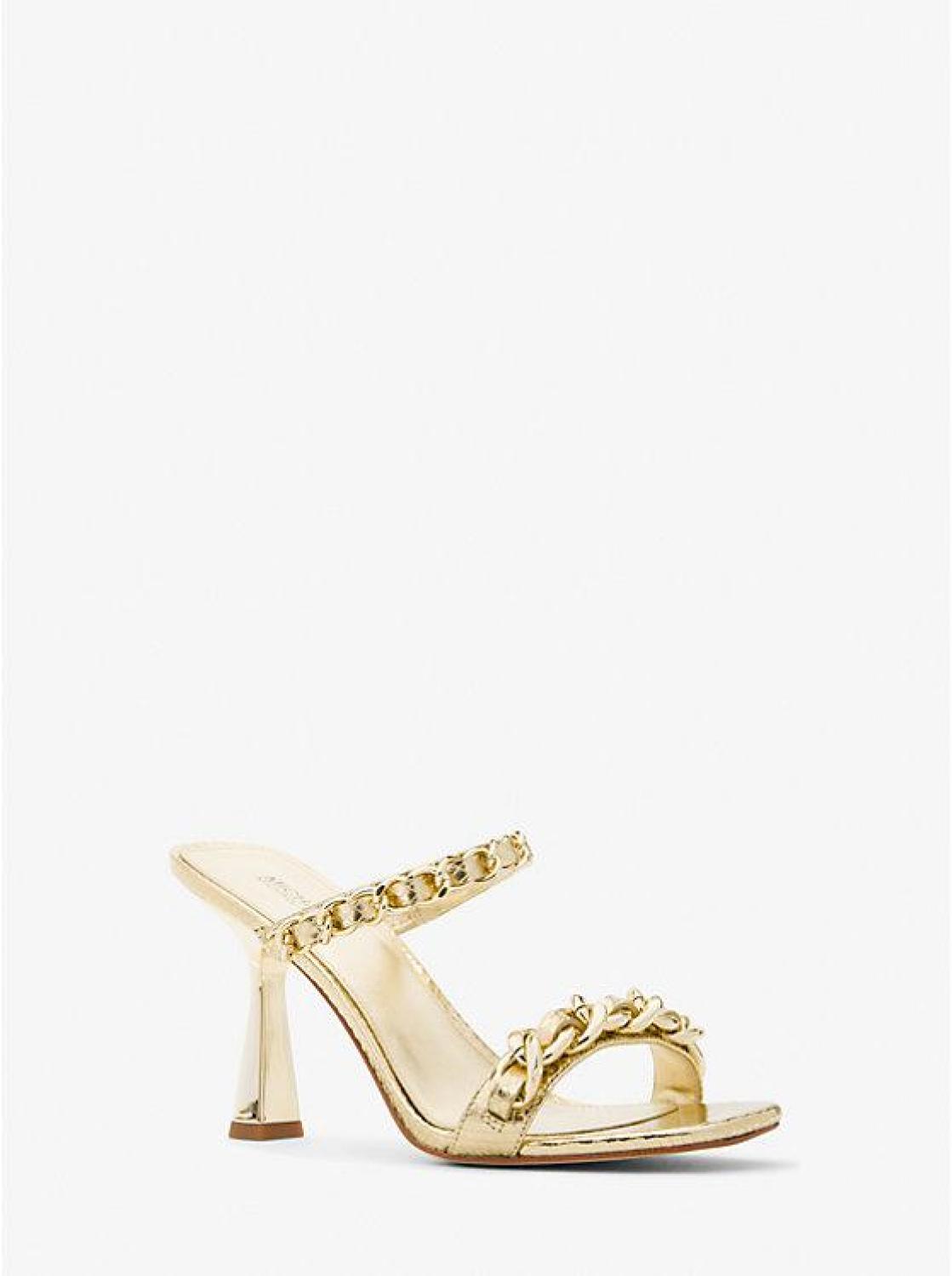 • Polished chain-link detailing lends a luxe look to our Clara sandal. This metallic pair is defined by a snake-embossed finish and is set on a fluted heel for added flair. Wear it on evenings when you want to be comfortable and glamorous.