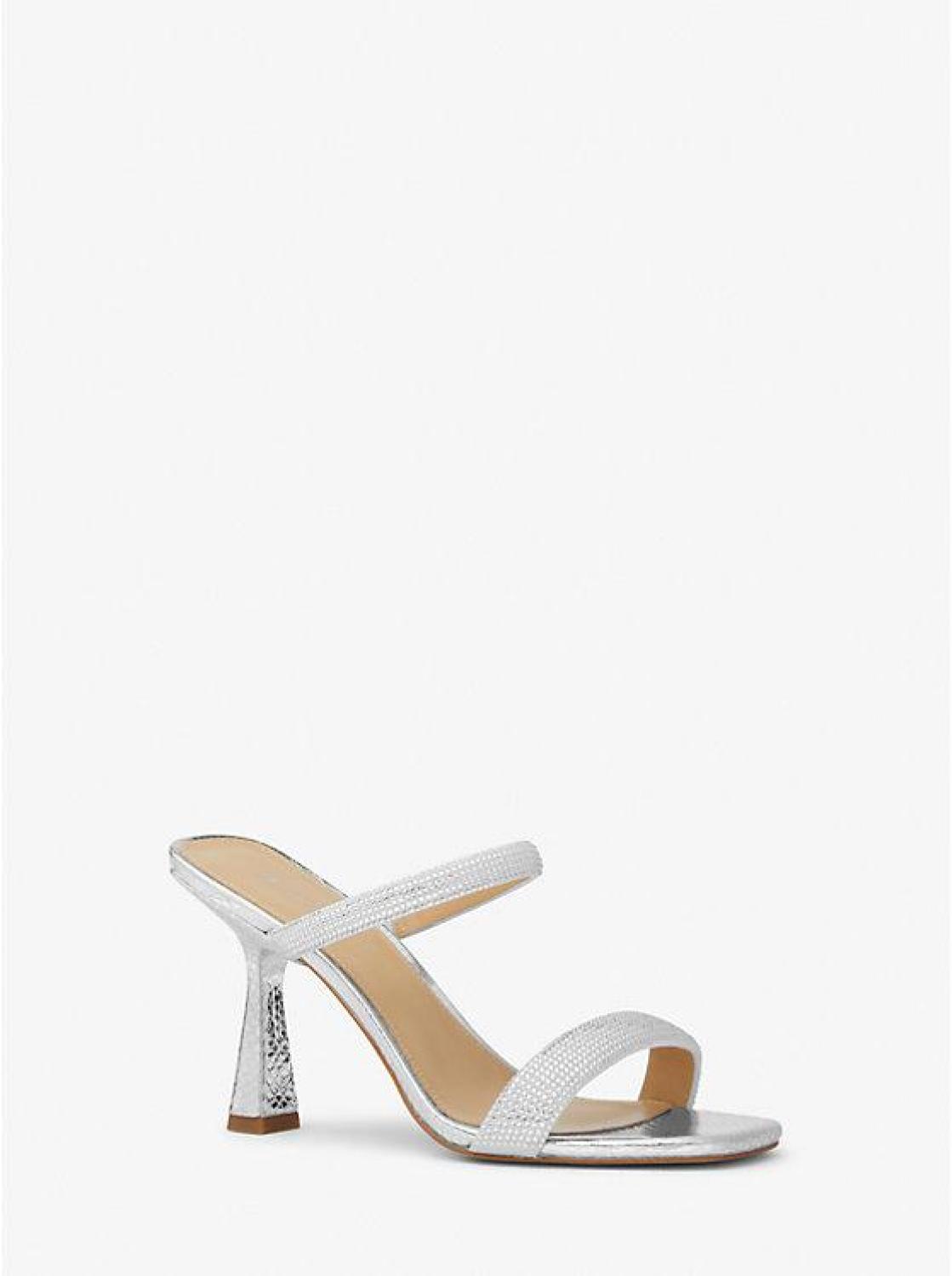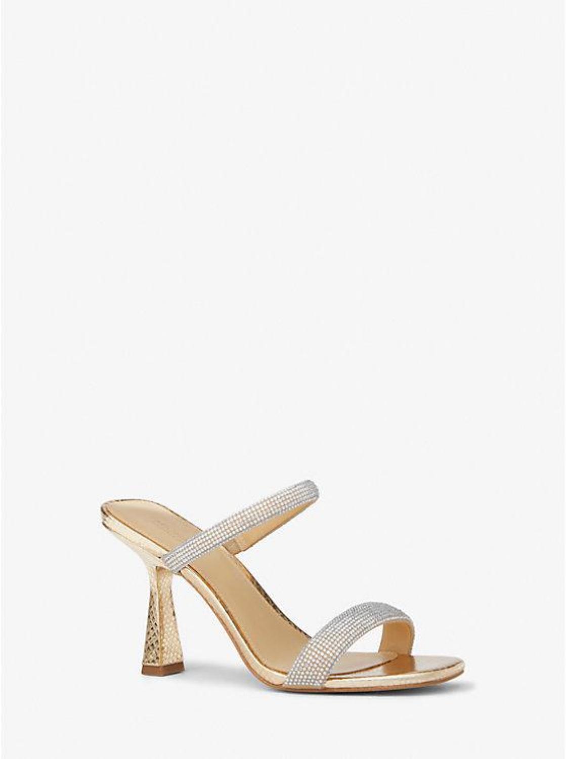 • Light-catching crystal embellishments lend a shimmering boost to our Clara sandal. This metallic pair is defined by a snake-embossed finish and is set on a fluted heel for added glamour. Wear it on evenings when you want to be comfortable and glamorous.