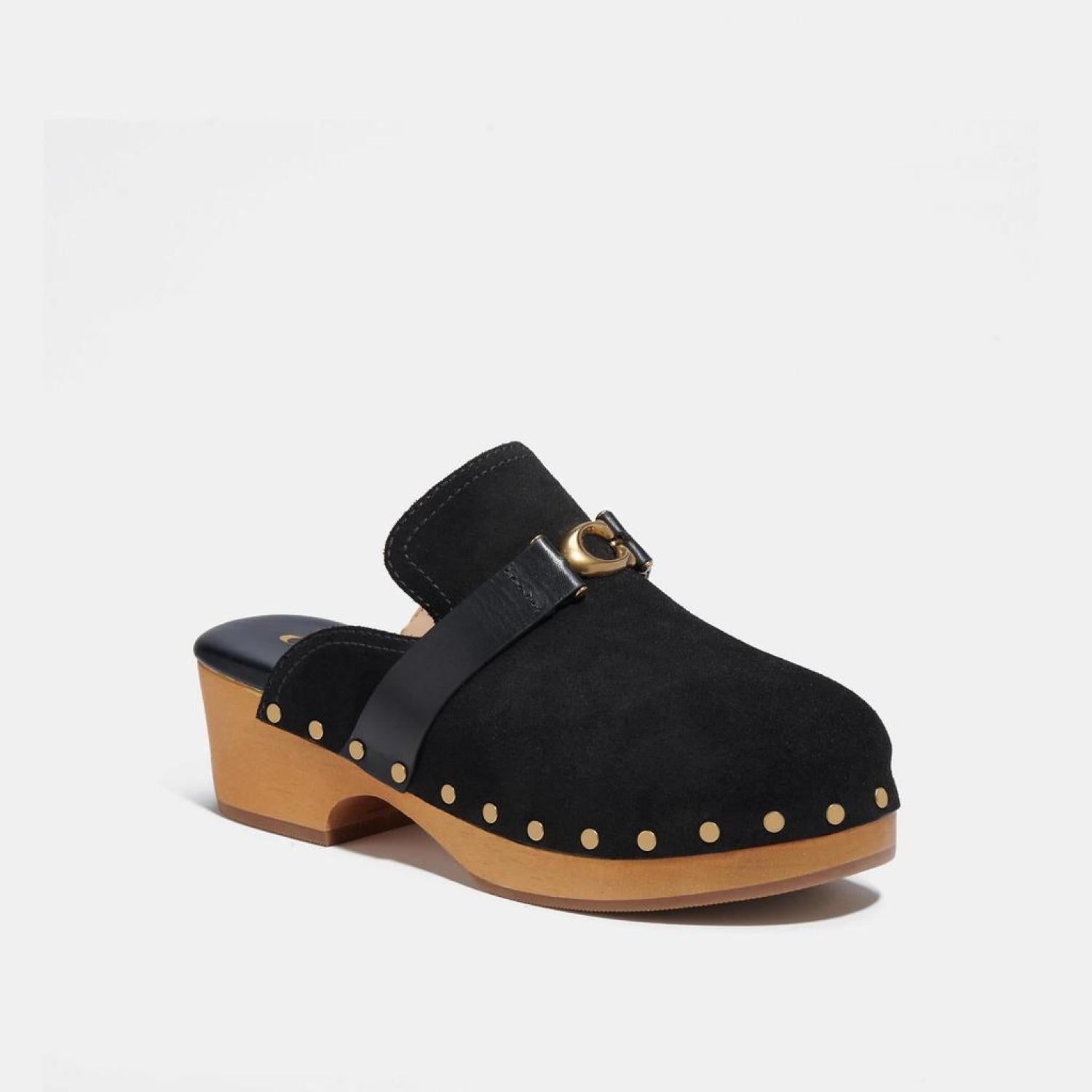 Suede and leather upper Man-made leather lining and footbed Rubber outsole Slip on 2 heel Style No. CB934 | Coach Outlet Finlay Clog - Black, Size - 9