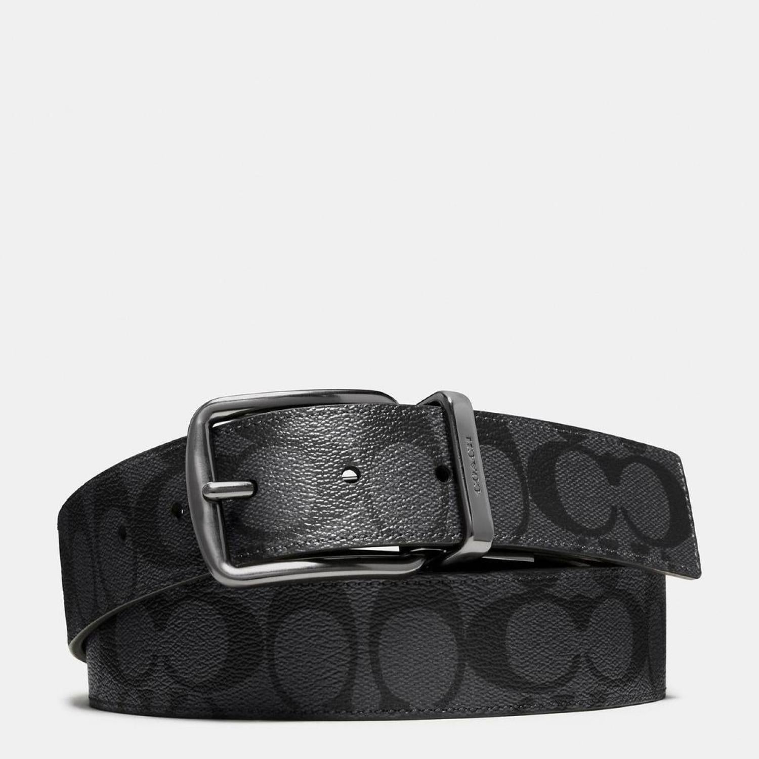 • Signature coated canvas and refined calf leather Cut-to-size Reversible 38mm (W) Style No. 64839 | Coach Outlet Harness Buckle Cut To Size Reversible Belt, 38 Mm - Grey